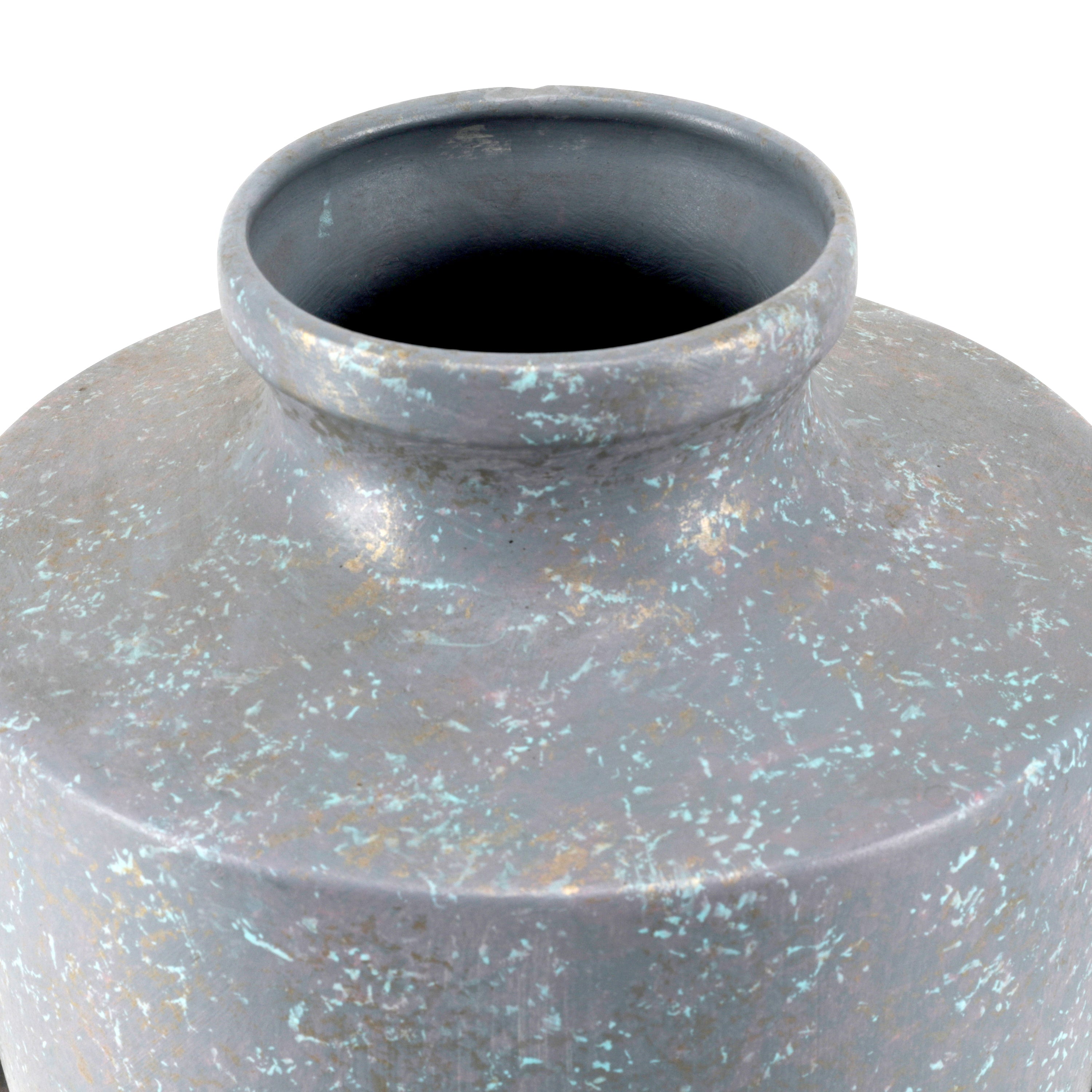 Details: Round round ceramic vase with blue and green drip glaze Dimensions: 4" H x 5" D