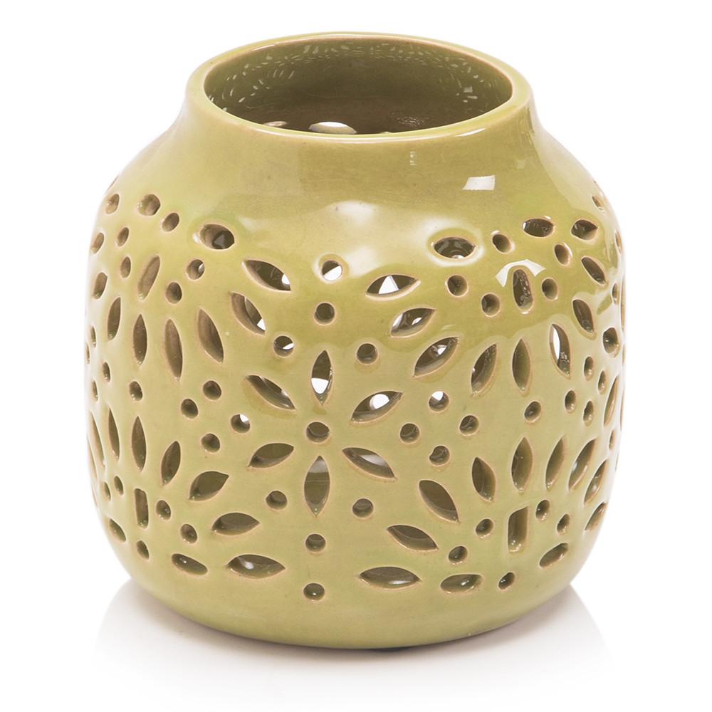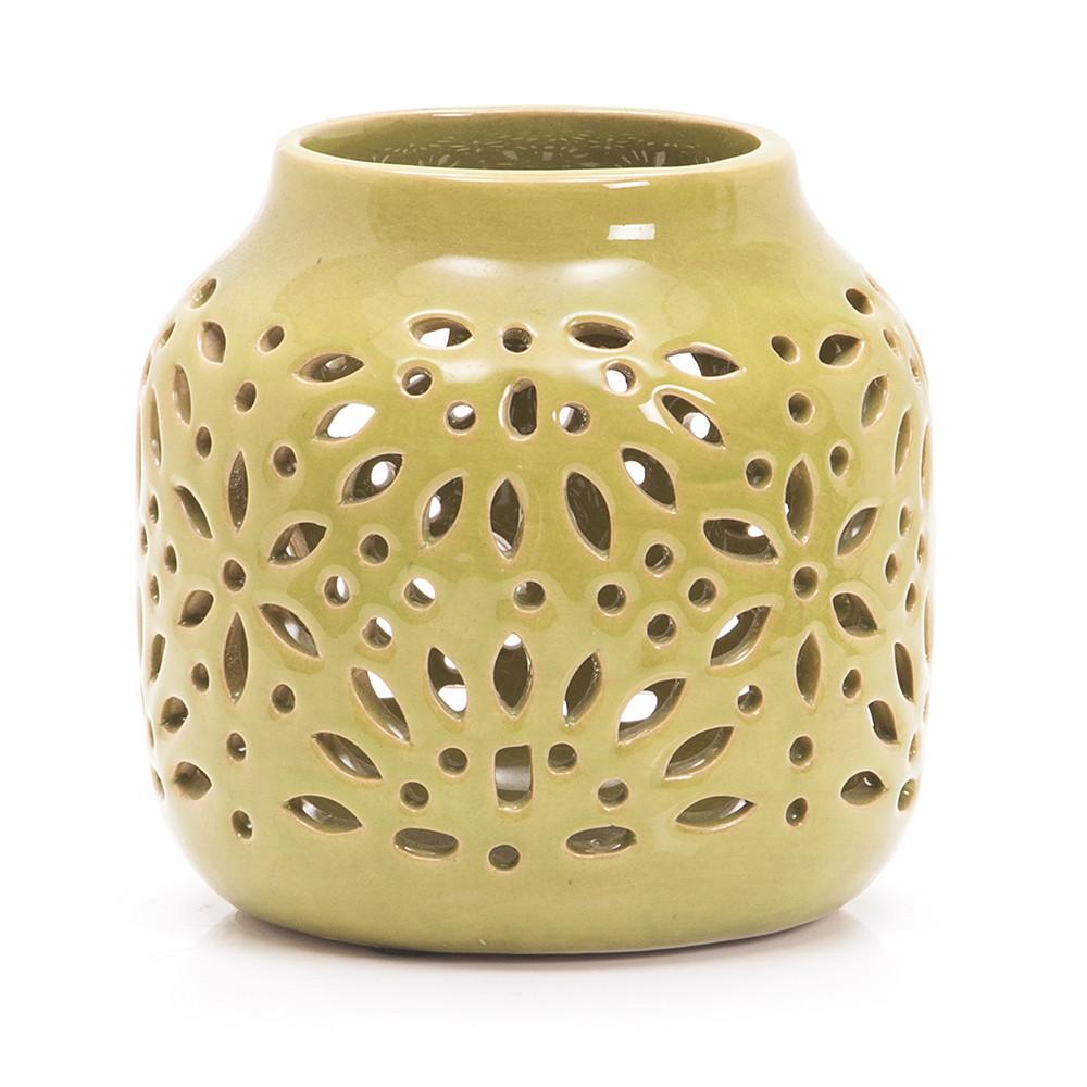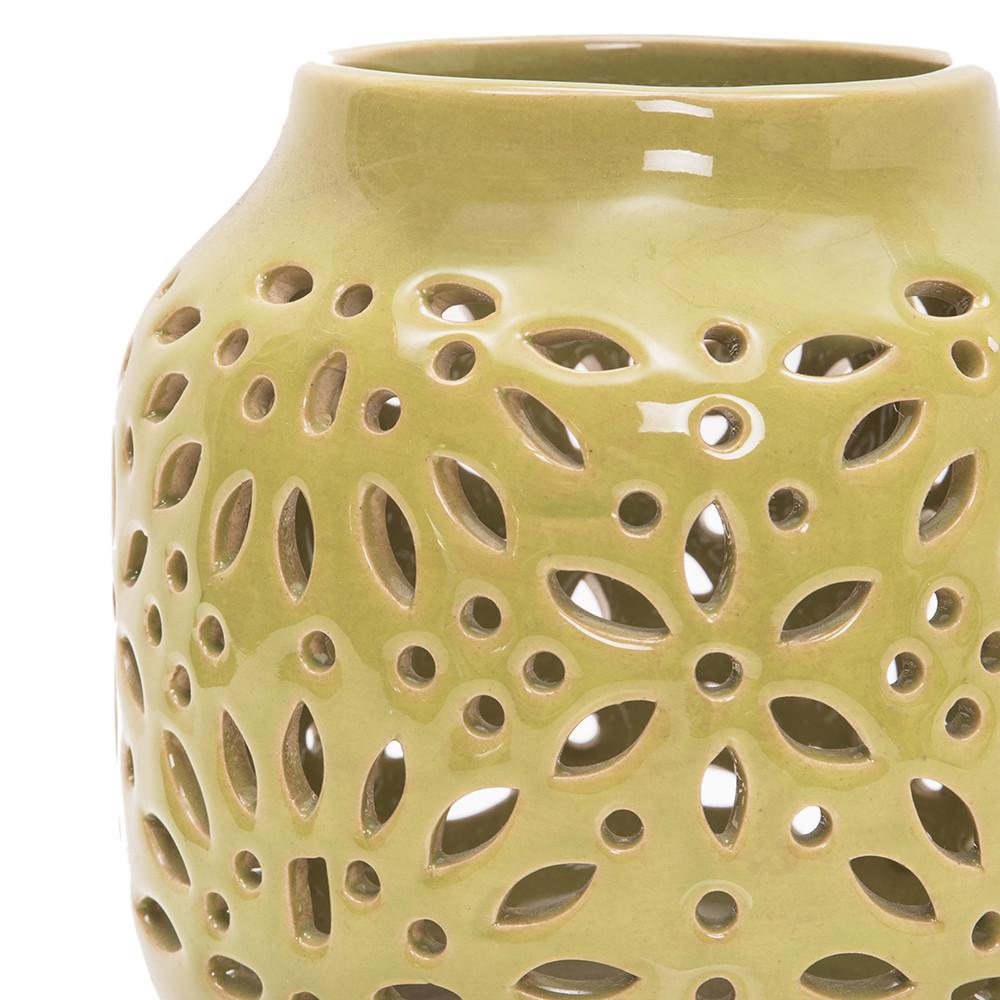 Details: Green ceramic vase with floral perforation. Dimensions: 7" H x 6.5" W x 6.5" D
