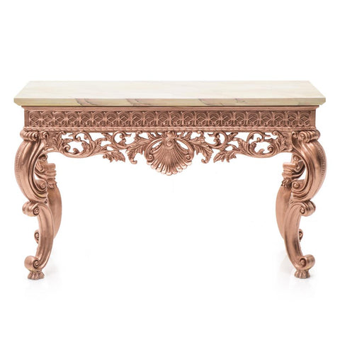 Details: Rose Gold Rococo Console Table with Off-White Faux Marble Top Dimensions: 31" H x 21" W x 51" D
