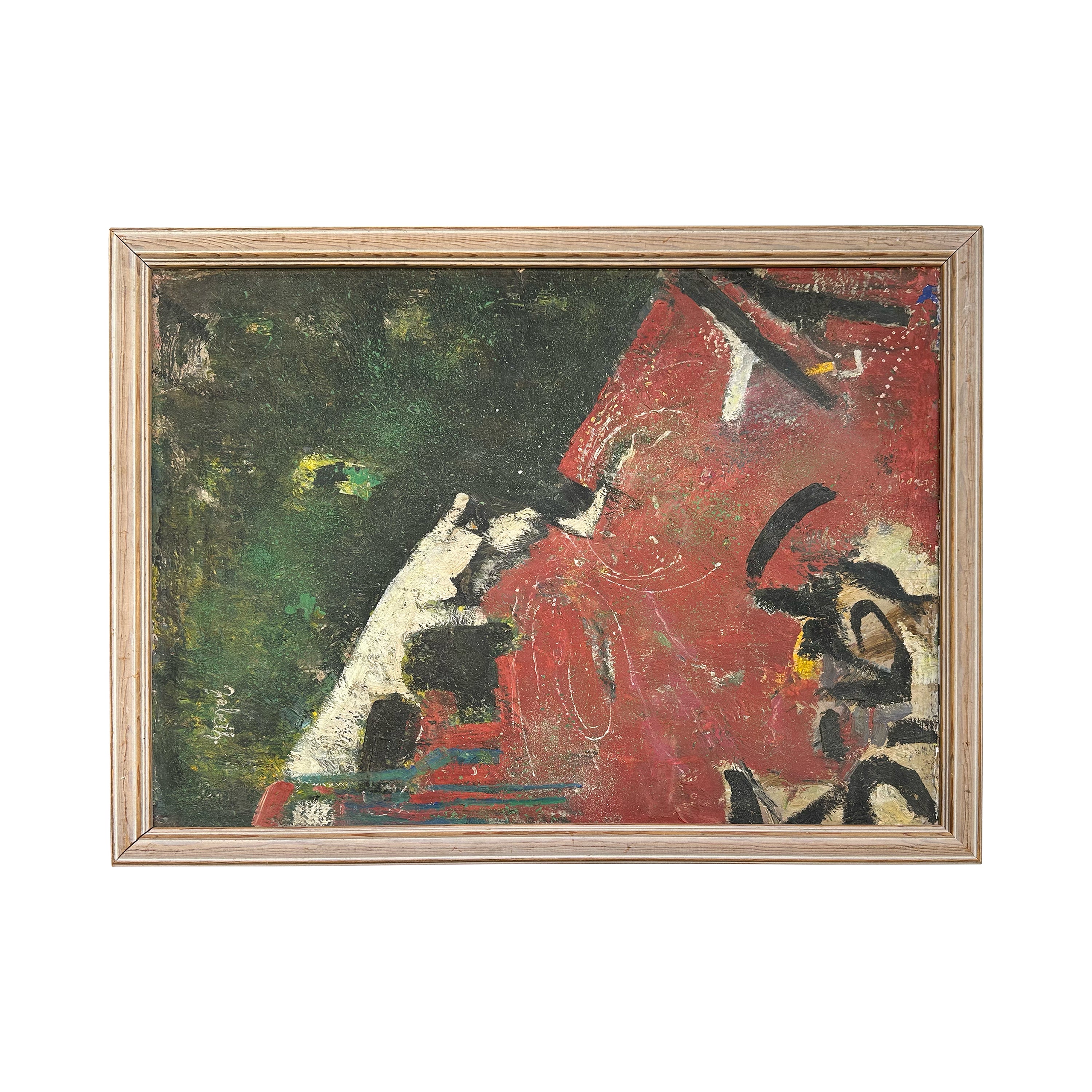 Details: Still life painting of a magnolia branch with blooming flowers propped up in a small bowl in a green frame Dimensions: 13" H x 11"...