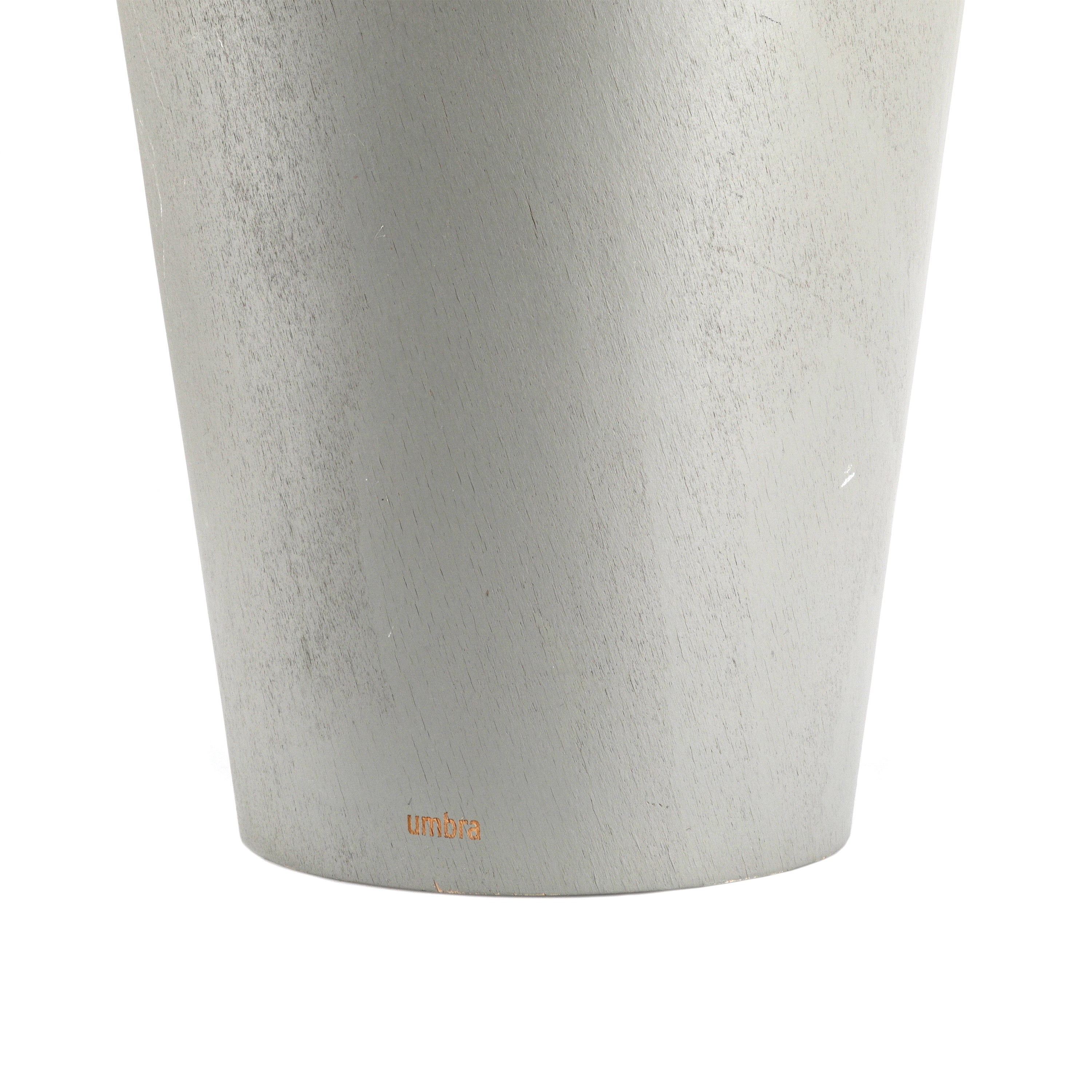 Details: Small wooden trash receptacle with grey exterior and wood grain interior. Dimensions: 11" H x 9" D