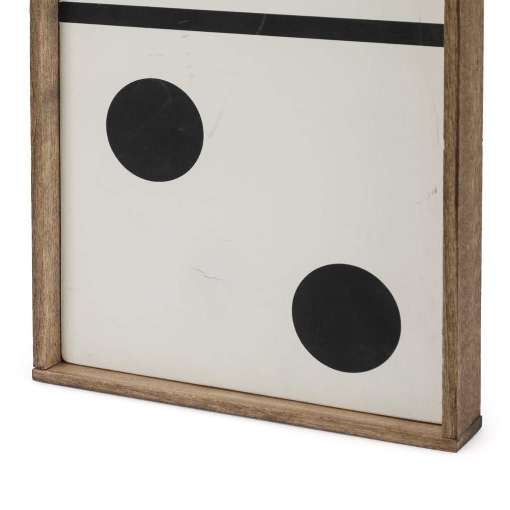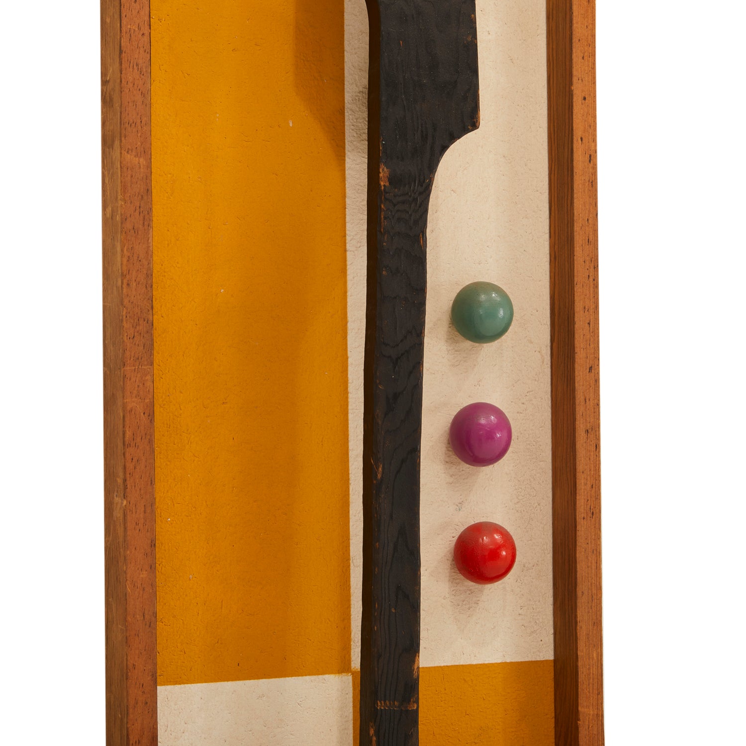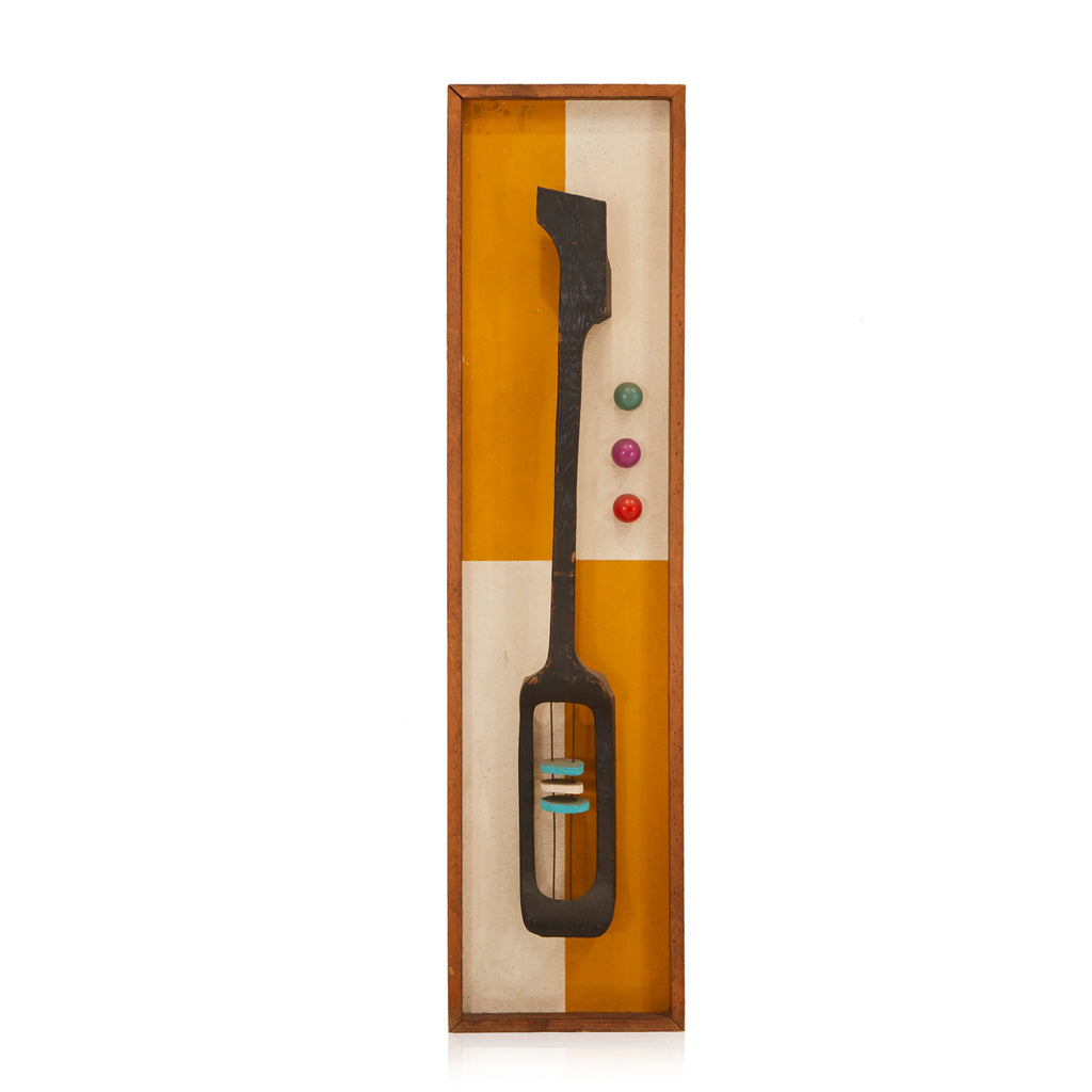 Details: Abstract wall sculpture of a wooden guitar with white and yellow checkered background, three spheres, and white and blue circular ornamentation Dimensions: 48" H x 12"...