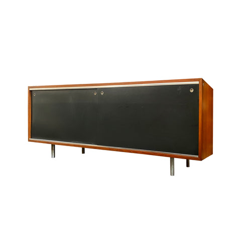 Details: Modular wooden desk and credenza combo. Desktop rests on credenza and can be configured in an L shape or straight. Credenza features black perforated...