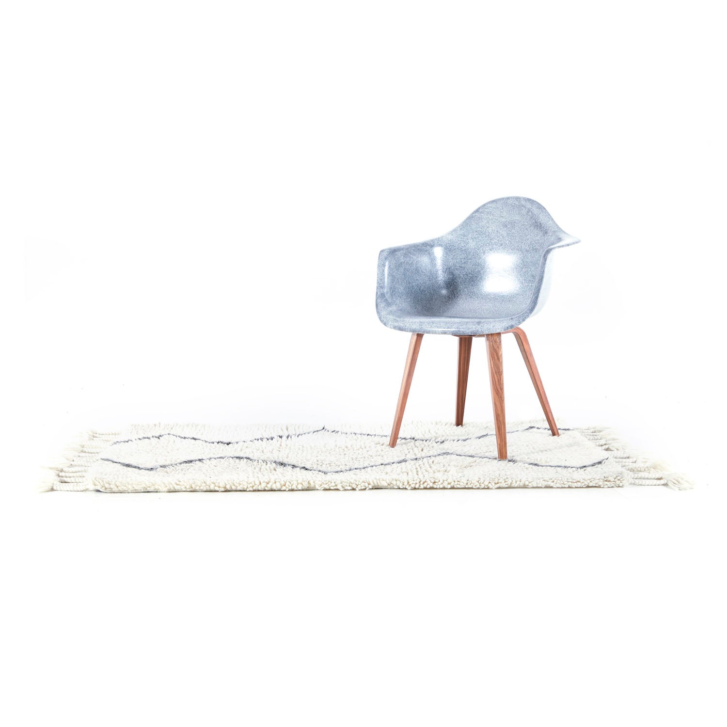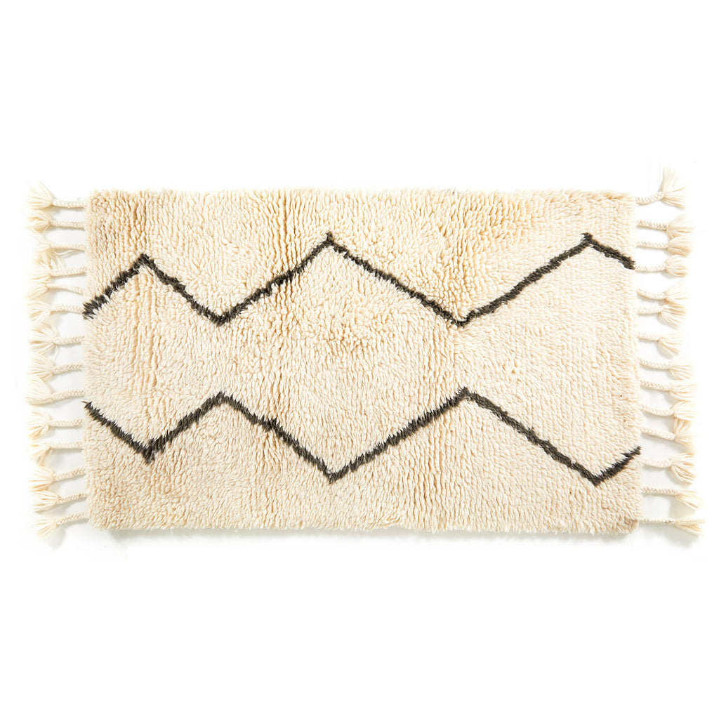 Details: White wool rug with black zig-zag design and knotted tassels Dimensions: 73" W X 39" D Quantity: 1