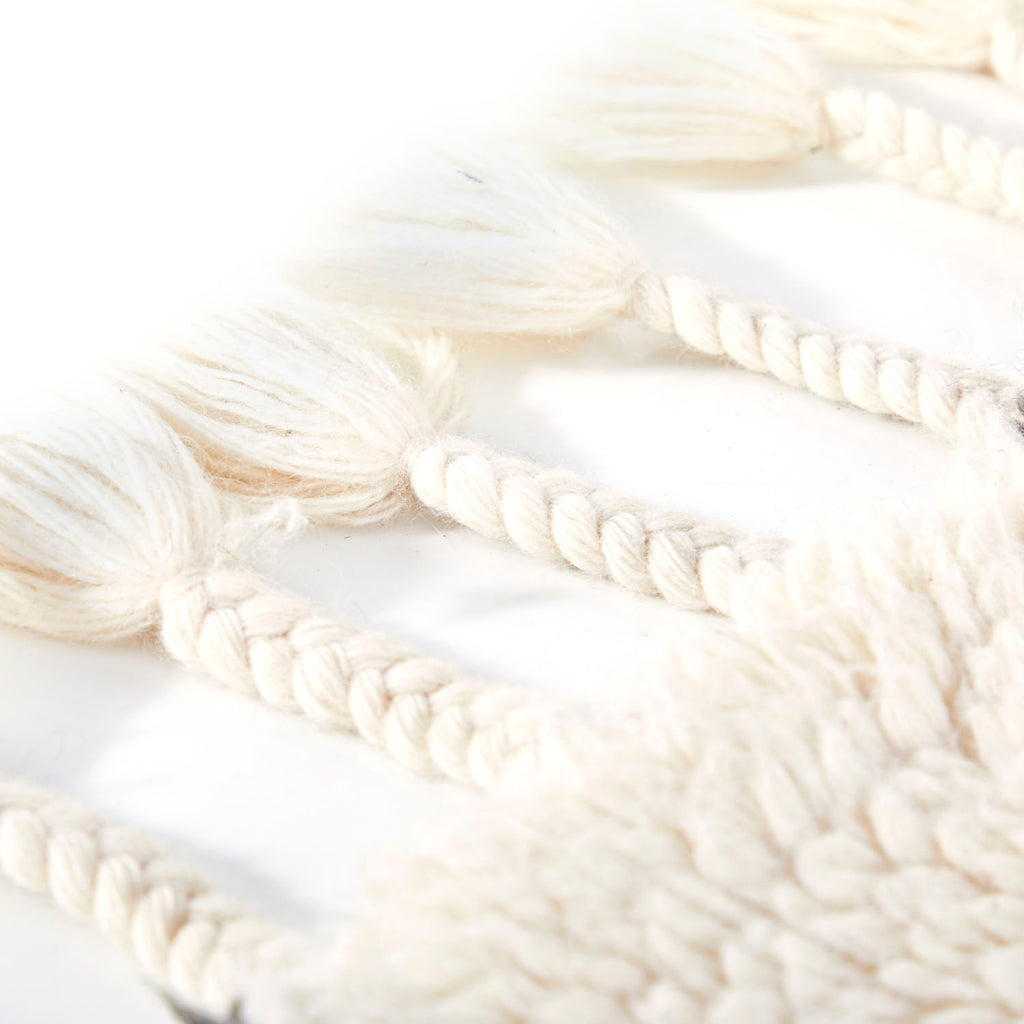 Details: Hanging macrame birdcage made of white woven wool Dimensions: 52" H x 24" W x 24" D Quantity: 1