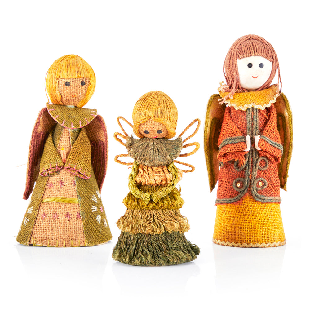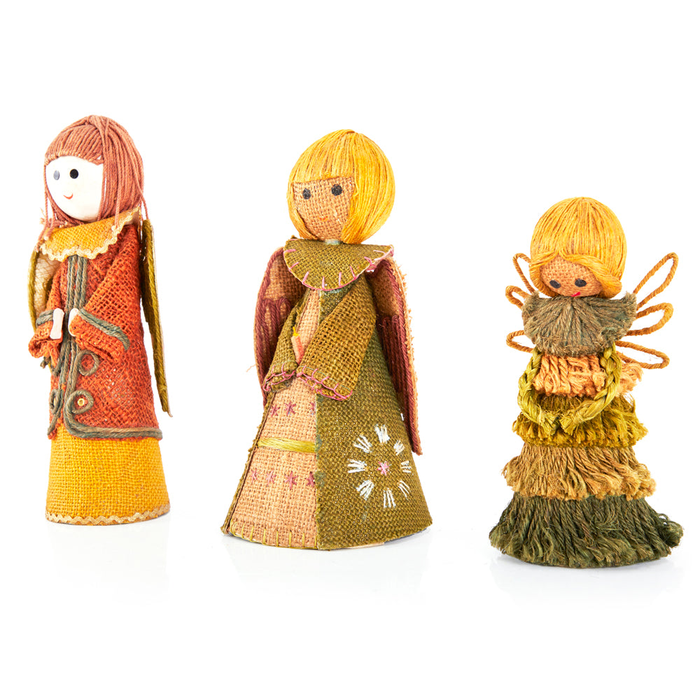 Details: Fairy doll with yellow hair, brown string wings and a green string dress. Available as a set with two other dolls Dimensions: 8" H...