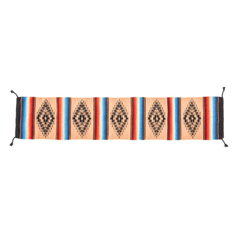 Details: Multicolored (tan-red-blue-white-black) southwestern/aztec design runner rug Dimensions: .5" H x 16" W x 82" D Quantity: 1