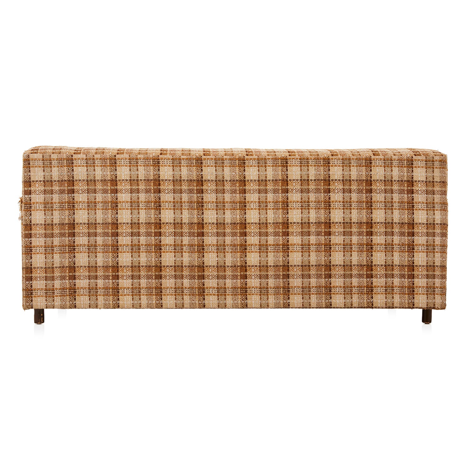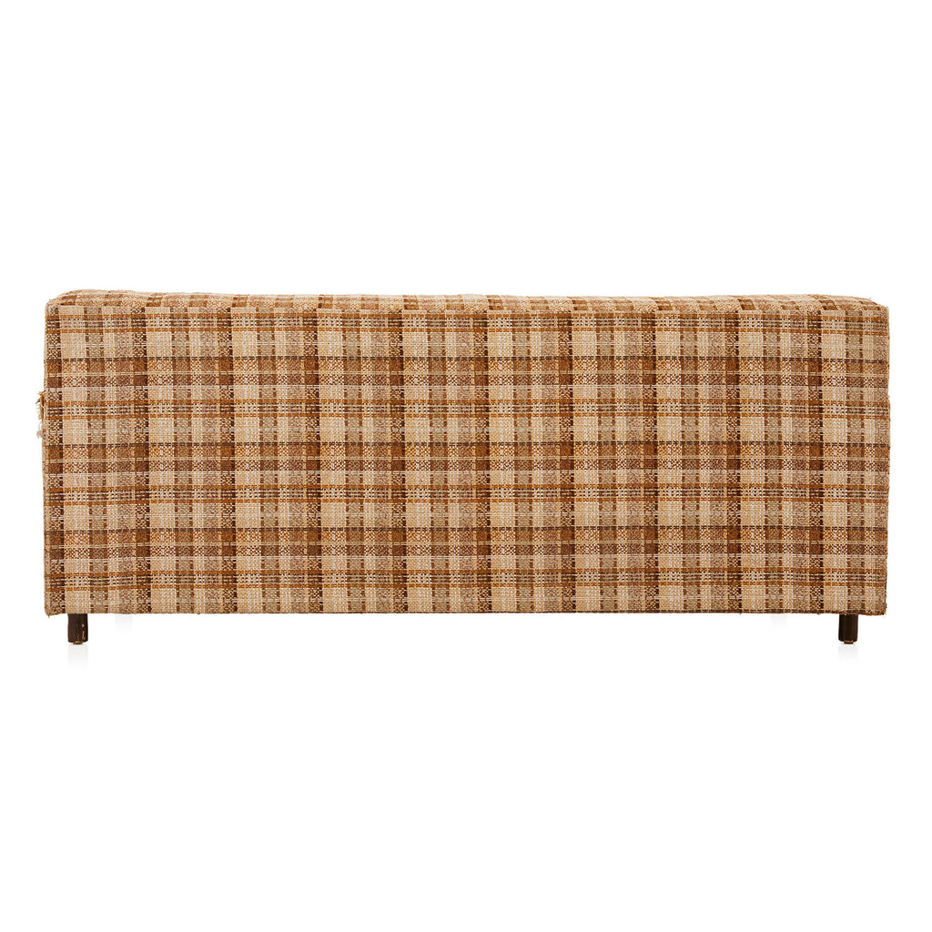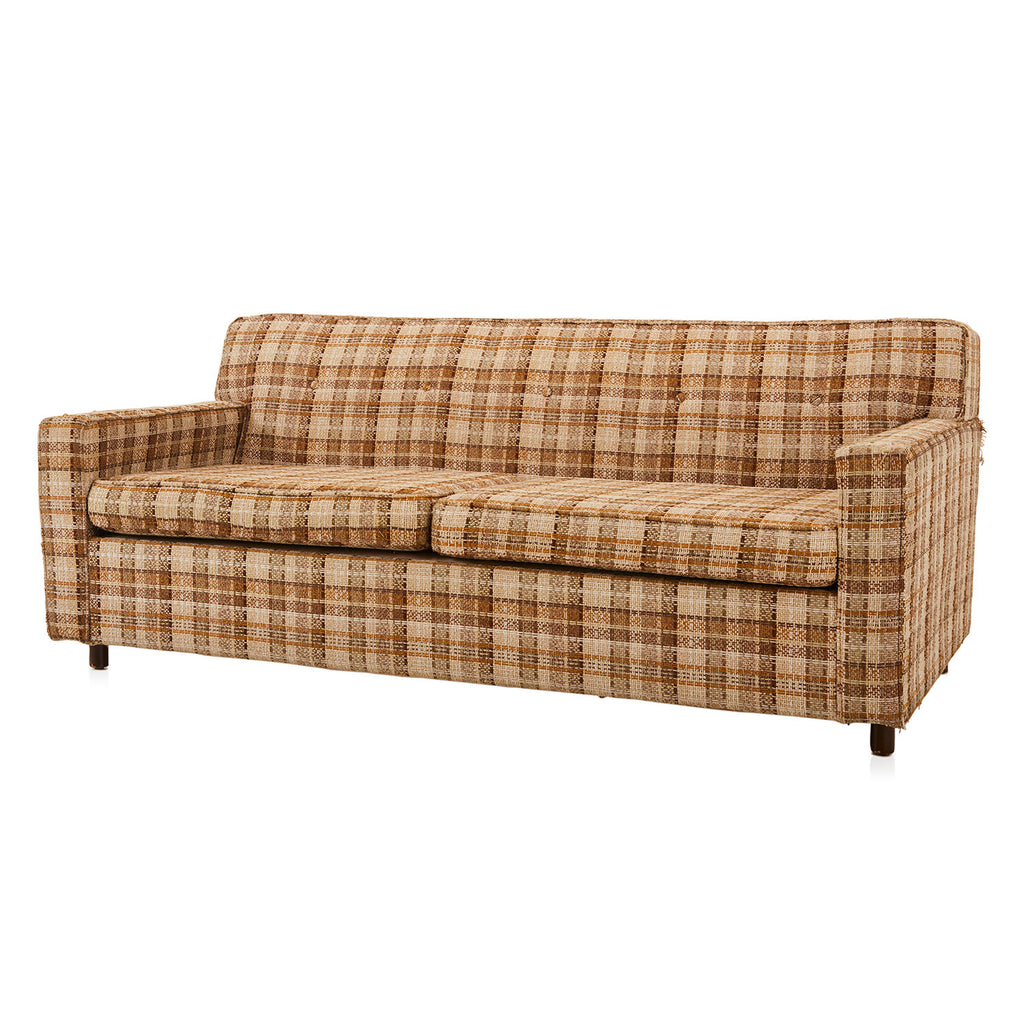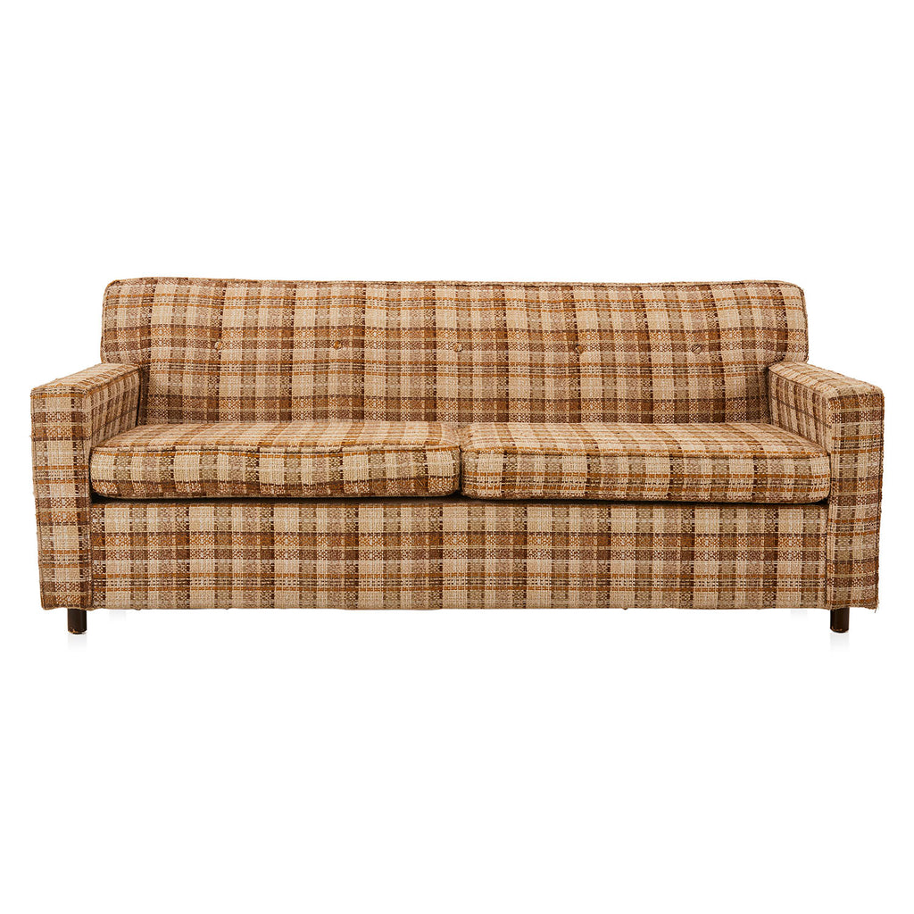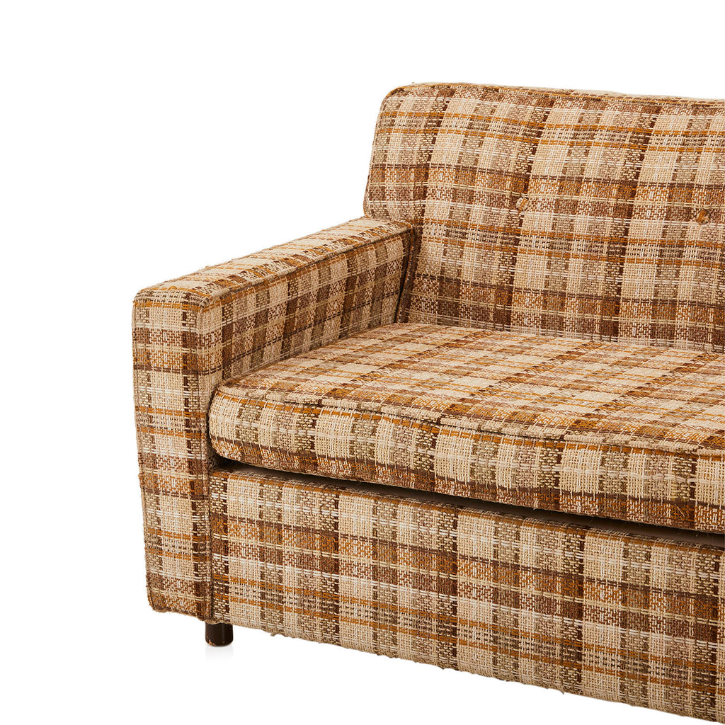 Details: Brown/tan plaid tweed fabric loveseat / small sofa (Product has noticeable wear and tear on upholstery - RENTED AS IS) Dimensions: 29" H x 68.5"...