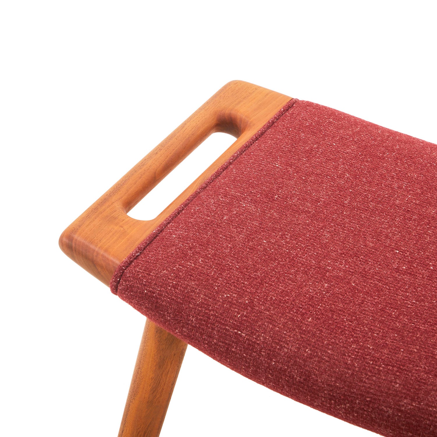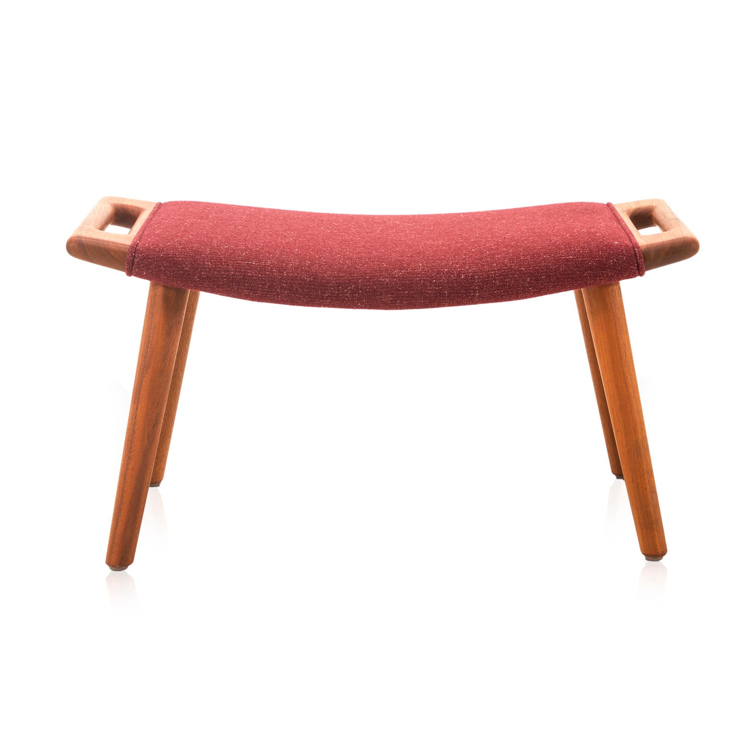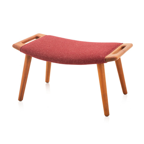 Details: A red wool ottoman with wood legs and handles Dimensions: 15" H x 29" W x 17" D Quantity: 1