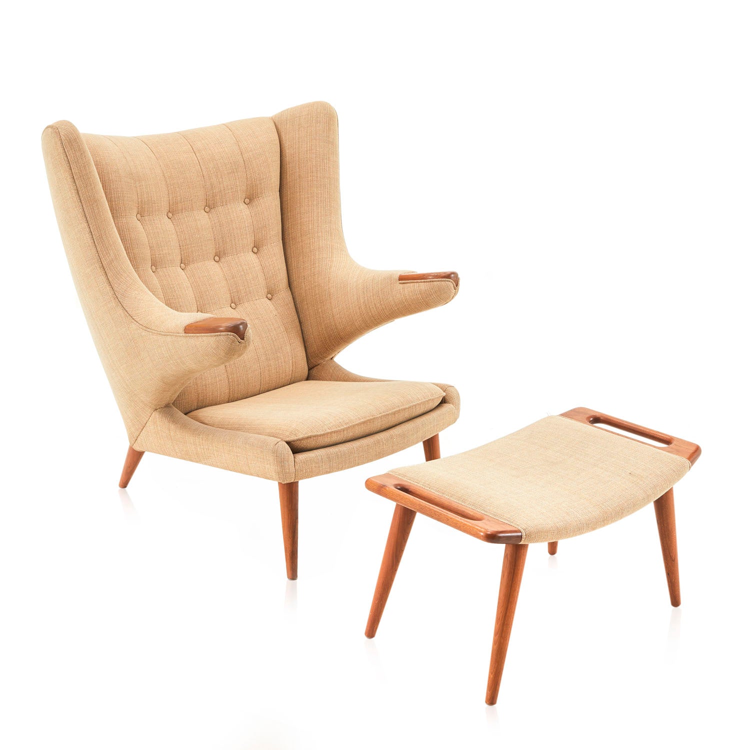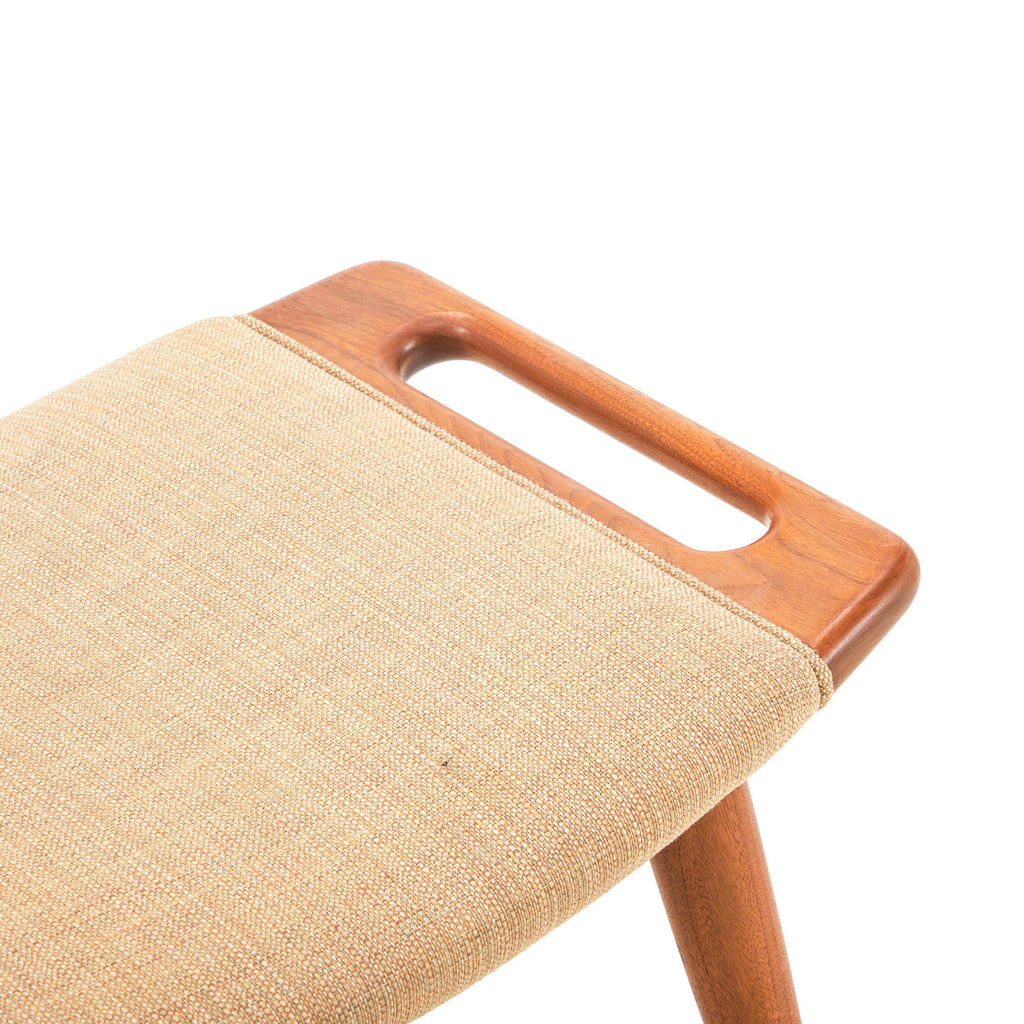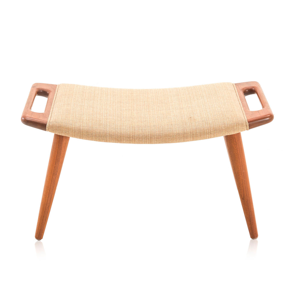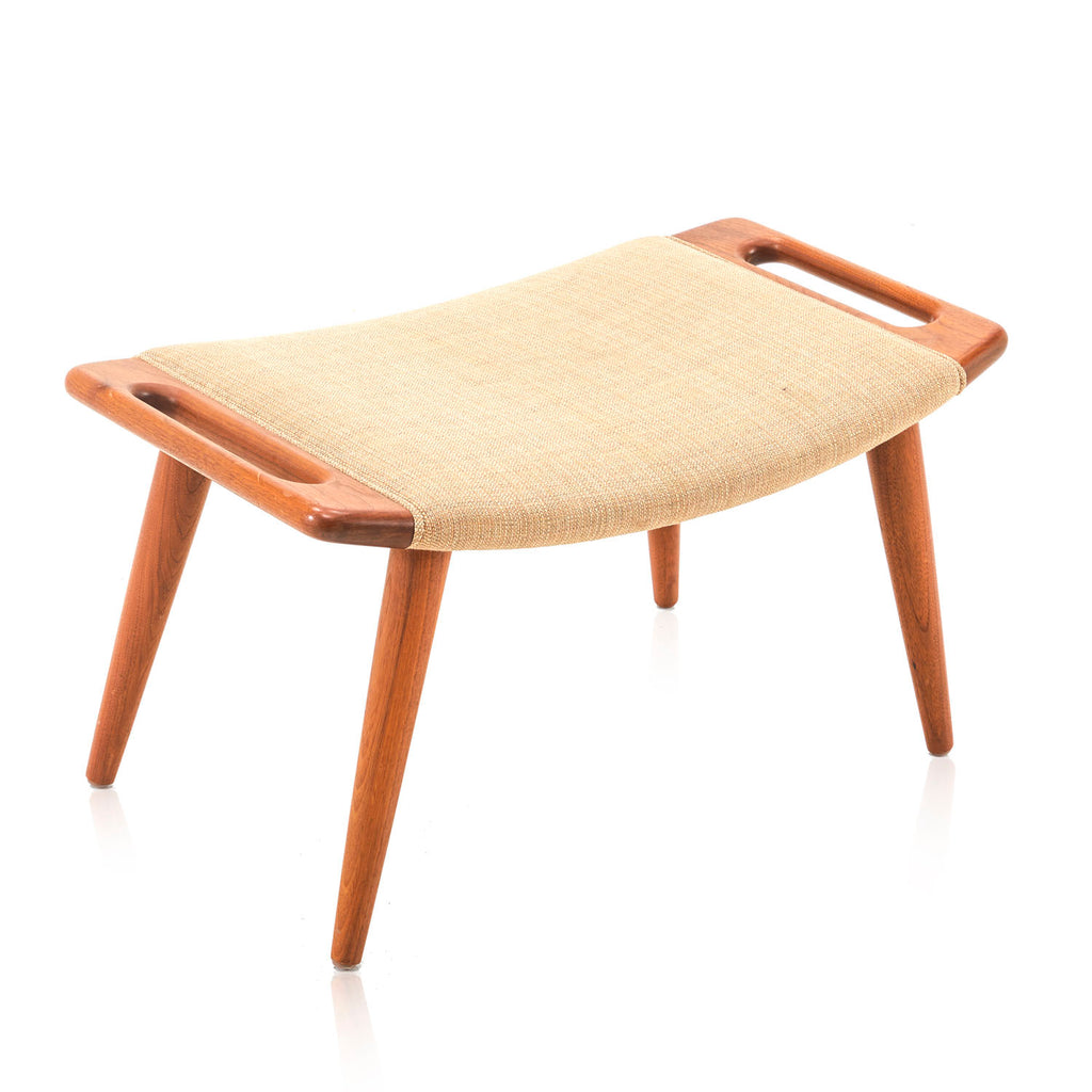 Details: A tan wool ottoman with wood legs and handles Dimensions: 15" H x 27" W x 16" D Quantity: 1