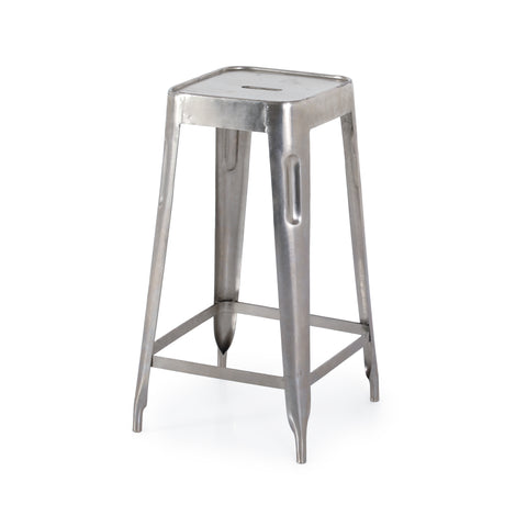 Details: Rustic metal stool with thin legs and round seat. Dimensions: 30" H x 14" W x 14" D
