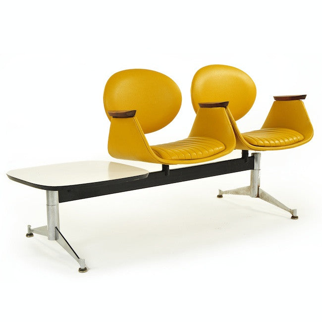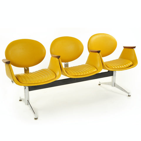 Details: Mustard Yellow, Three Seater, 3 Seats, Black and Chrome Base, Wood Arm Rests NOTE: **There is a very small tear in of the 3...