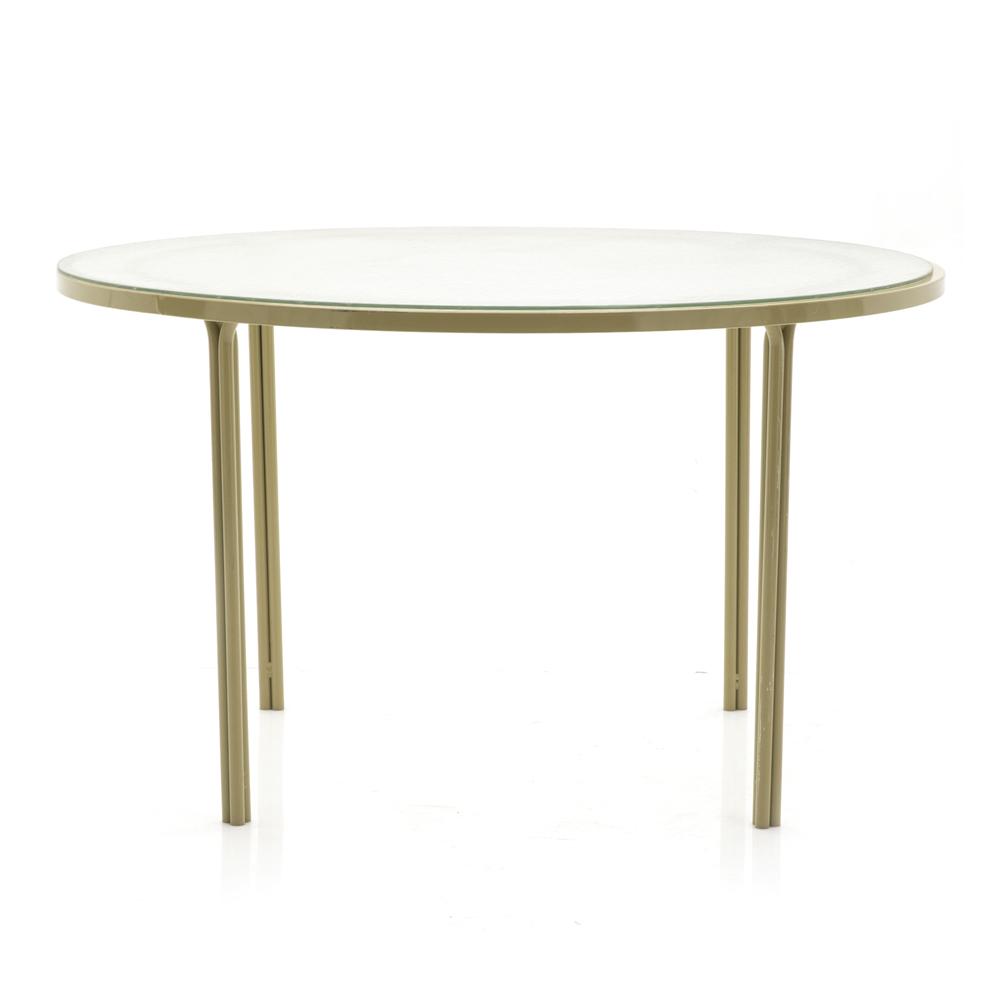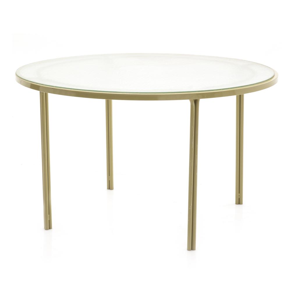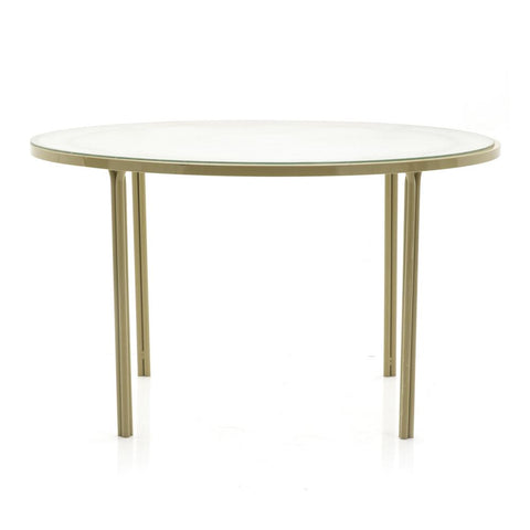 Details: Matte Gold Round Top Patio Dining Table with glass top. Various matching chairs available separately. Dimensions: 29" H x 42" W x 42" D