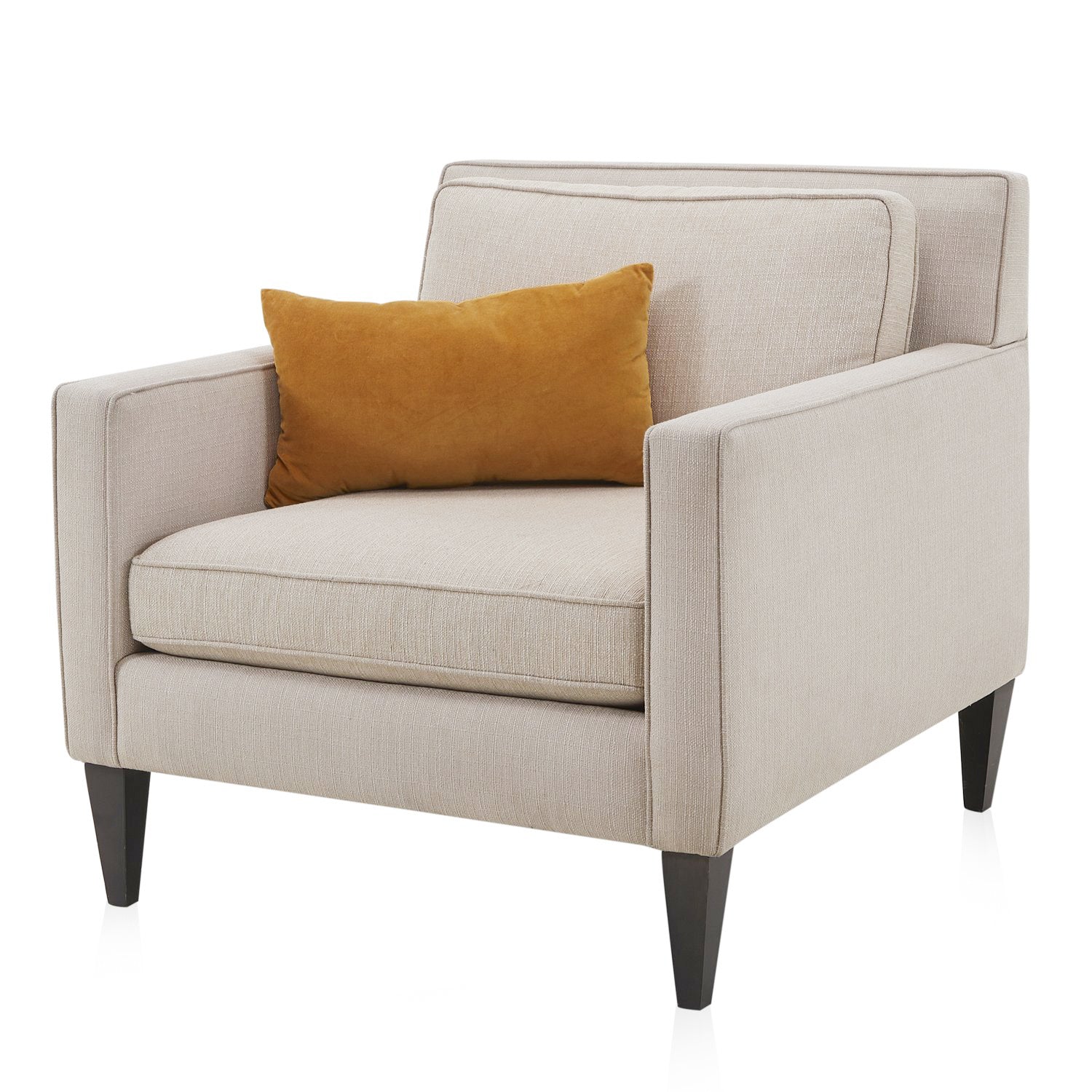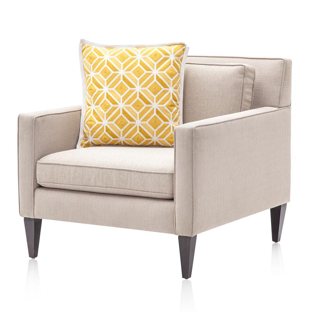 Details: Wooden armchair with yellow and brown cushions and trim skirt Dimensions: 35" H x 40" W x 31" D