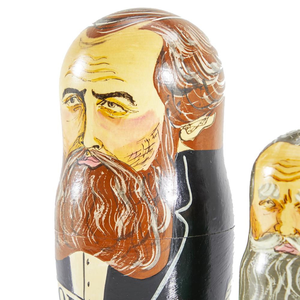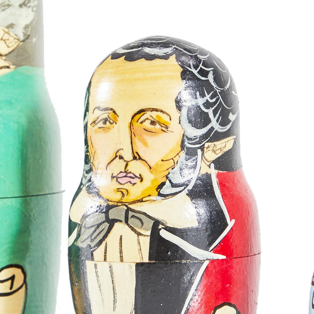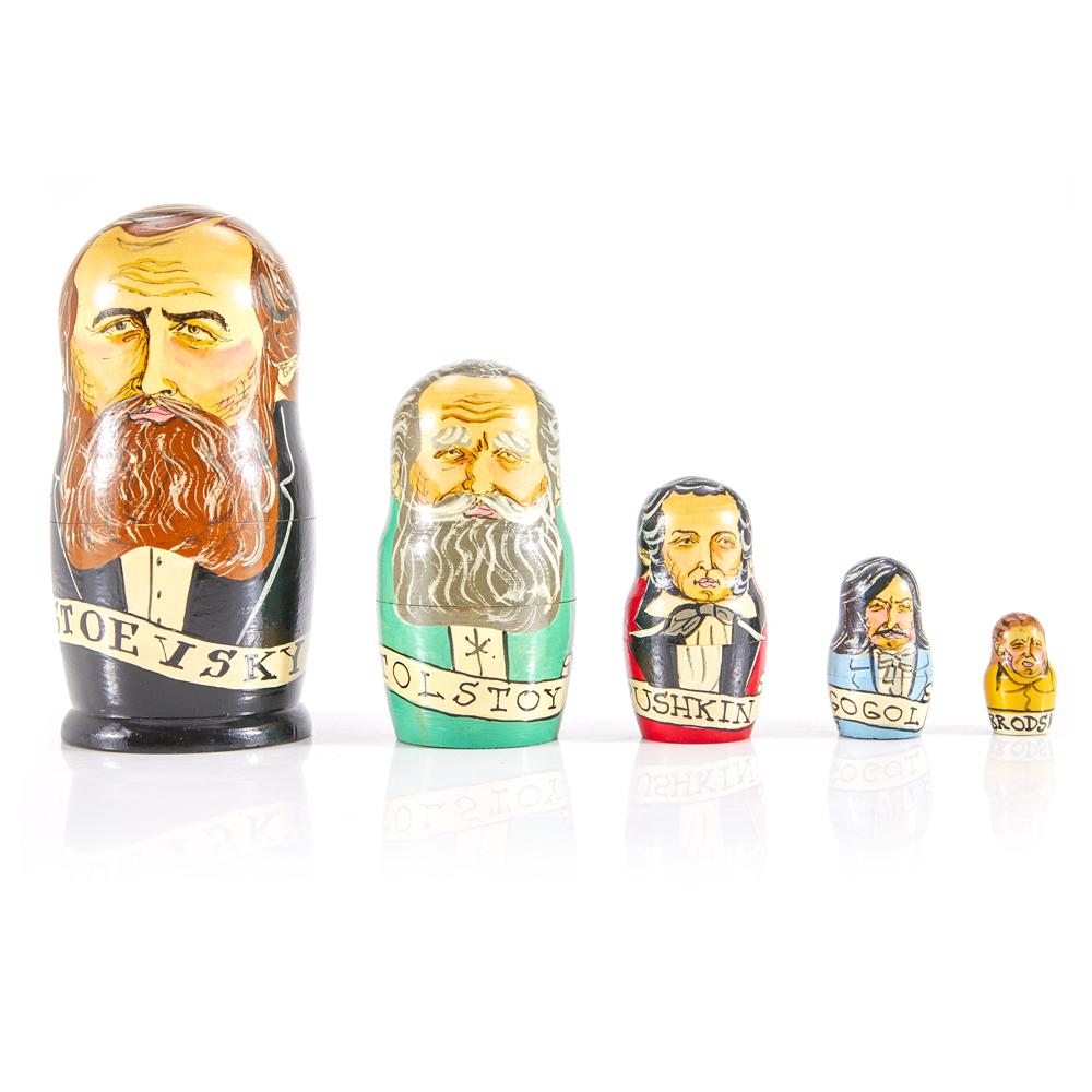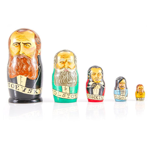 Details: Russian authors nesting dolls in a 5 piece set Dimensions: 7" H x 3.25" W x 3.25" D Quantity: 1