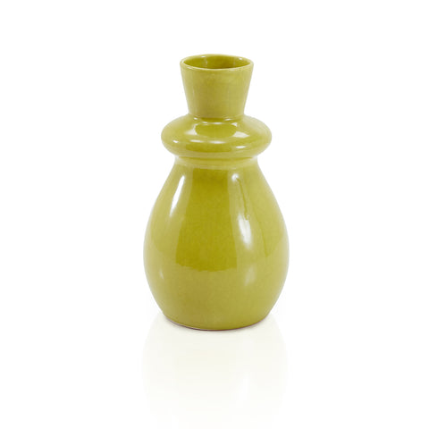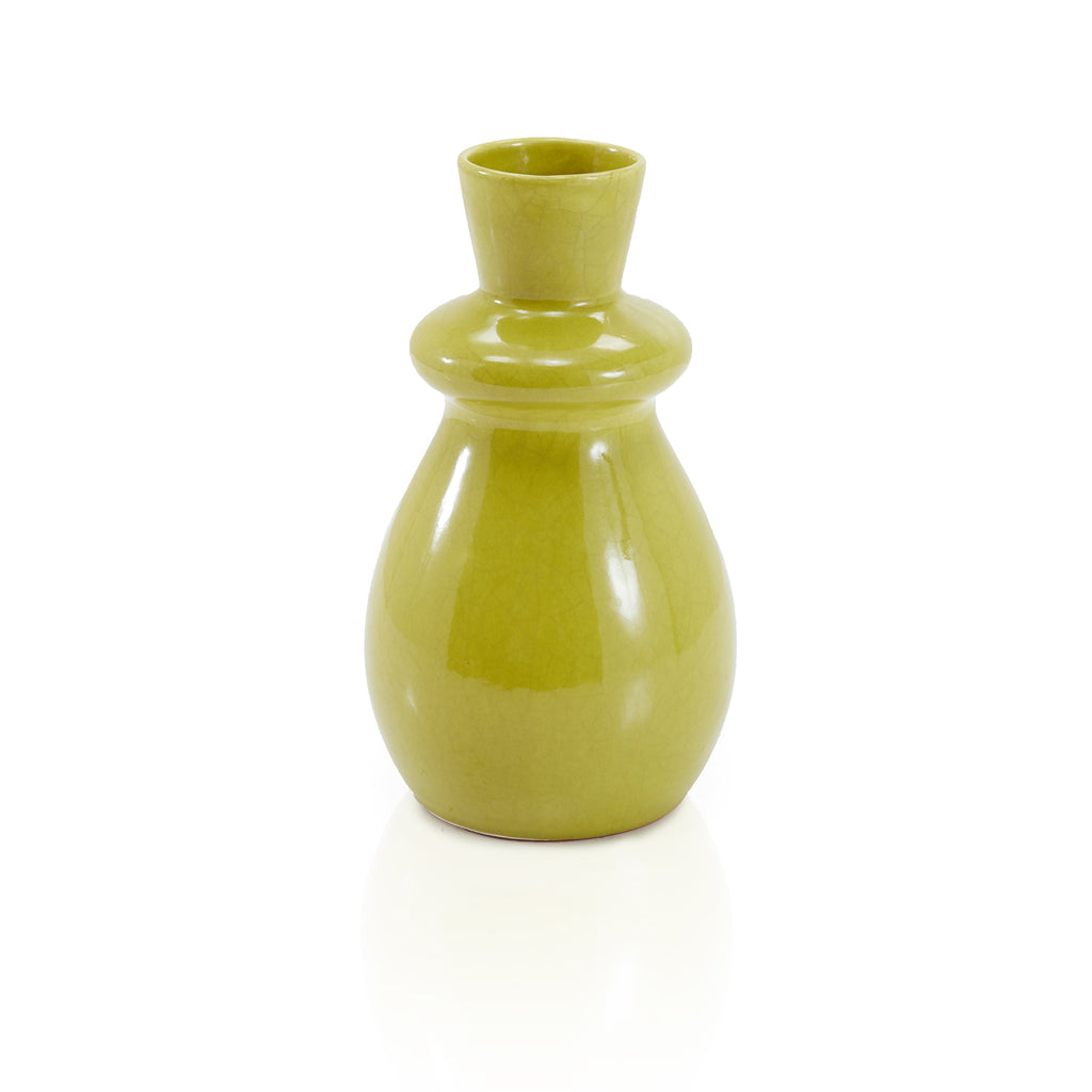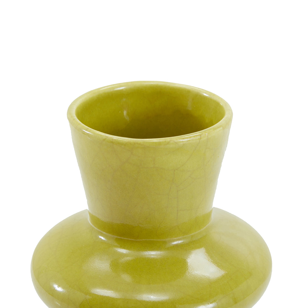 Details: Yellow-green glazed ceramic vase Dimensions: 10" H x 5.5" W x 5.5" D Quantity: 1