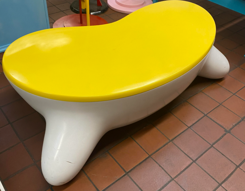Details: Yellow fabric upholstered chair designed by Arne Jacobsen with fluid curves that cradle the body and a metal swivel base. Some noticeable wear, rented...