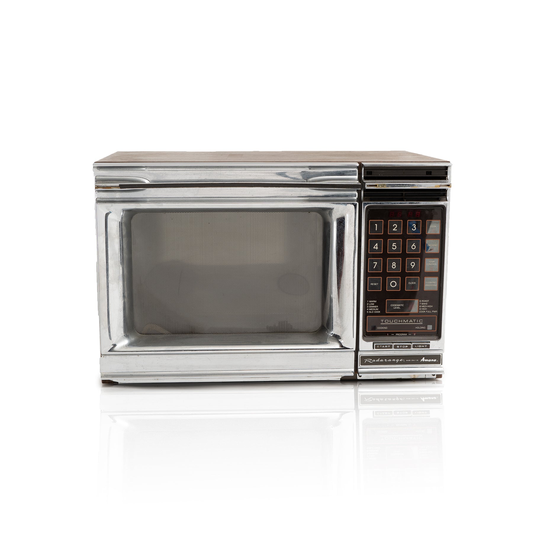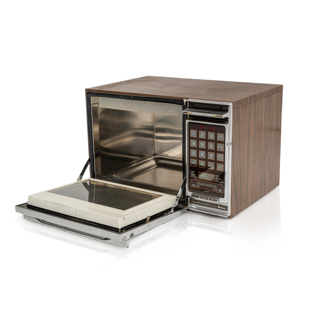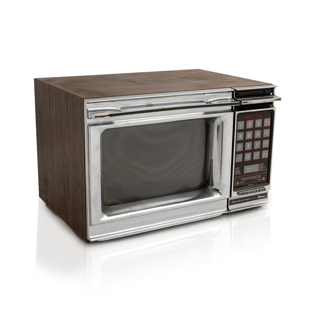 Details: Vintage wood grain and chrome microwave with pull down door Dimensions: 15" H x 23" W x 17" D Quantity: 1