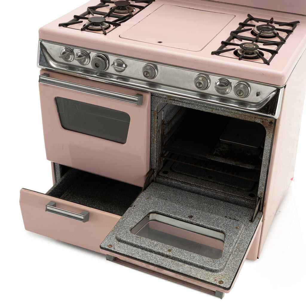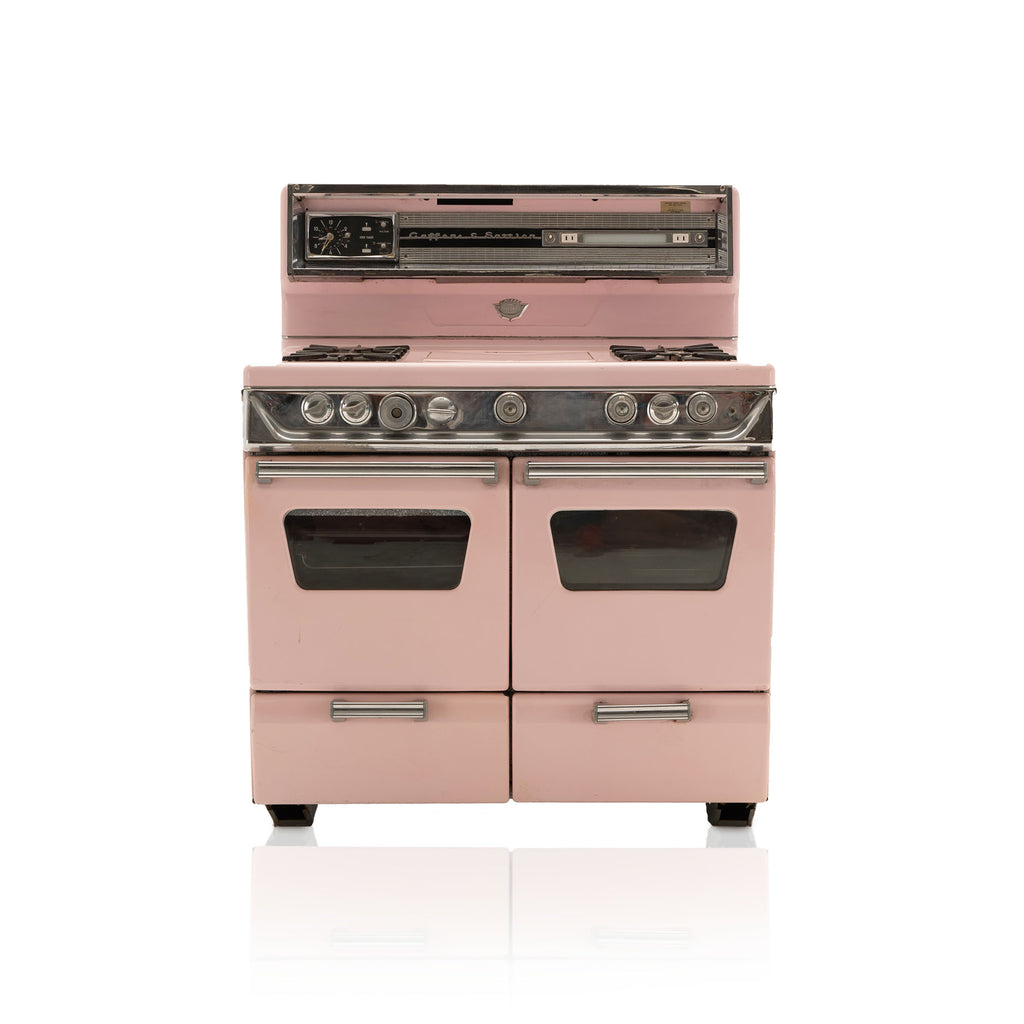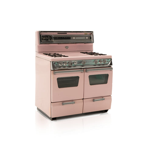 Details: Vintage pastel pink duel oven and burner top unit, excellent condition Dimensions: 50" H x 38" W x 29" D Quantity: 1