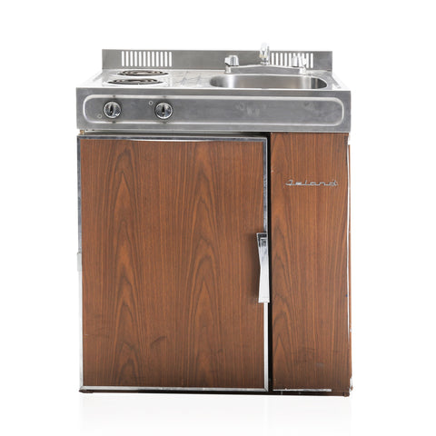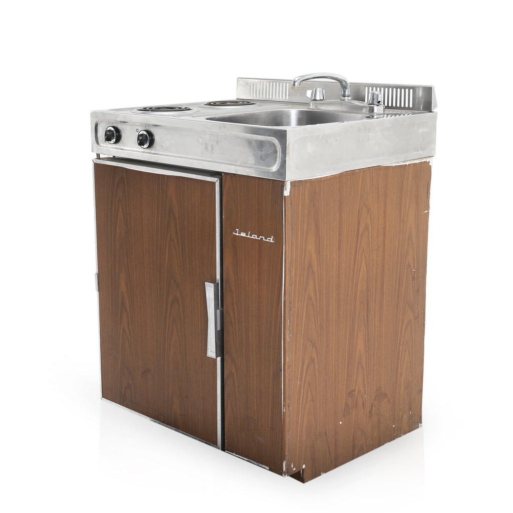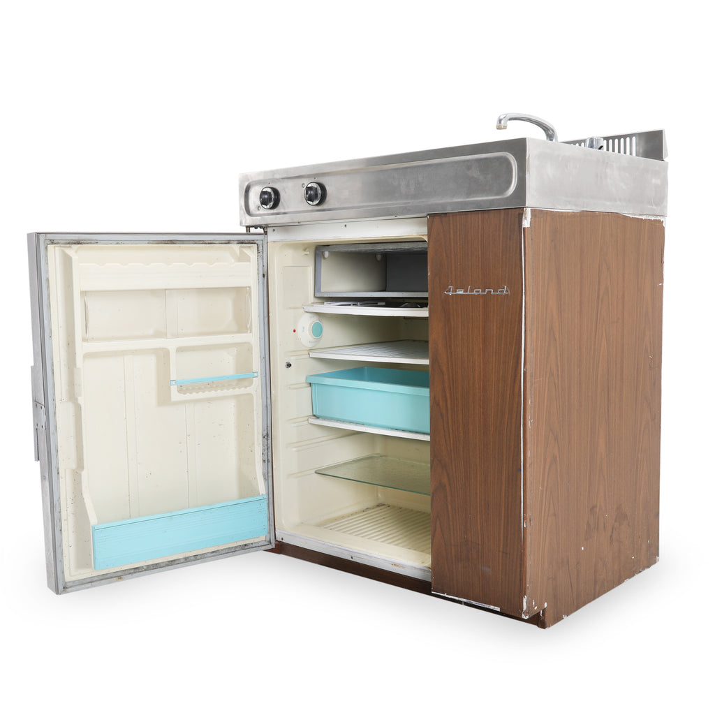 Details: Tan- mustard painted kitchen counter unit with stove, sink, and dishwasher **REFRIGERATOR PICTURED IS LISTED SEPARATELY** Dimensions: Fridge: 64" H x 28" W x...