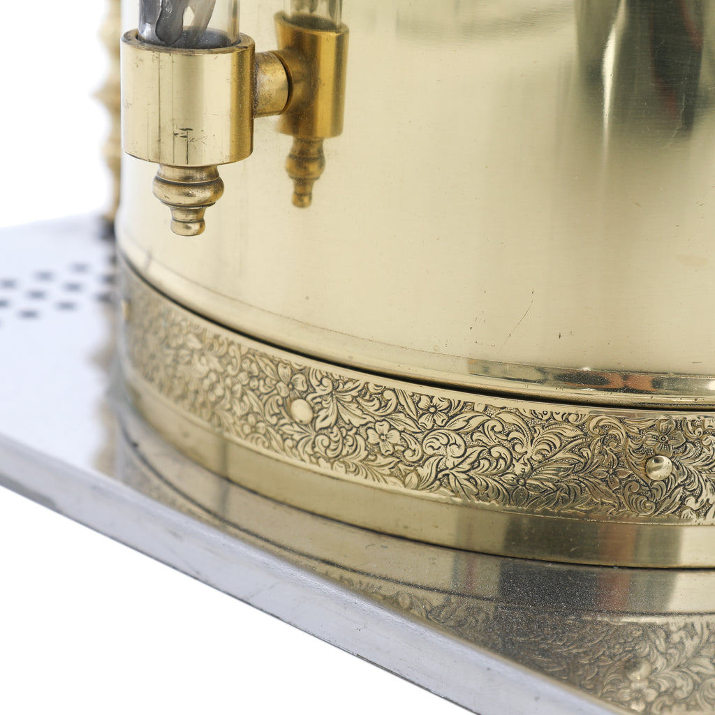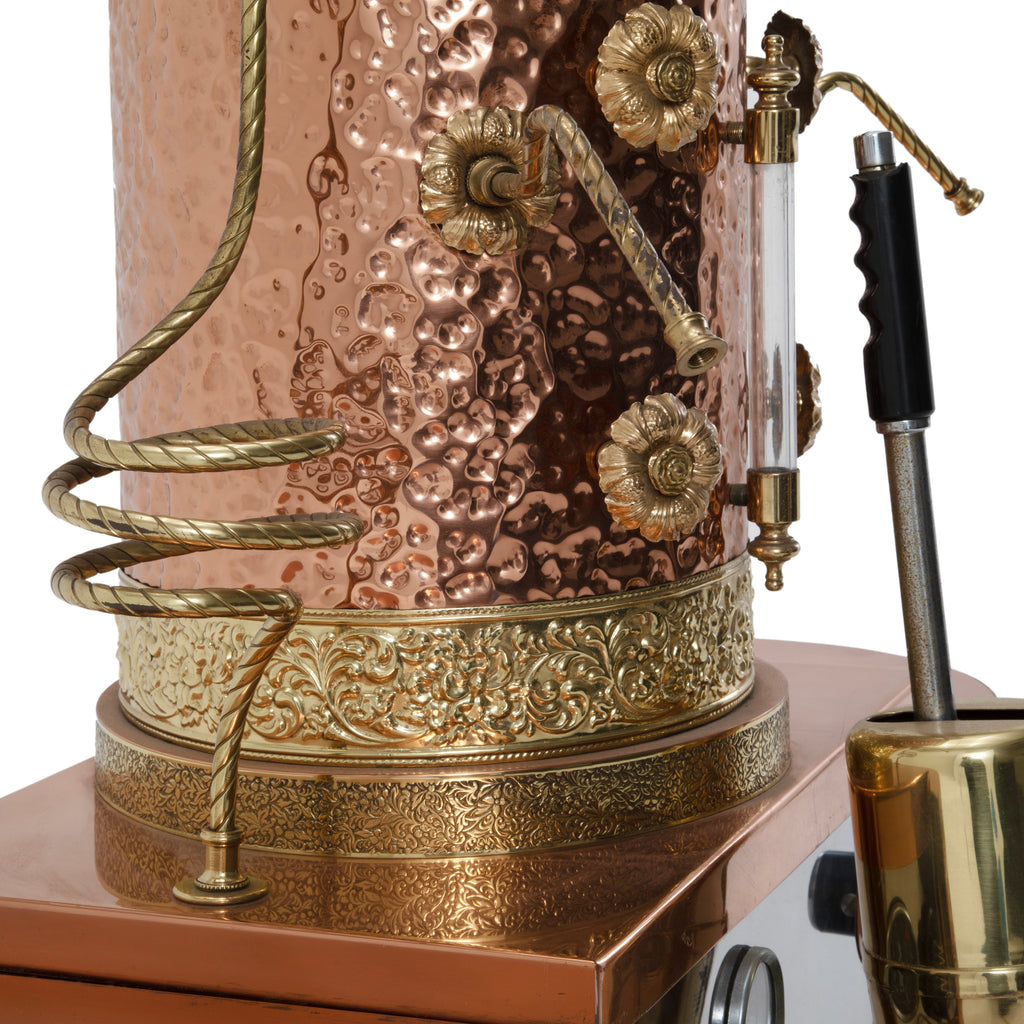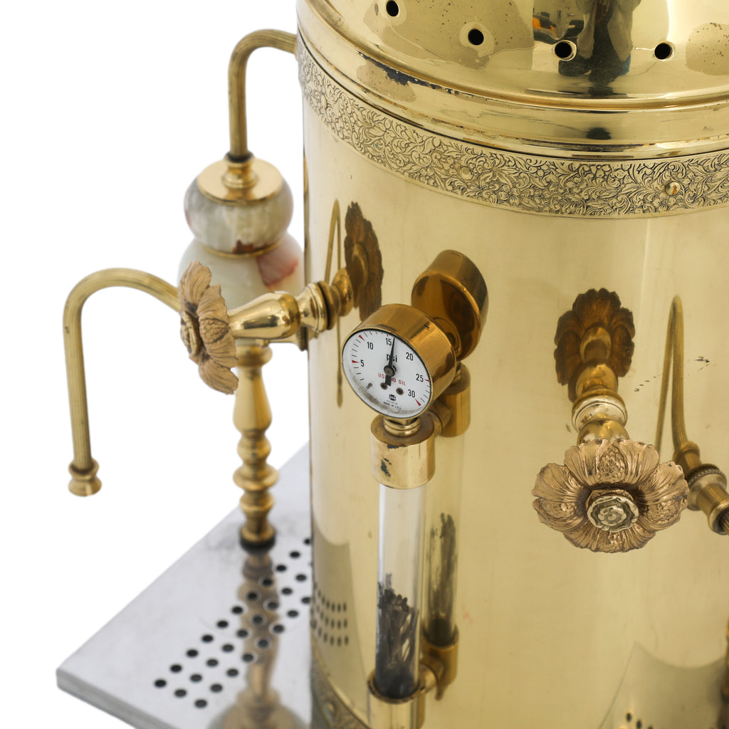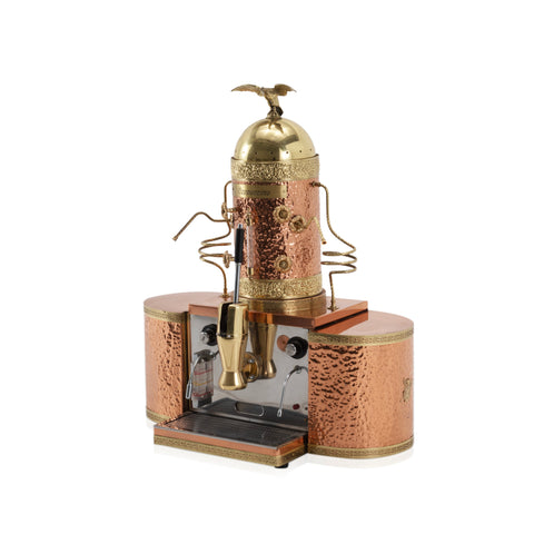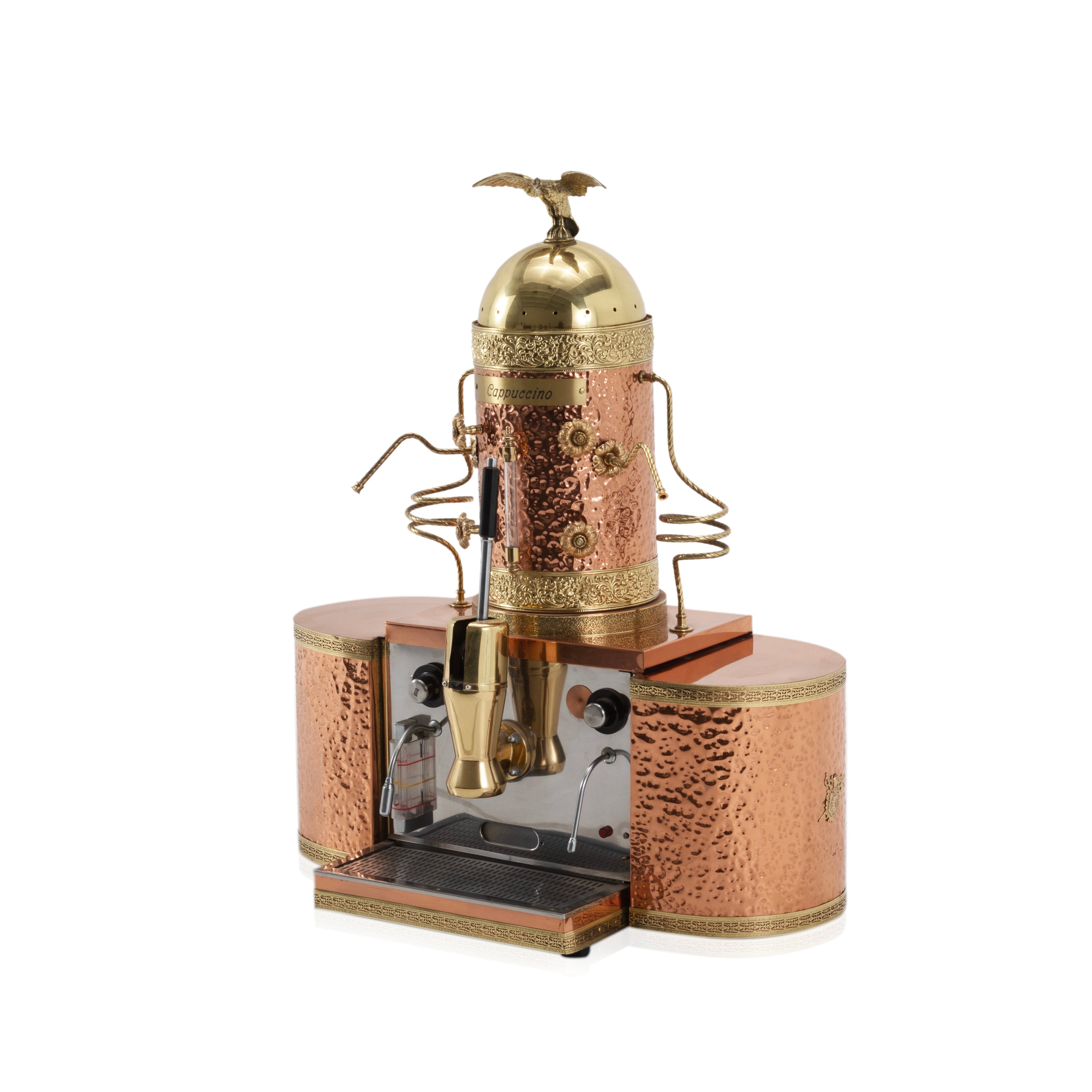 Details: Gold & copper vintage cappuccino machine (not functional). Dimensions: 45" H x 36" W x 24" D