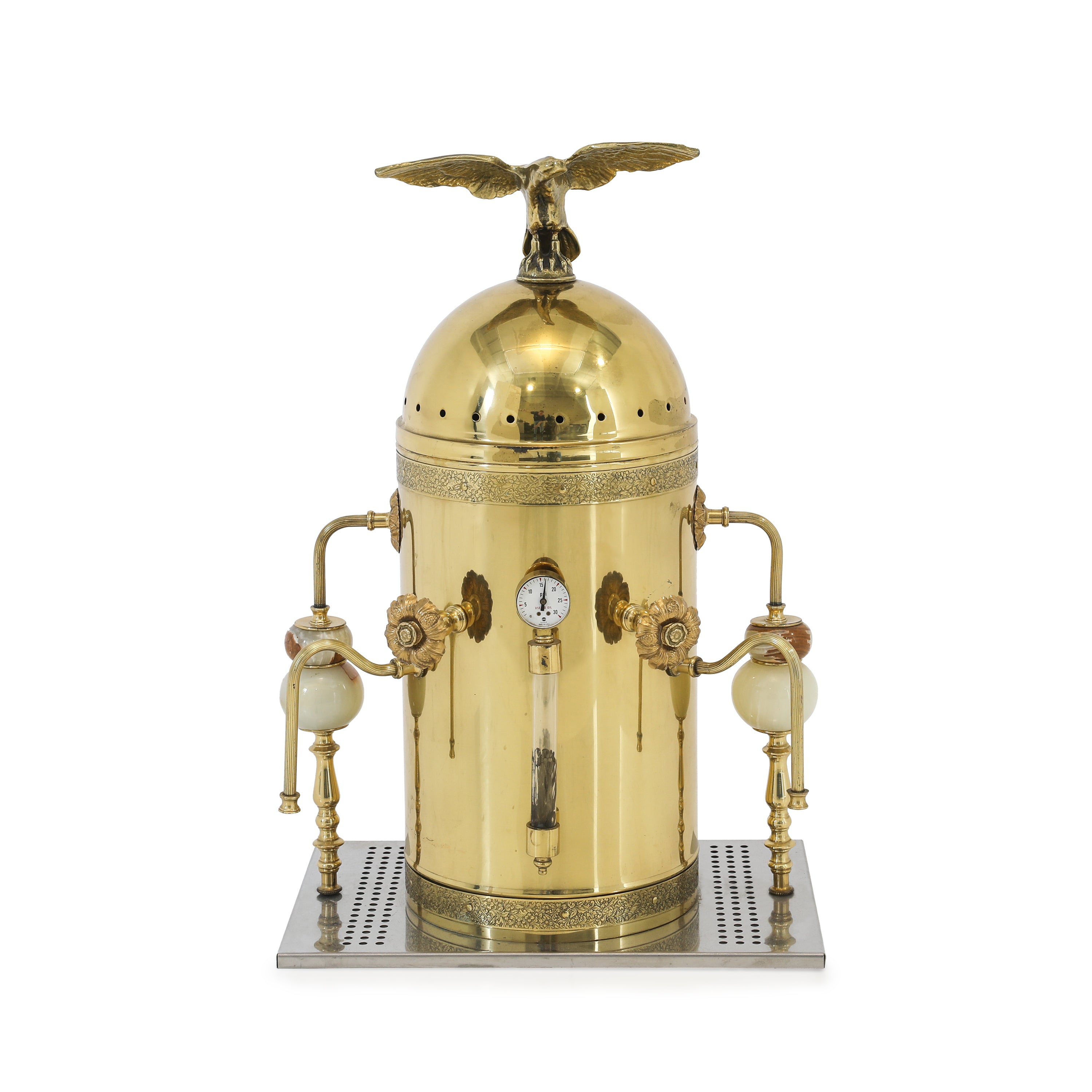 Details: Gold coffee machine with eagle on top. Opals on sides. Stainless / metallic base. Dimensions: 25" H x 16" W x 11" D