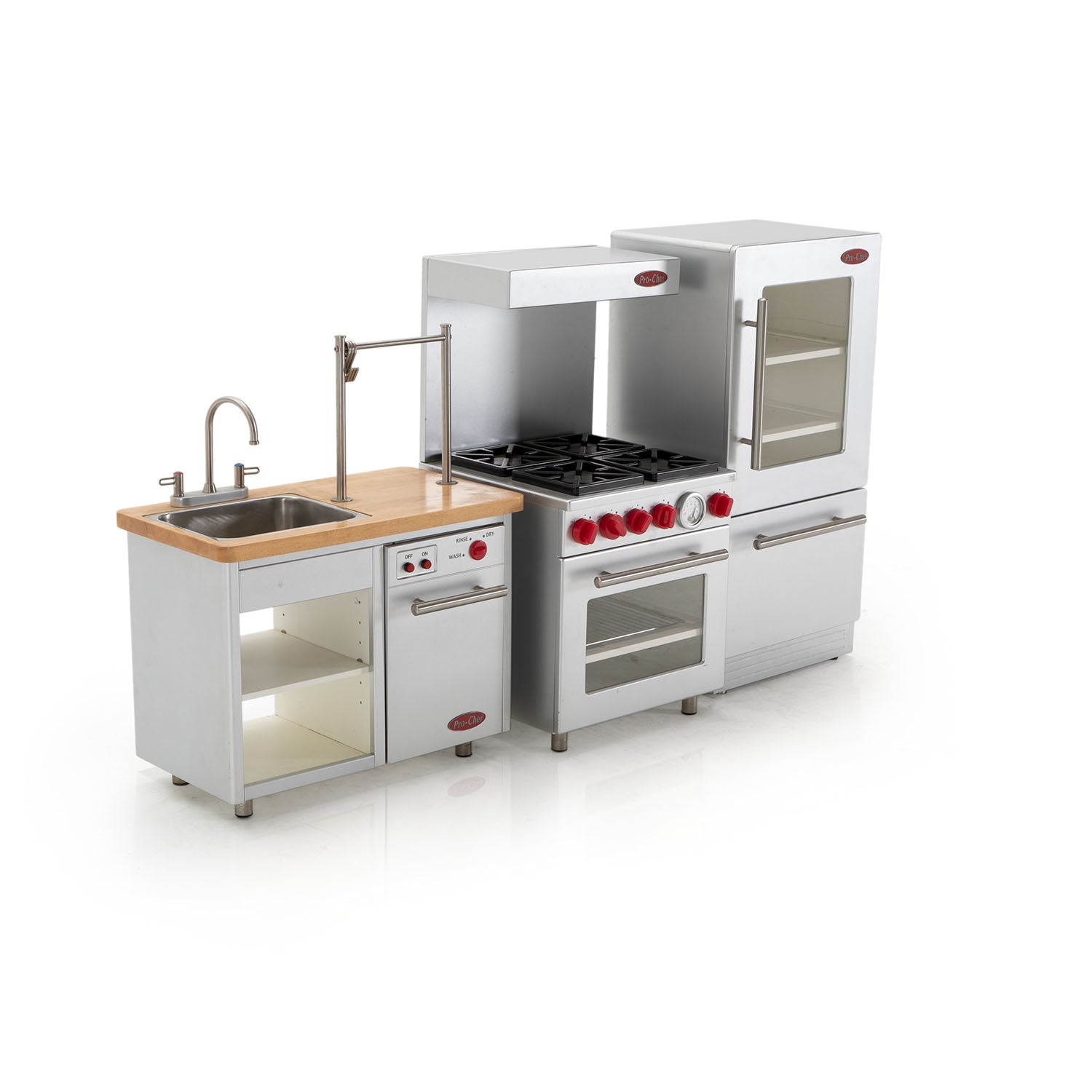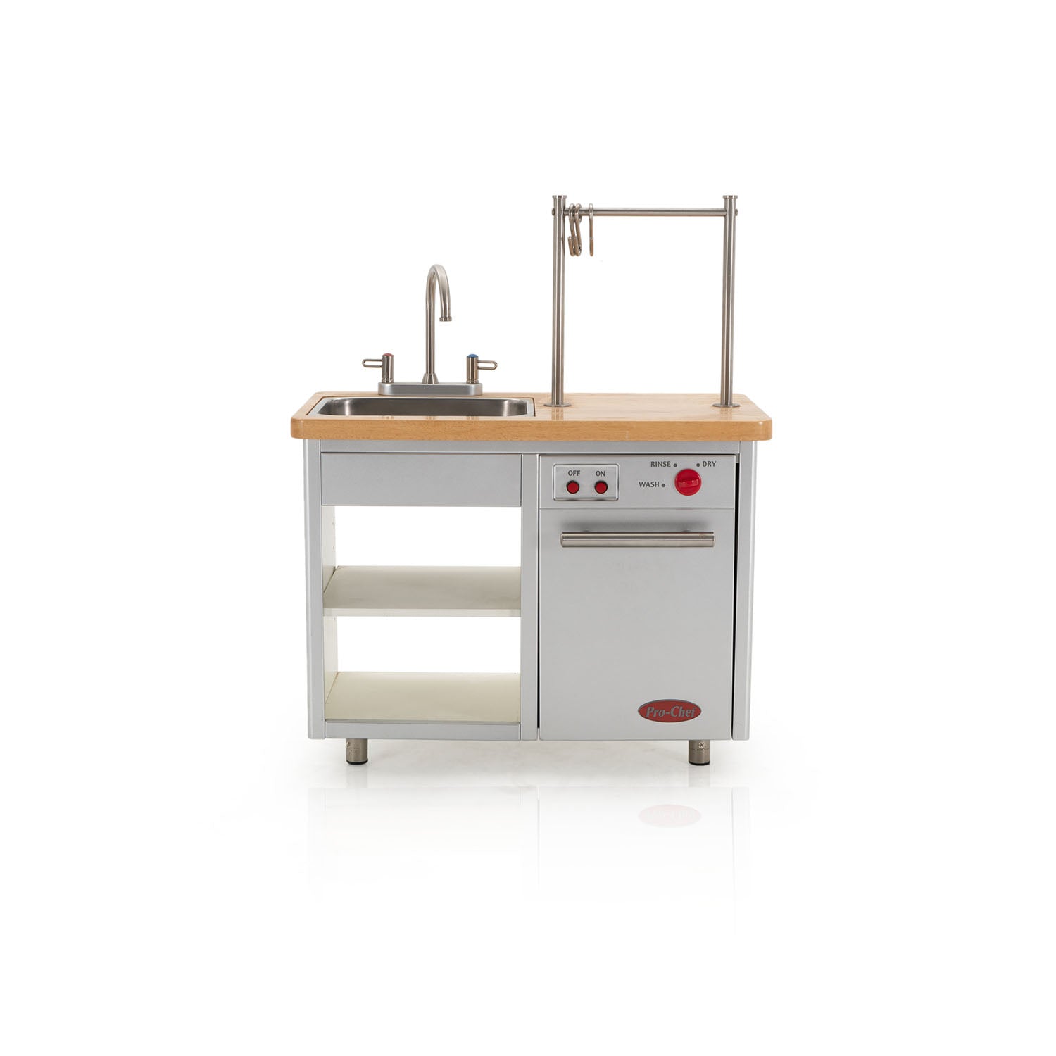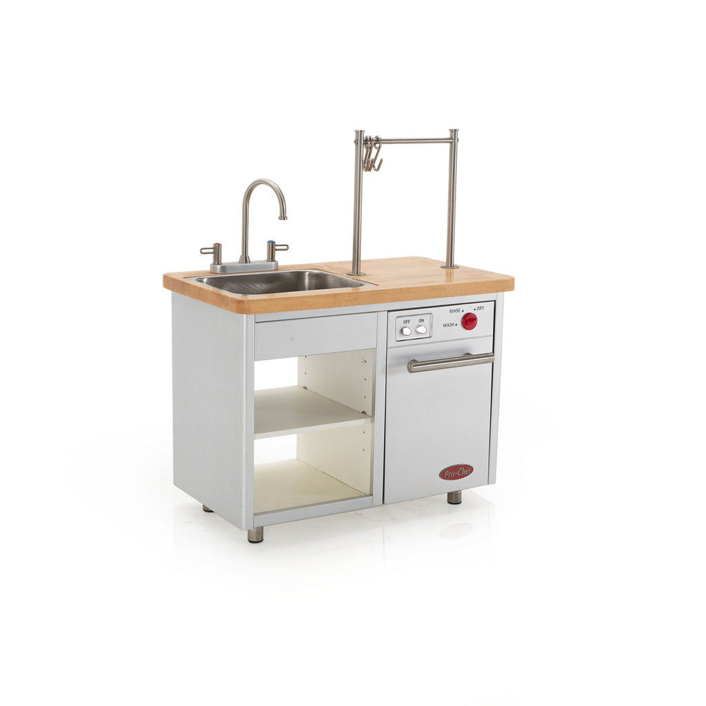 Details: Toy sink island with a light wood countertop, hanging rack, dishwasher, and shelves. Available as a set with refrigerator and oven range