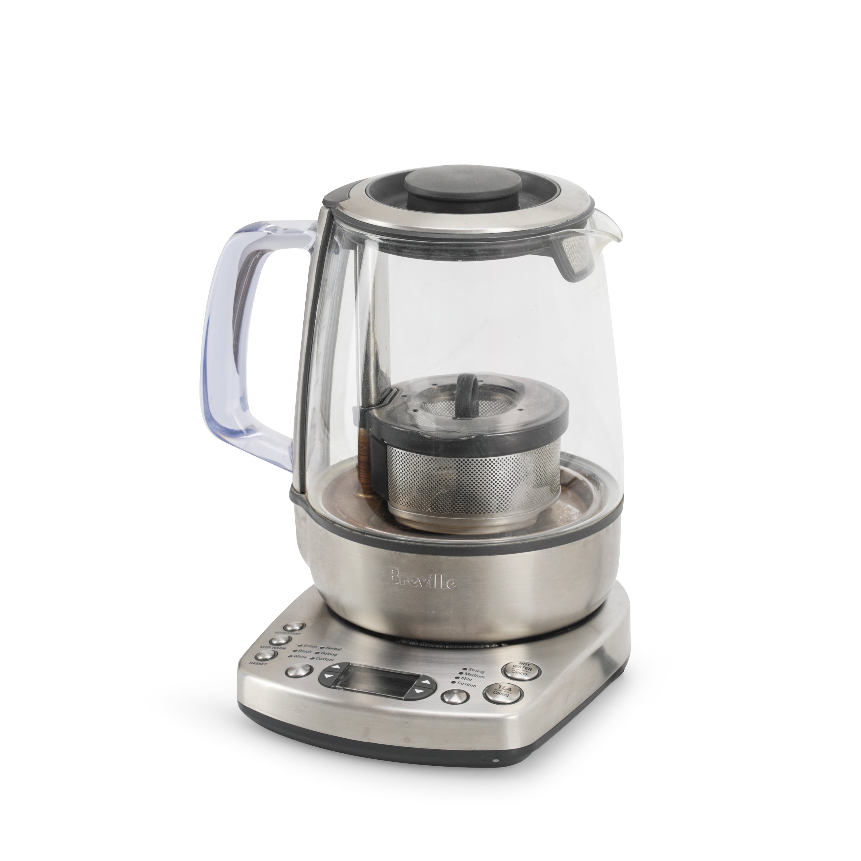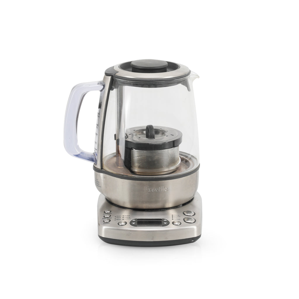 Details: Electronic Breville tea kettle with silver base and metal diffuser. Dimensions: 11" H x 6" W x 10.5" D
