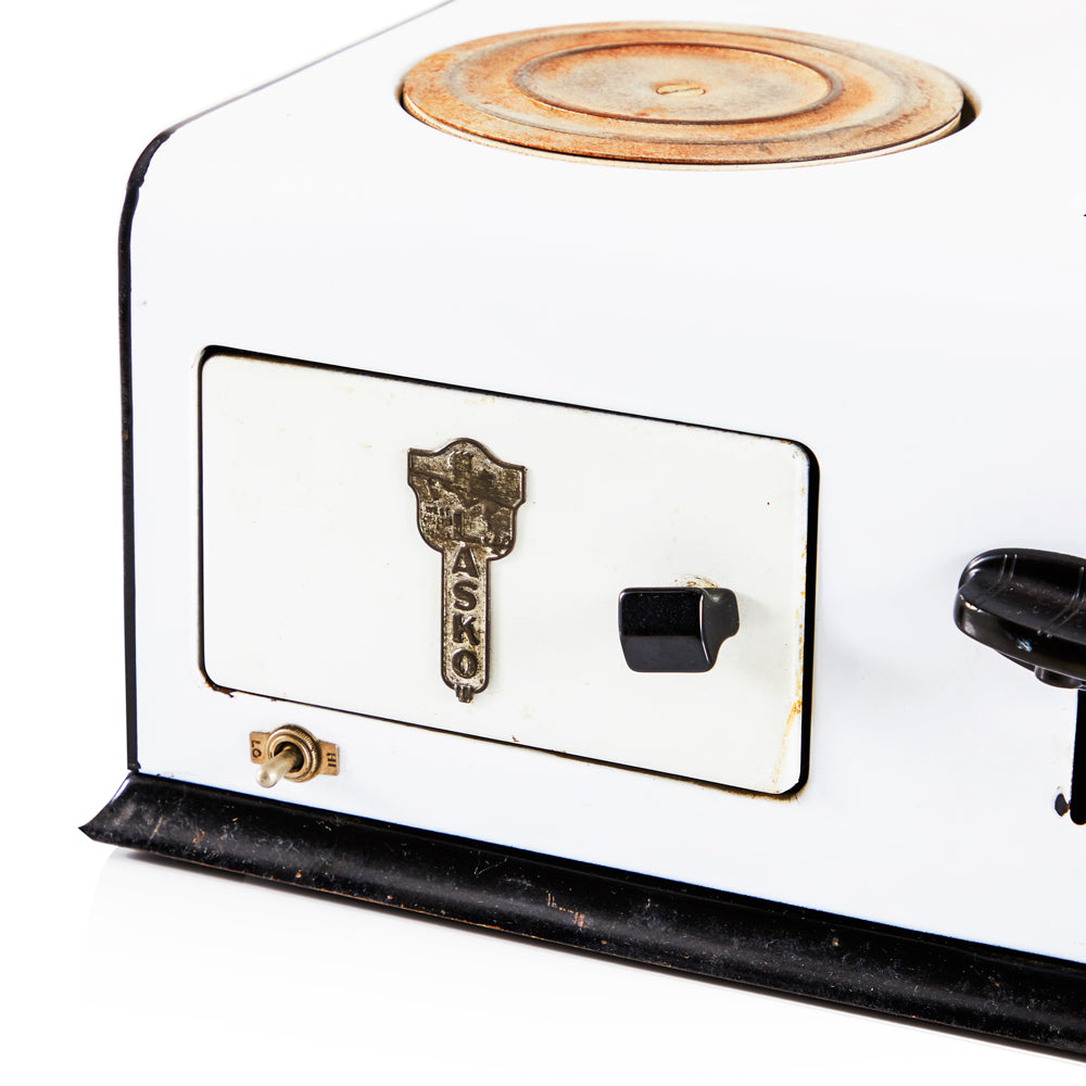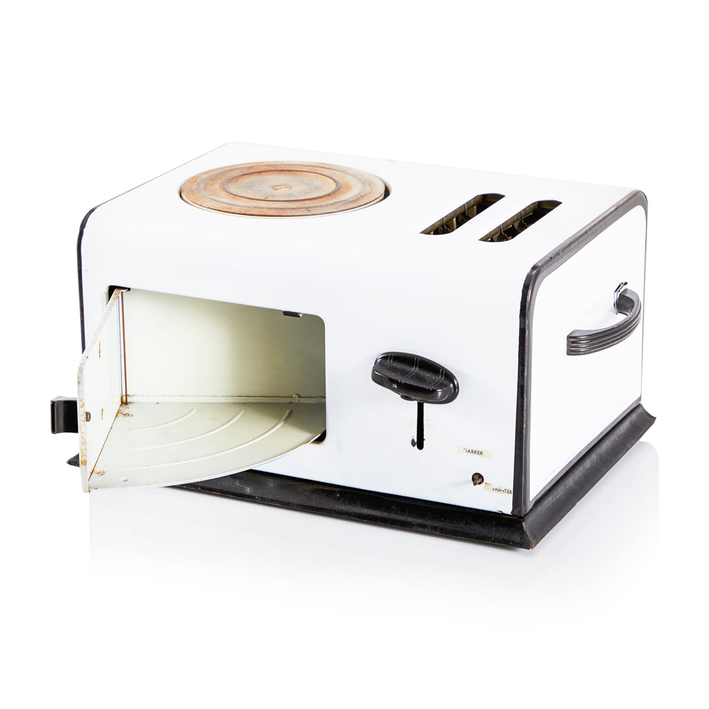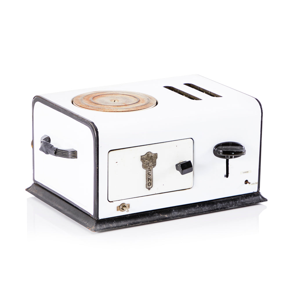 Details: Vintage Lasko 'Toastove'; white enamel toaster unit with hot plate on top and small interior warmer Dimensions: 7.5" H x 14" W x 11" D...