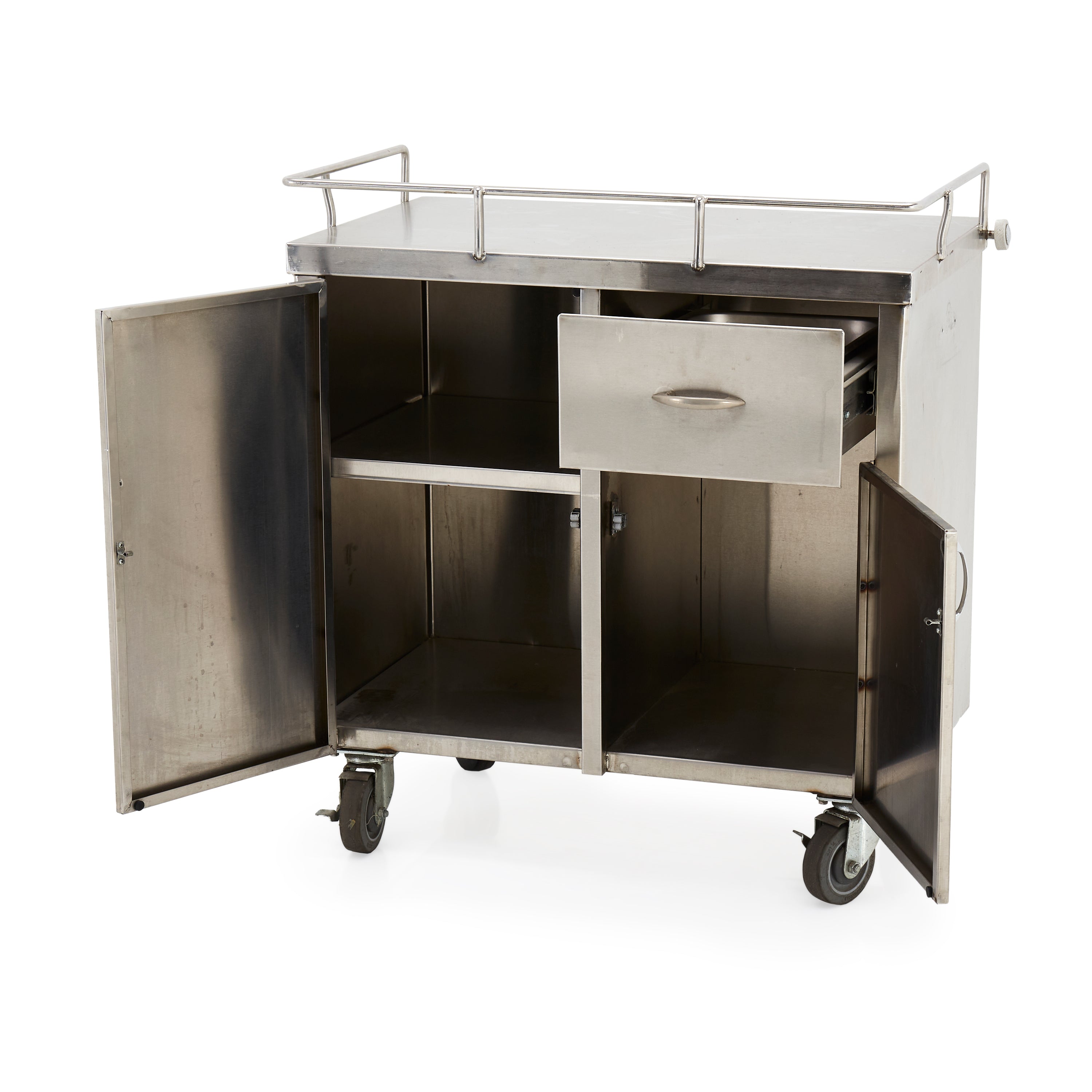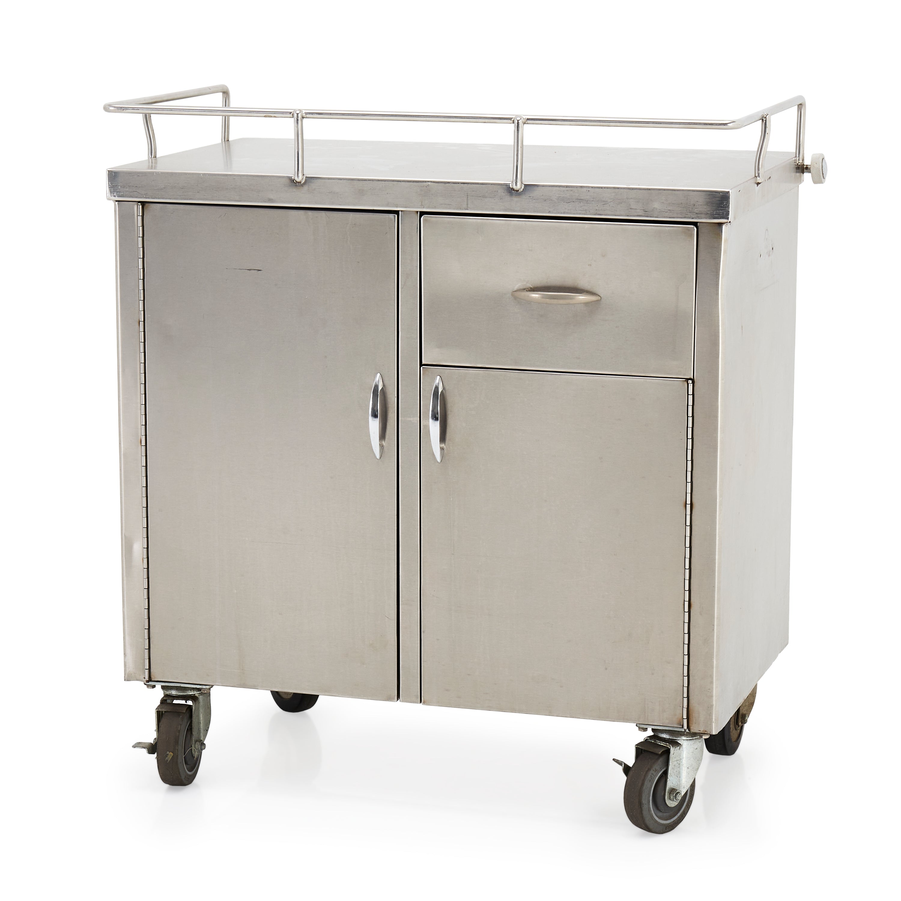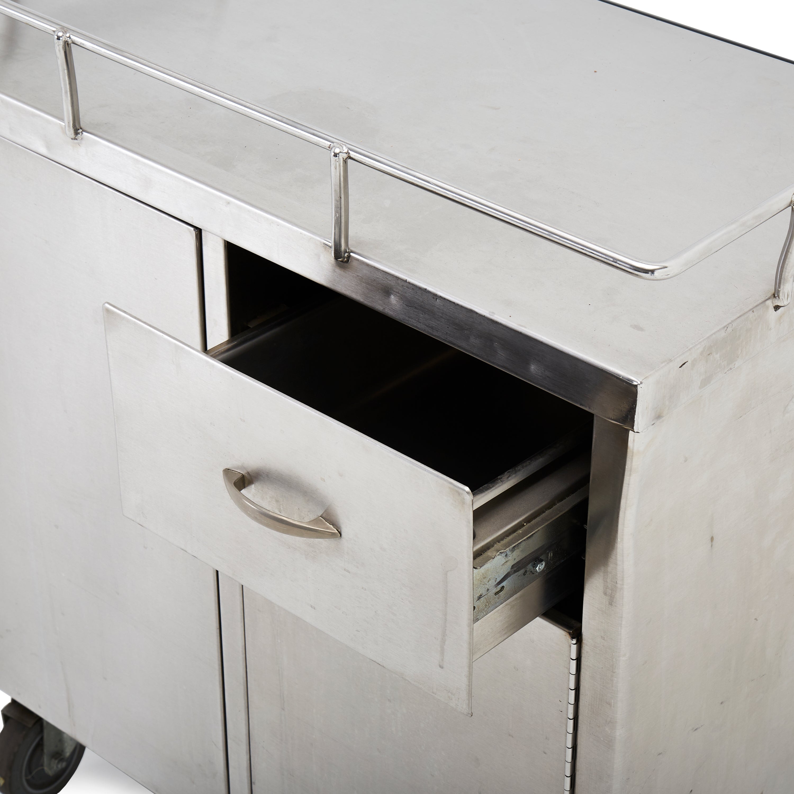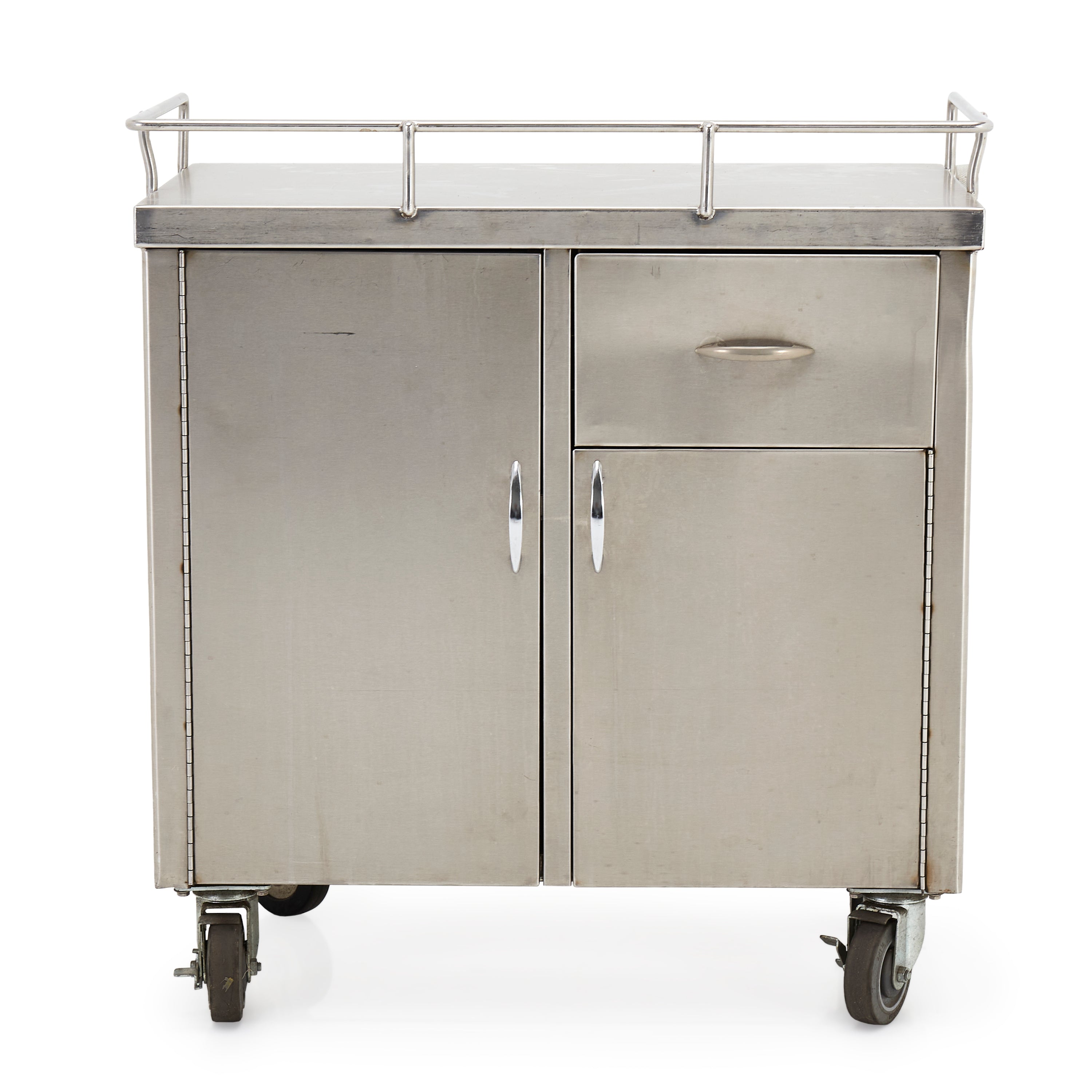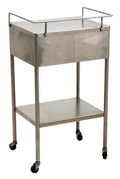 Details: Stainless steel medical cabinet with cabinets and top drawer. Railing across top. Dimensions: 33.25"H x 30.5" W x 18.25" D