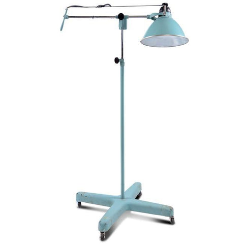 Details: Baby blue standing vintage medical light Dimensions: 64.5" H x 42" W (Base Dimensions: 26" Diameter)