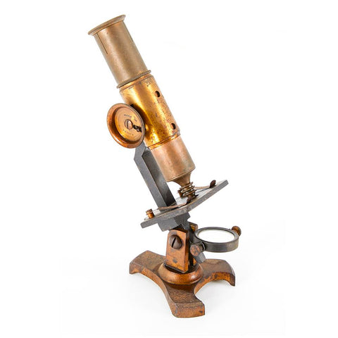 Details: Rustic optical microscope with copper facade and black metal stage Dimensions: 8.5" H x 3" W x 3.5" D Quantity: 1