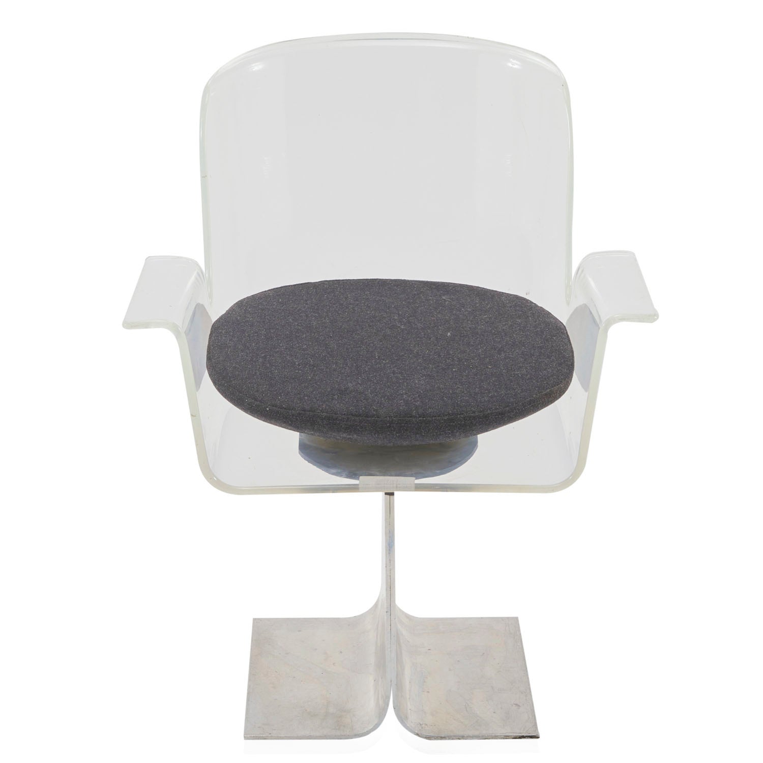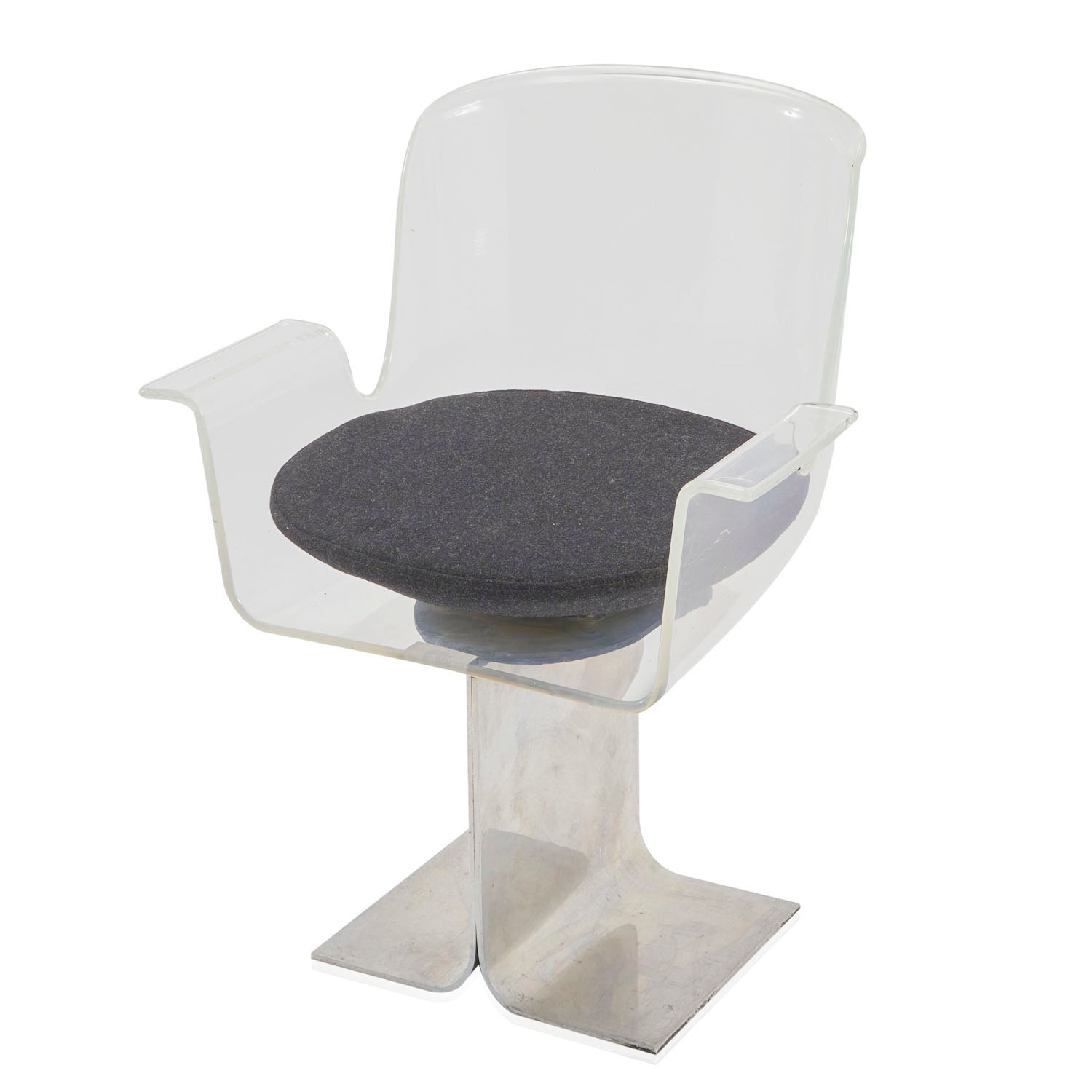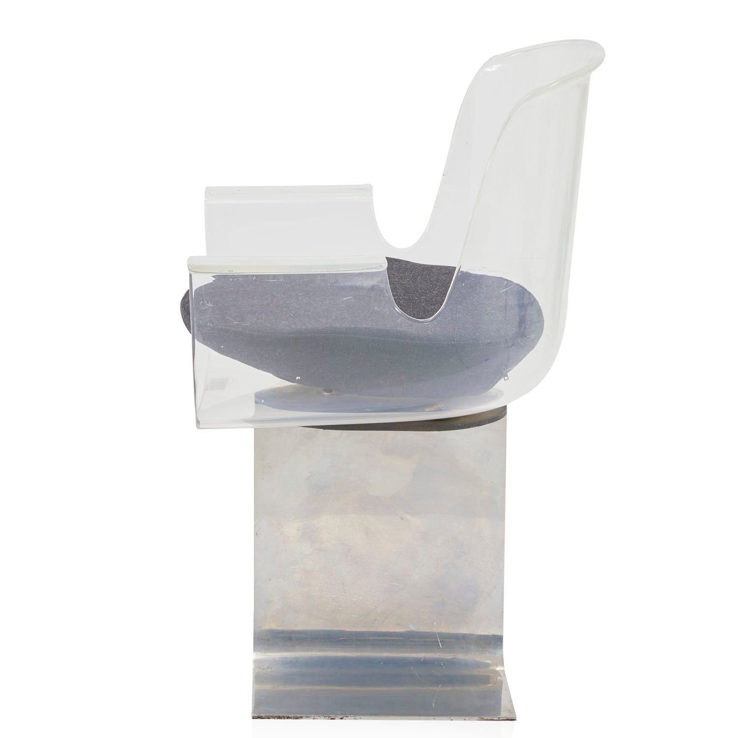 Details: Lucite chair with wing arms, dark grey circular cushion and chrome flared base Dimensions: 32" H x 24" W x 18" D Quantity :...