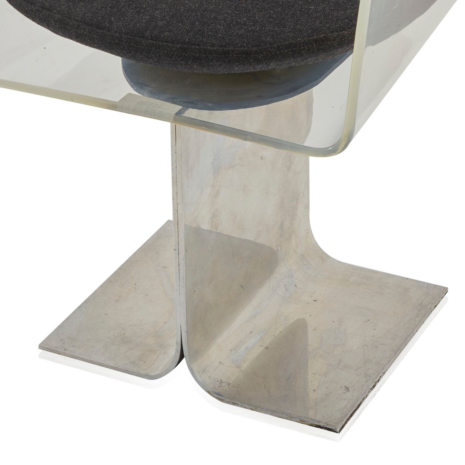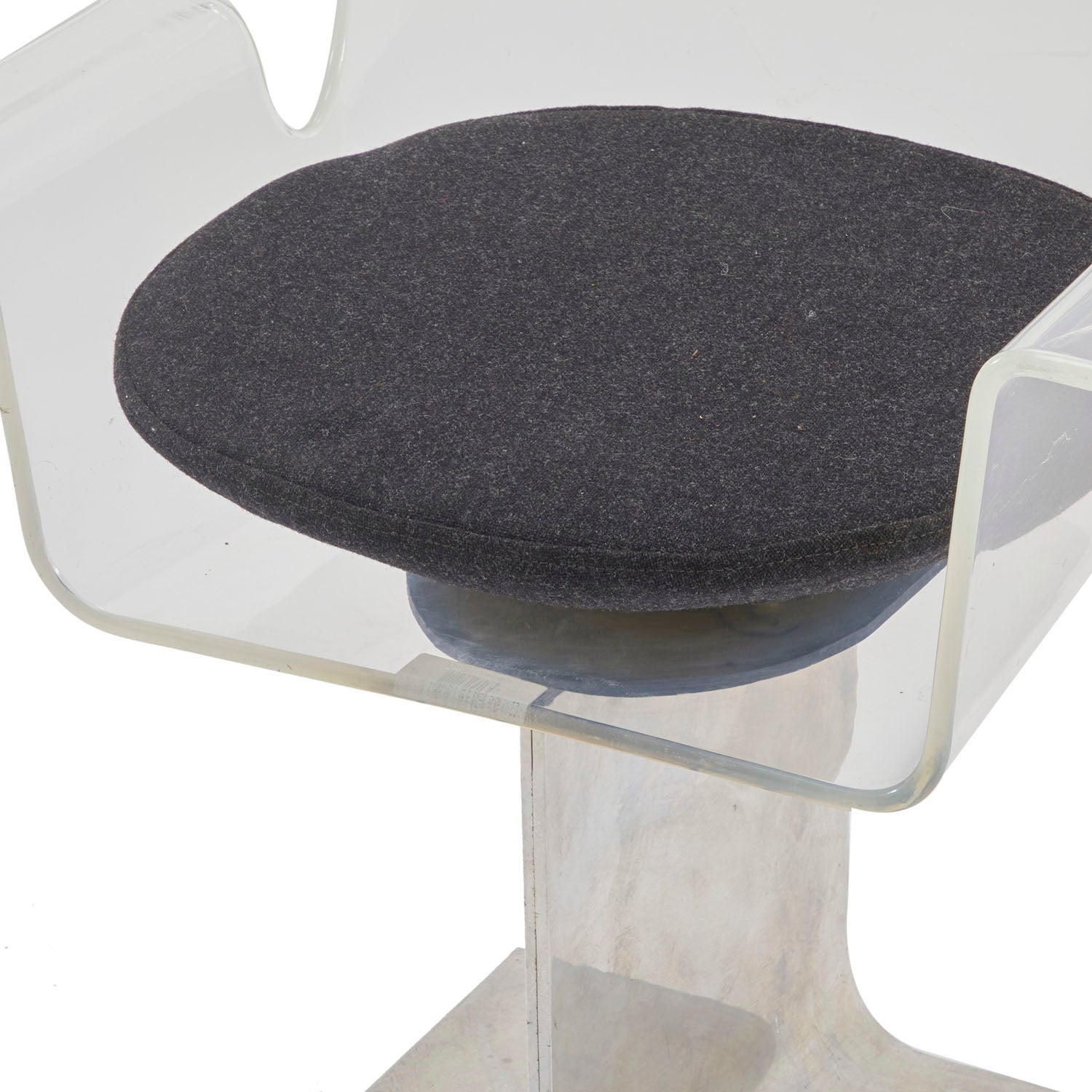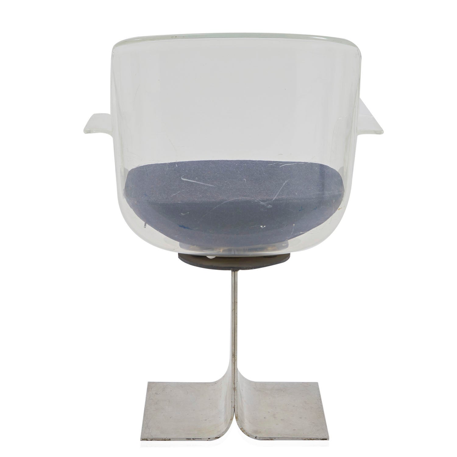 Details: Lucite chair with wing arms, dark grey circular cushion and chrome flared base Dimensions: 32" H x 24" W x 18" D Quantity :...