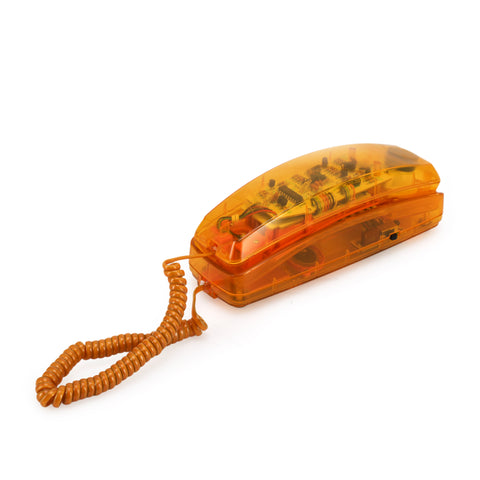 Details: Vintage orange acrylic phone with transparent exterior and white numbers. Dimensions: 2.5" H x 9" W x 3" D