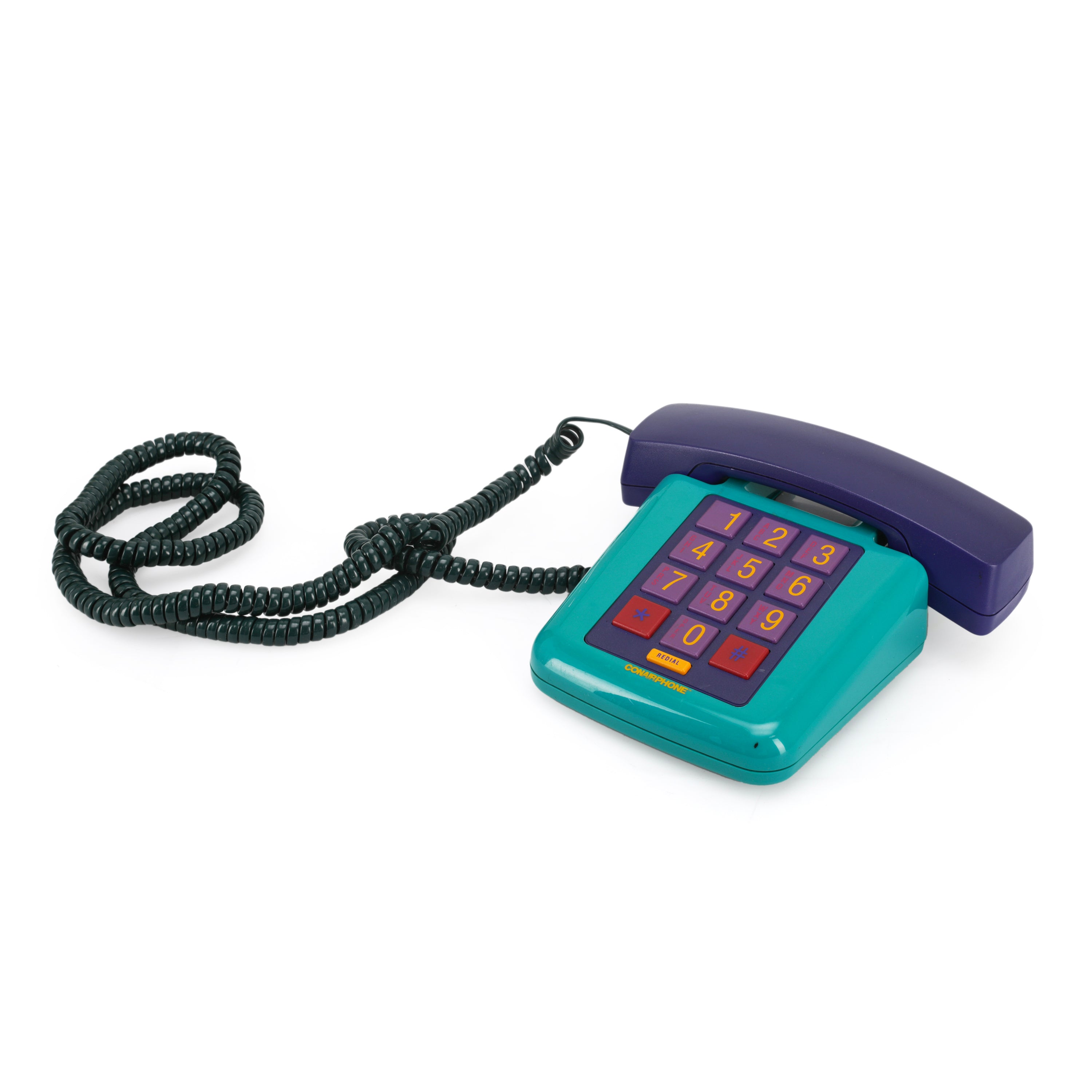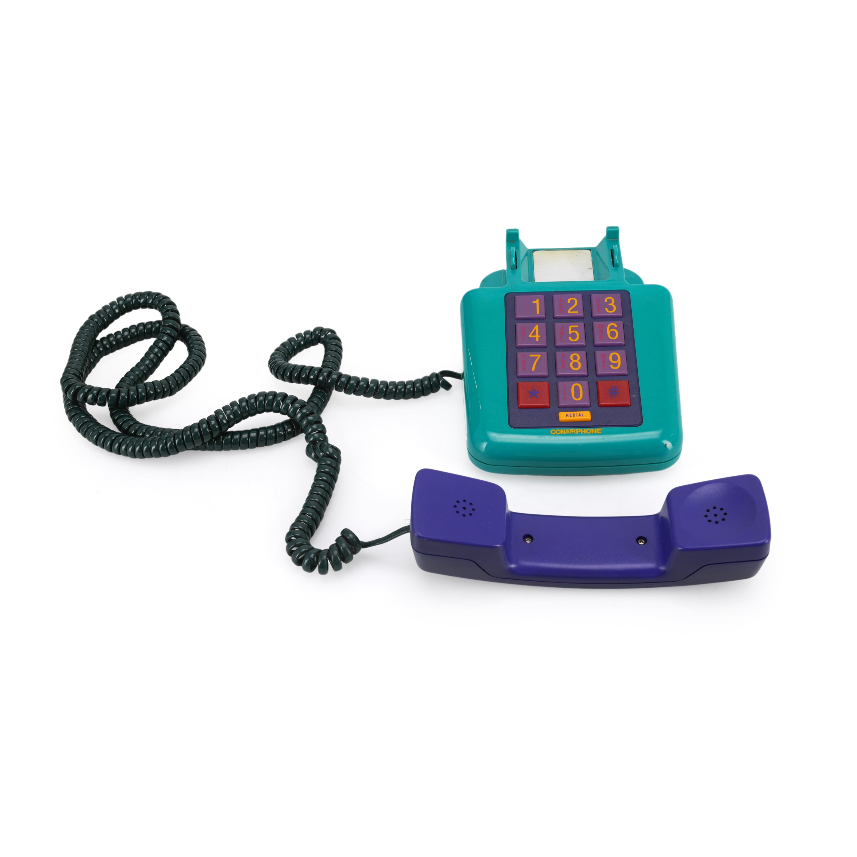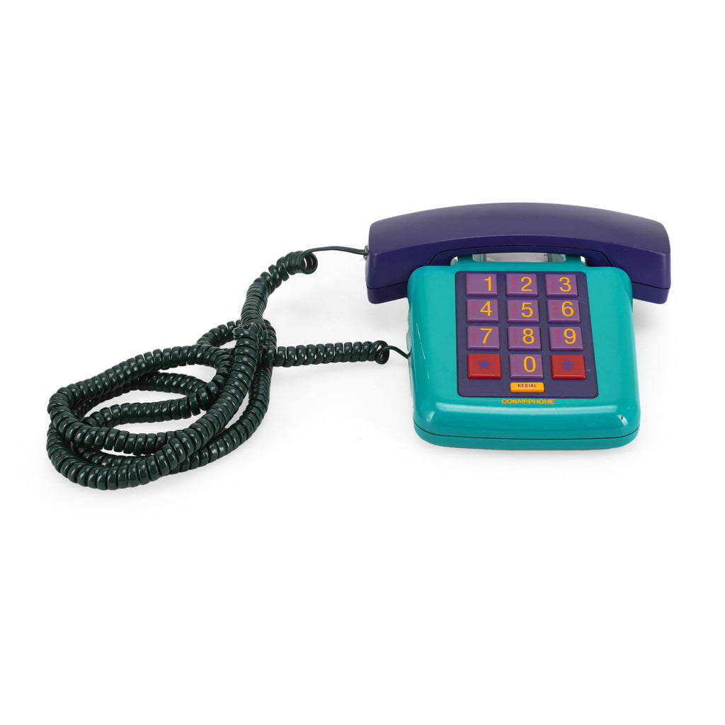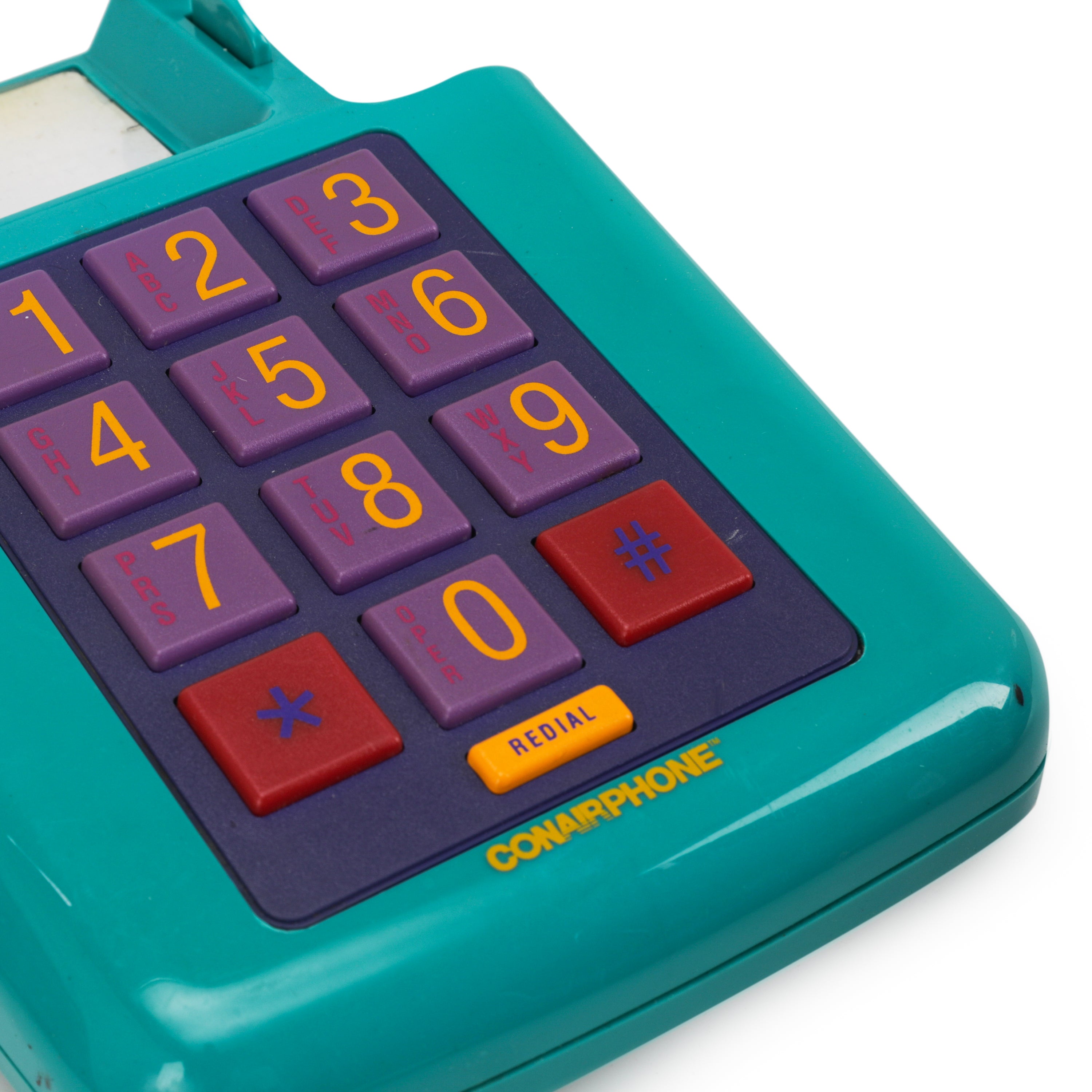 Details: Multi-color corded telephone from the 90's made by Conair. Dimensions: 3" H x 8" W x 8" D