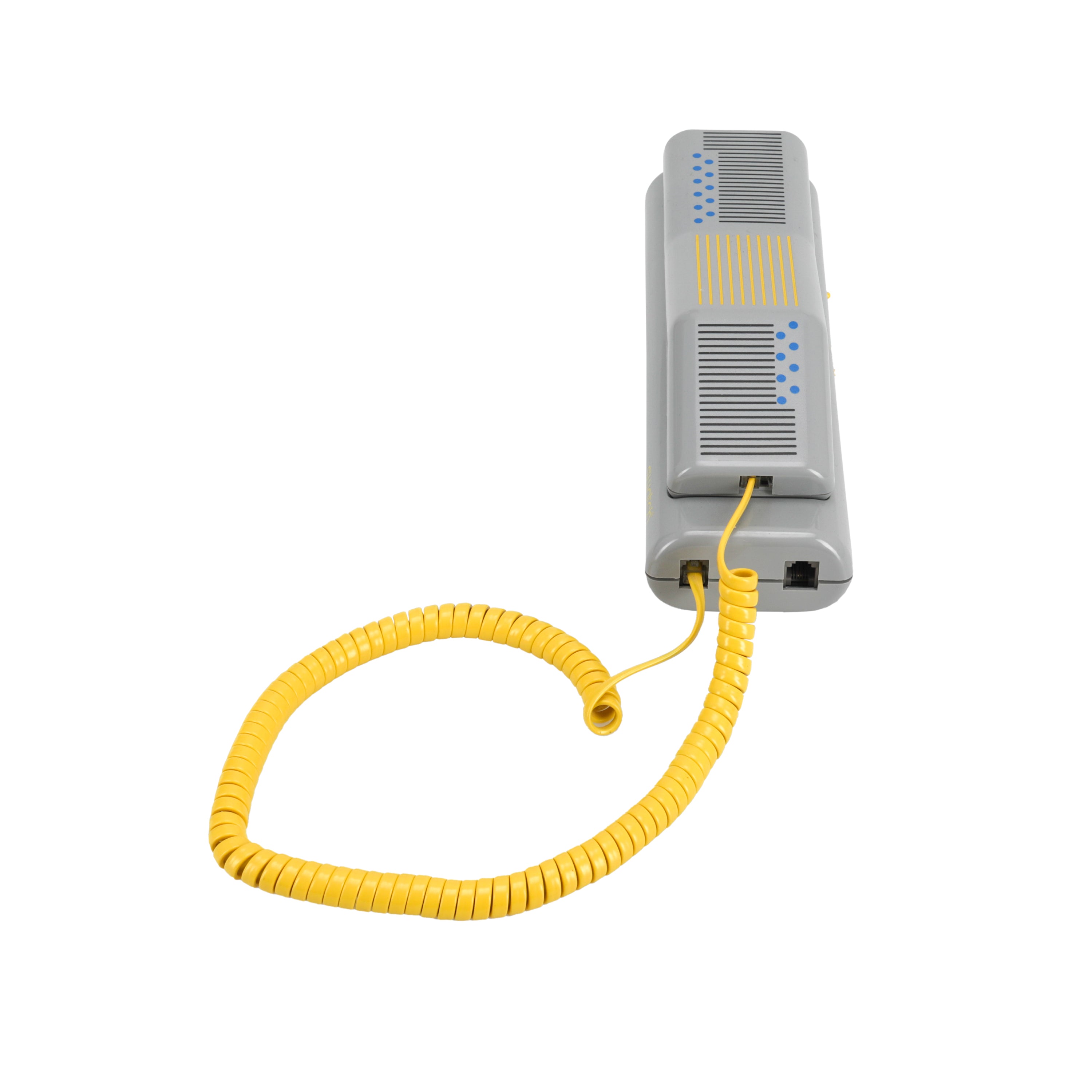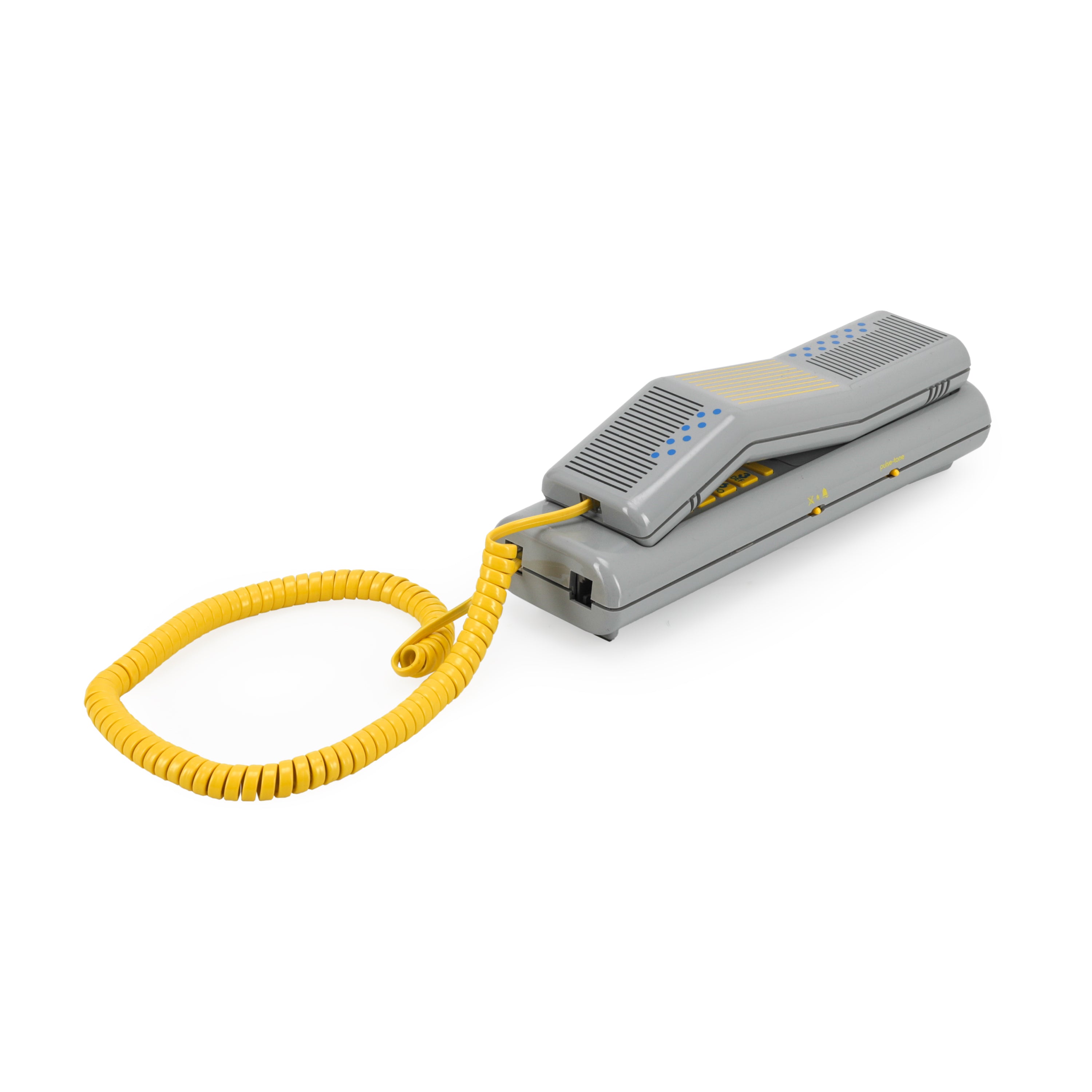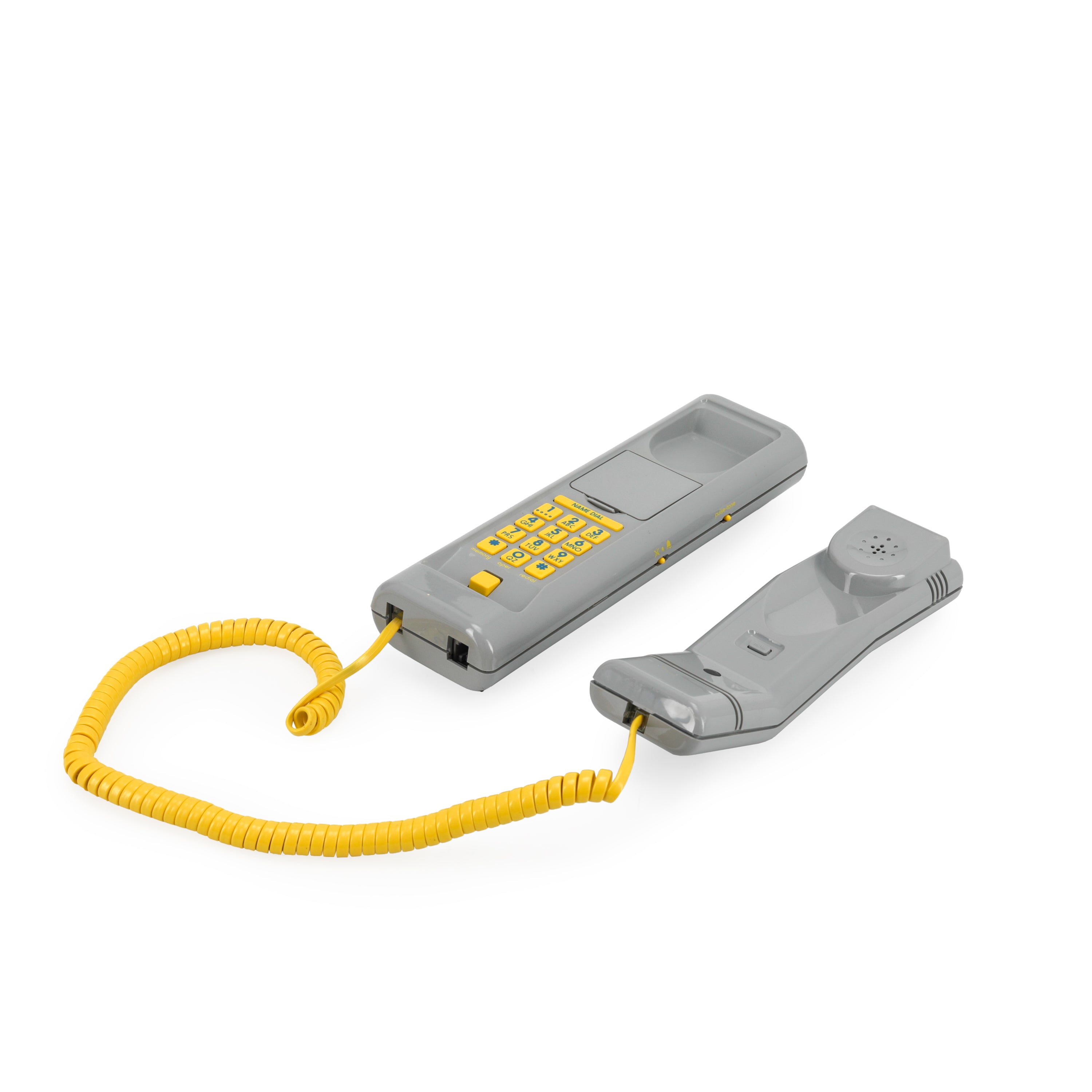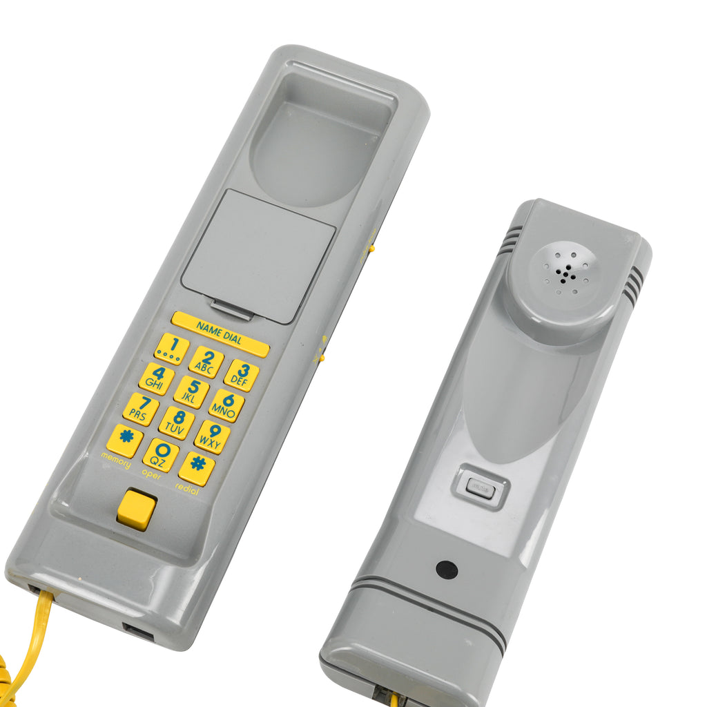 Details: Swatch telephone with angled receiver / shoulder rest. Yellow buttons and cord. Dimensions: 3.25" H x 9.5" L x 3" W