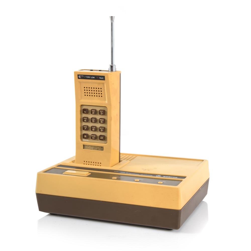Details: Beige colored vintage cordless phone with brown base Dimensions: 8.5" H x 8.5" W x 6.5" D