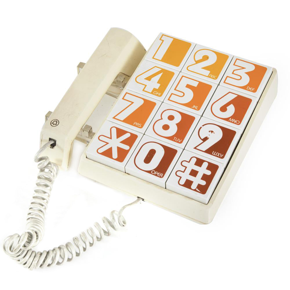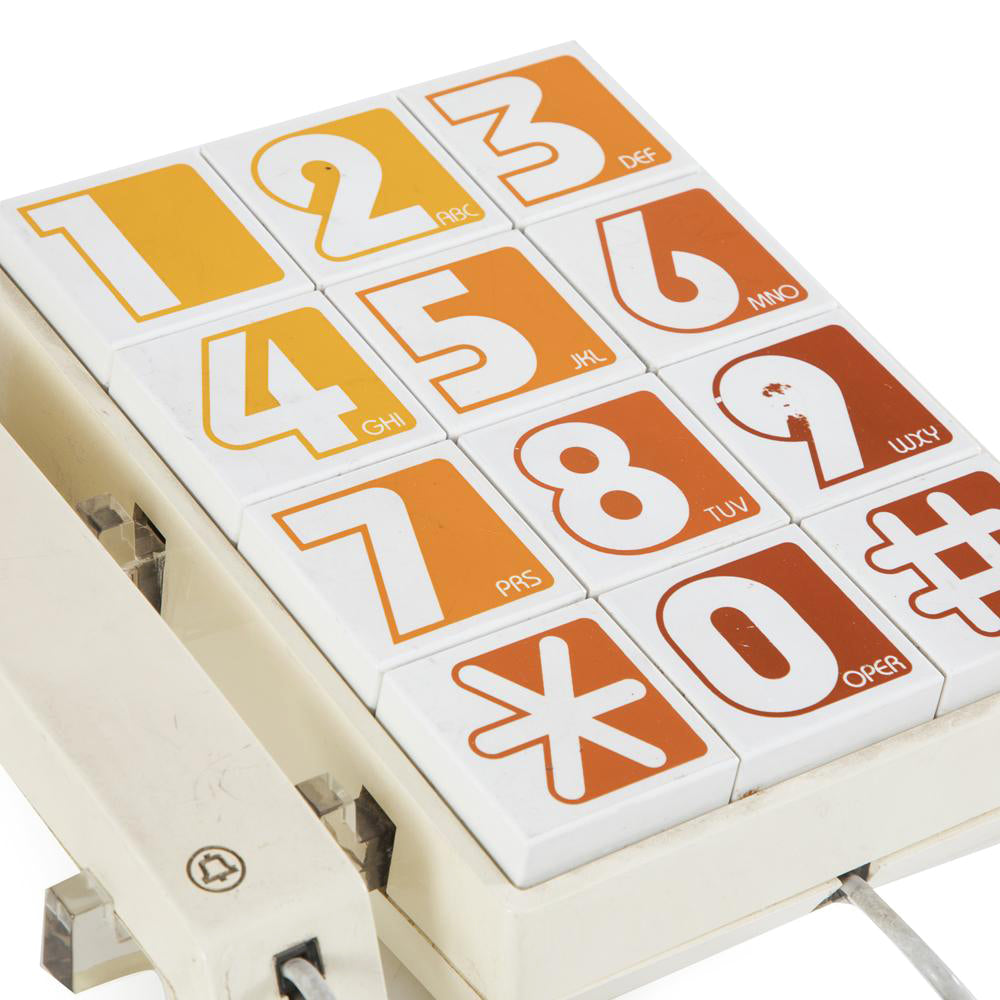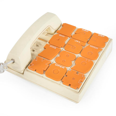 Details: Off-white vintage Western Electric phone with oversized orange-brown gradient buttons Dimensions: 3" H x 8" W x 8" D