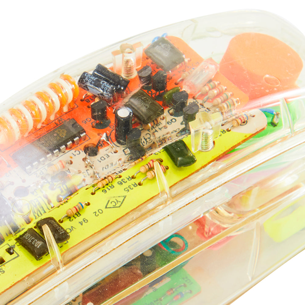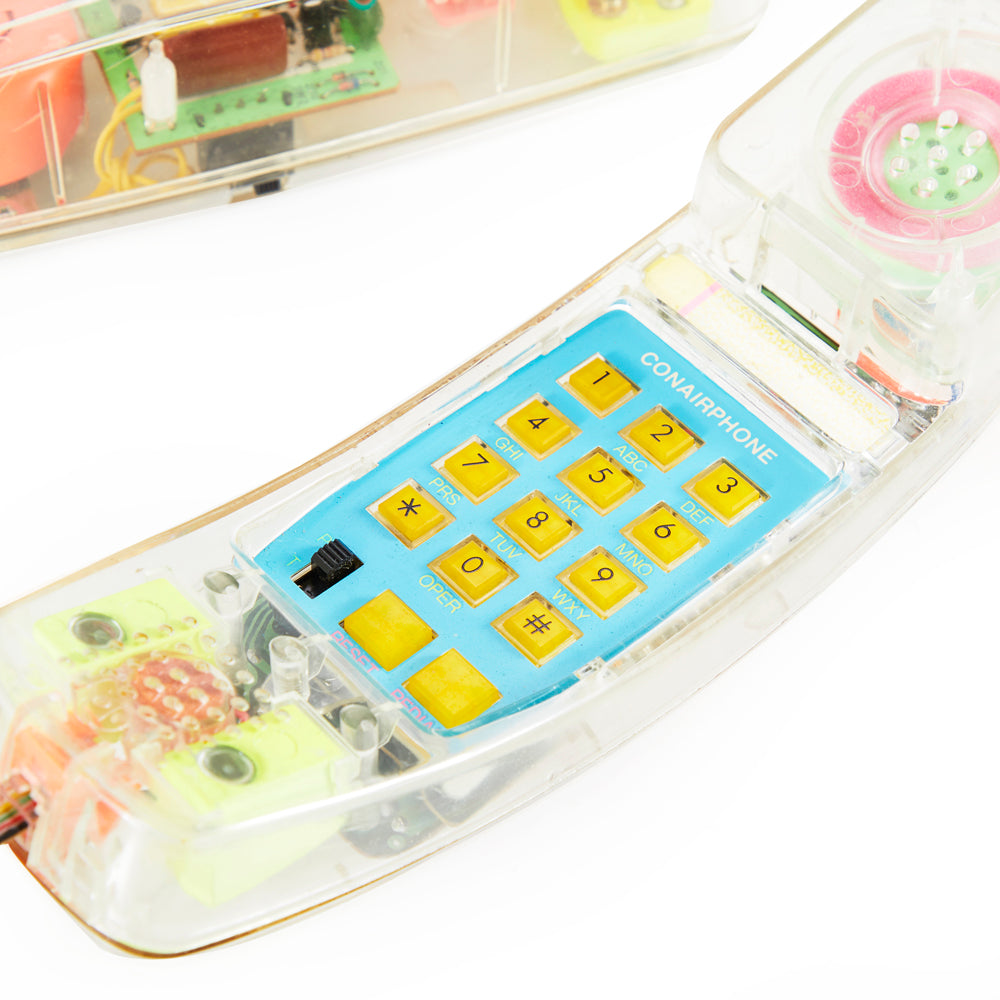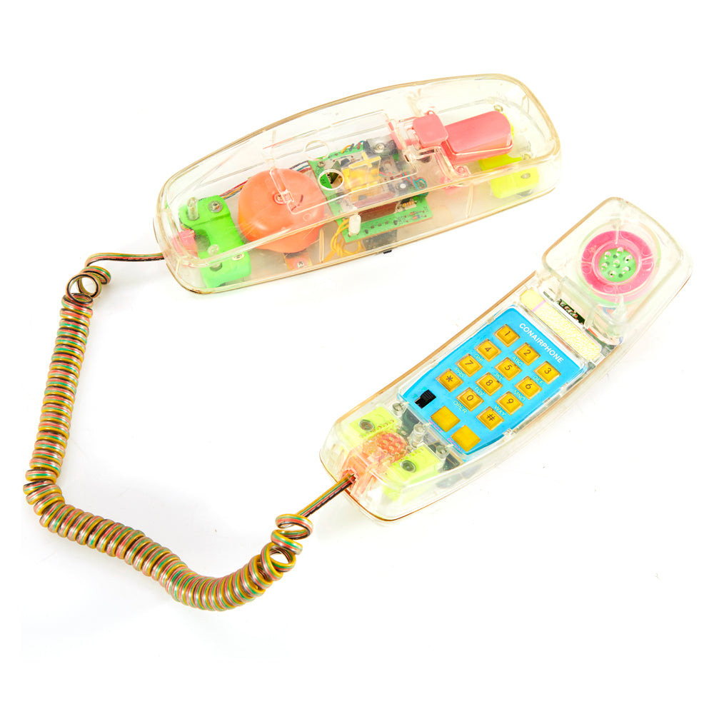 Details: Clear plastic push-button telephone with a visible interior of colorful wiring Dimensions: 6" H x 5.5" W x 9" D
