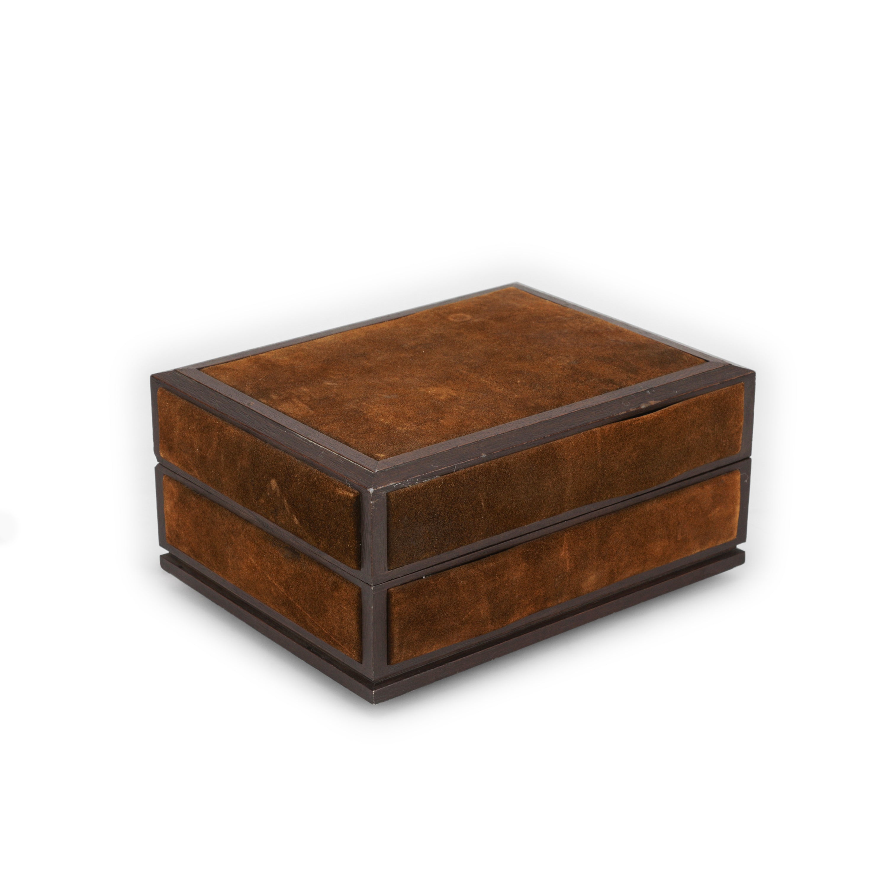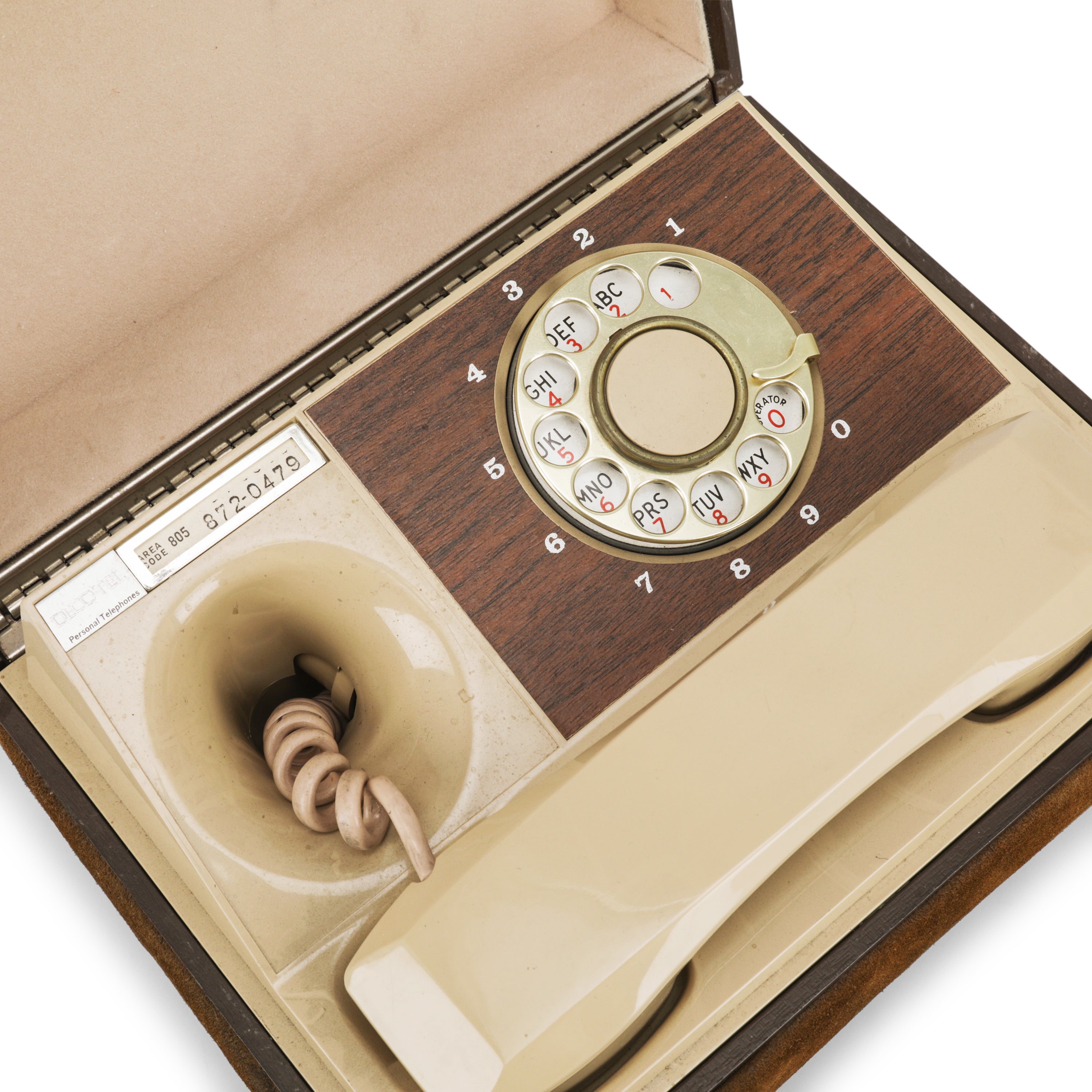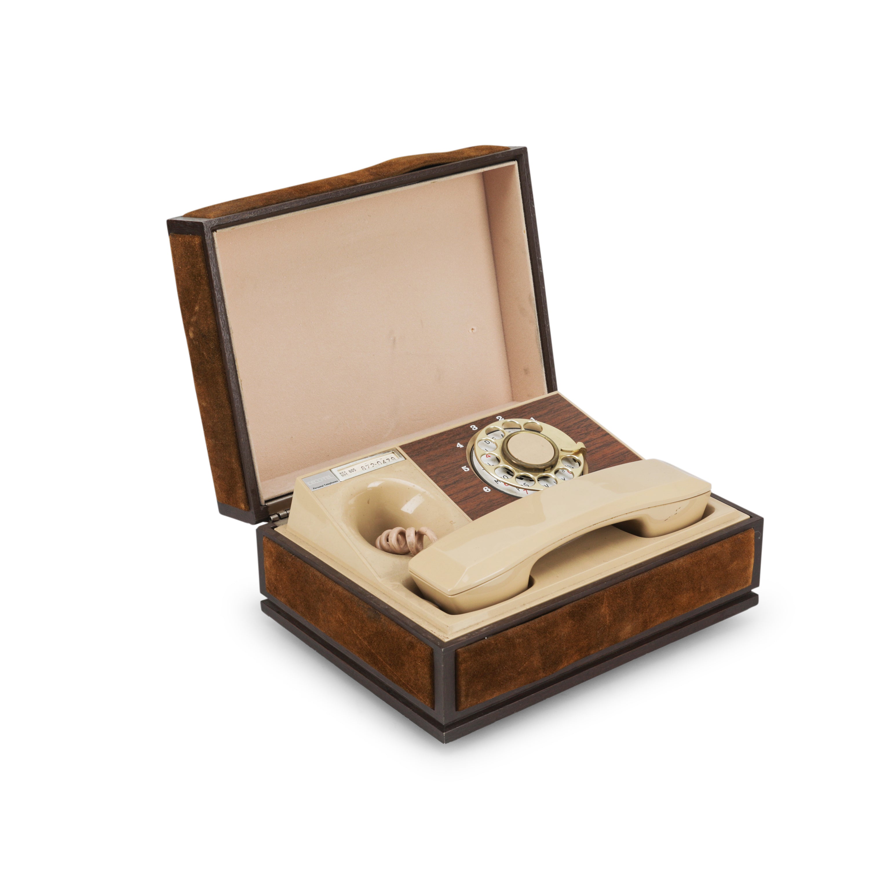 Details: Vintage telephone enclosed in a suede box Dimensions: 5" H x 10.5" W x 8" D