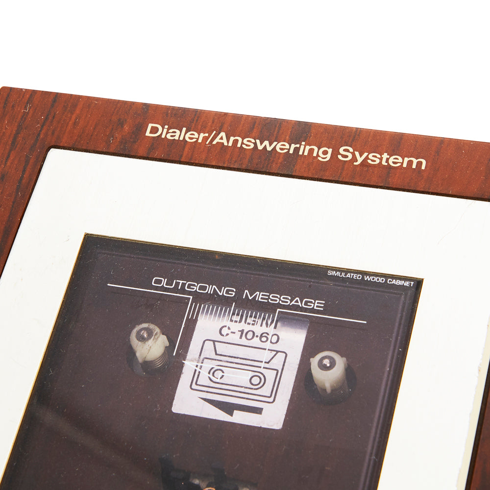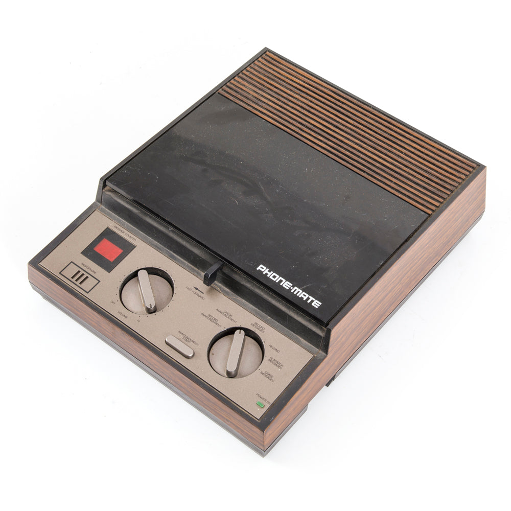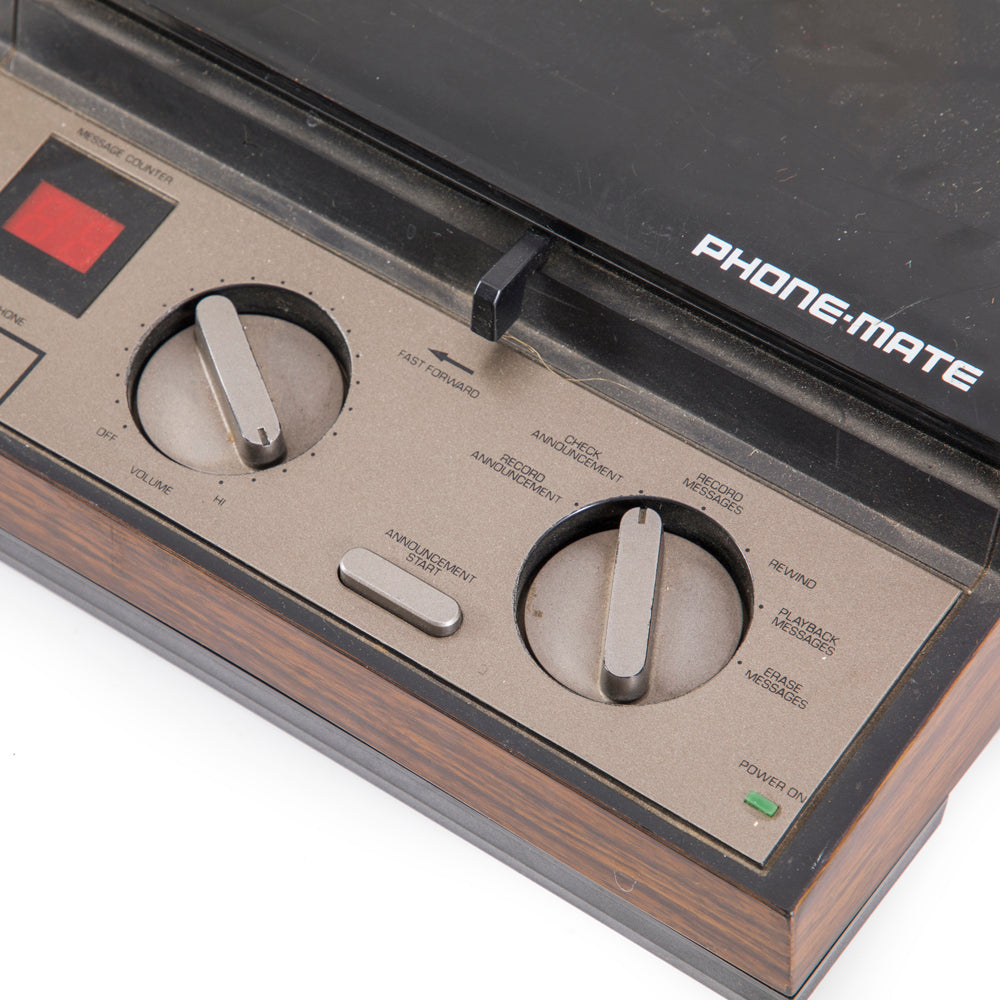 Details: Wood paneled Phone Mate answering machine with grey interface. Dimensions: 3" H x 9" W x 11" D Quantity: 1