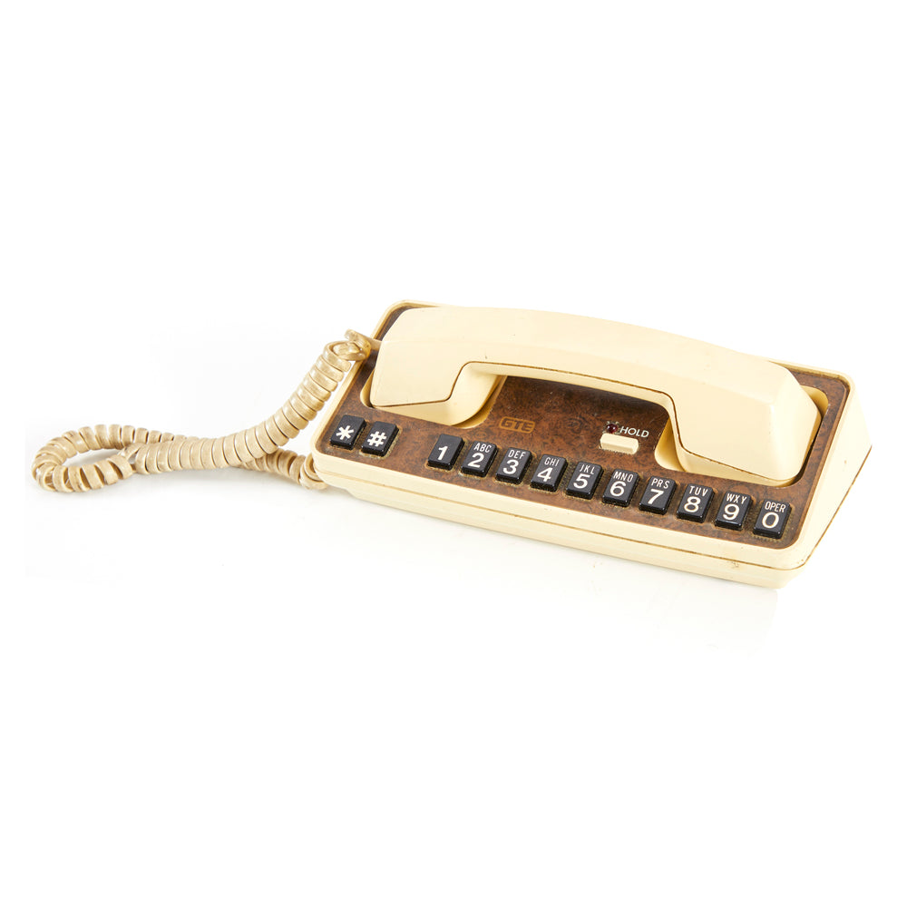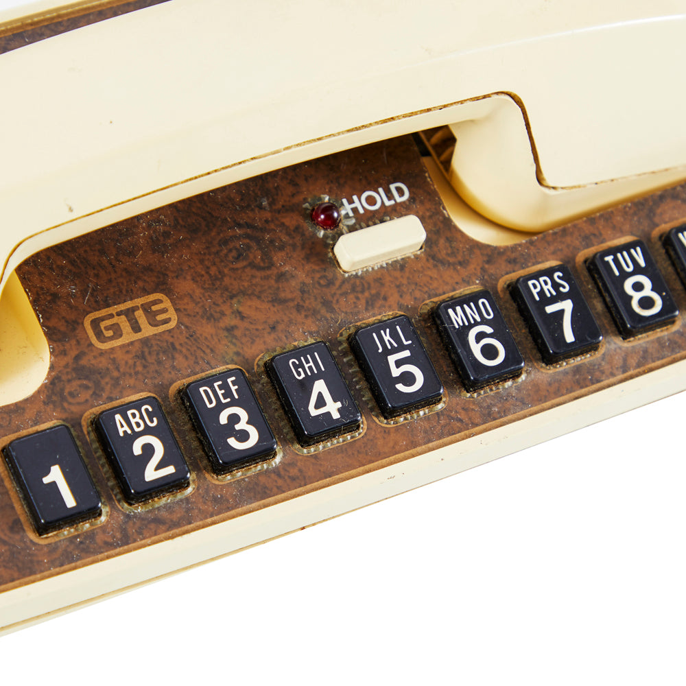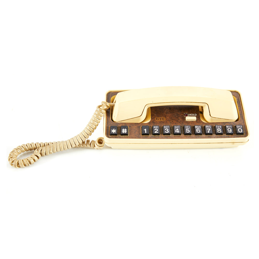 Details: Beige faux wood vintage telephone Dimensions: 3" H x 8" W x 10" D Quantity: 1