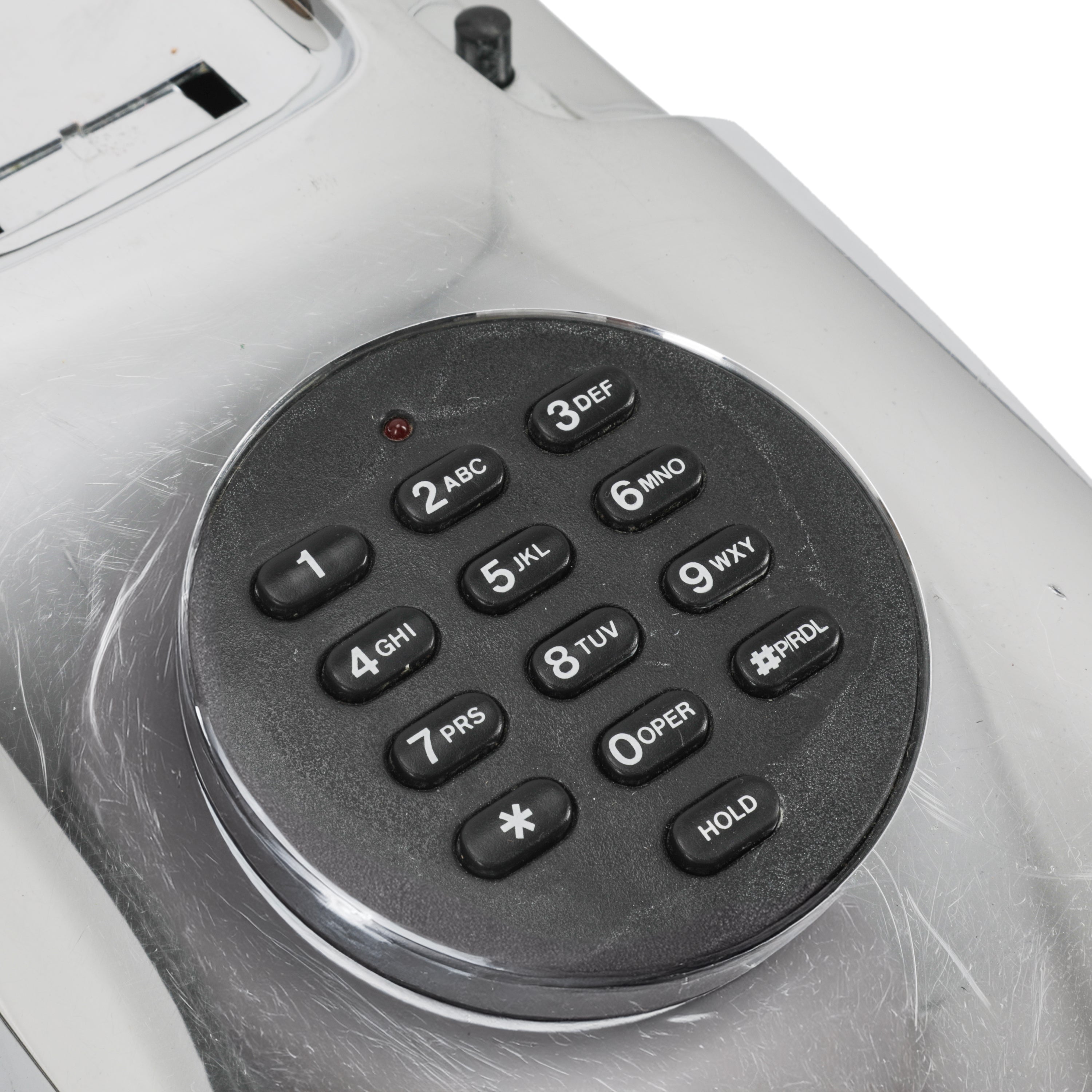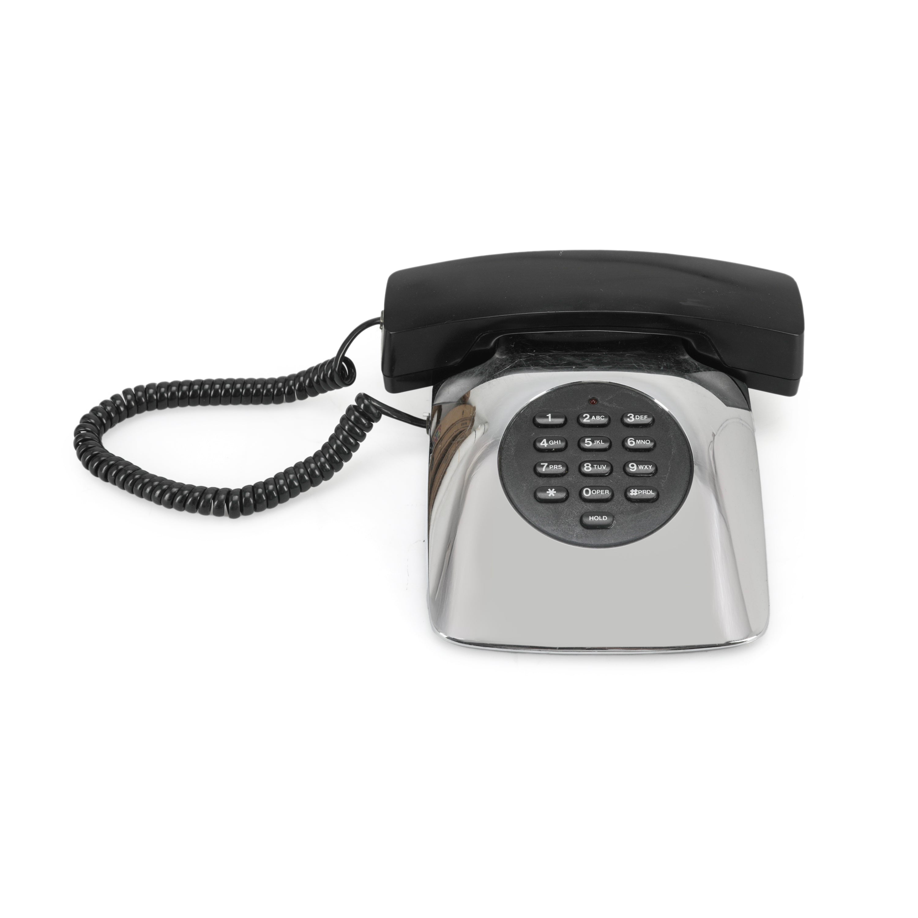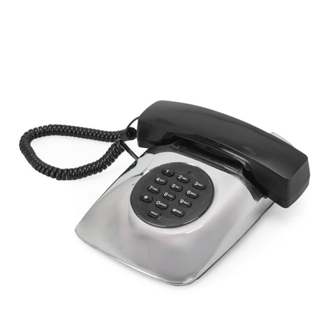 Details: Vintage corded phone with reflective chrome base and black buttons / receiver. Dimensions: 2.5" H x 8" W x 9" D