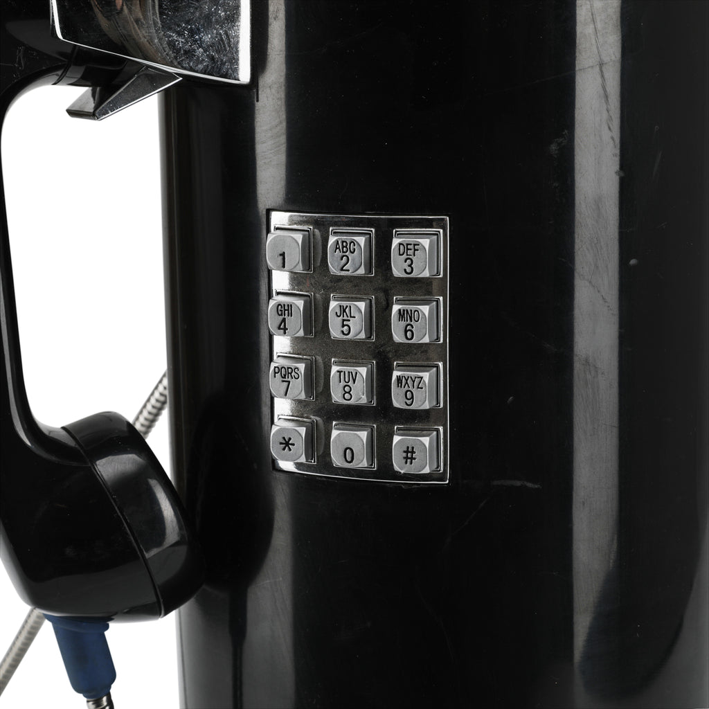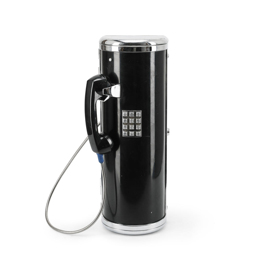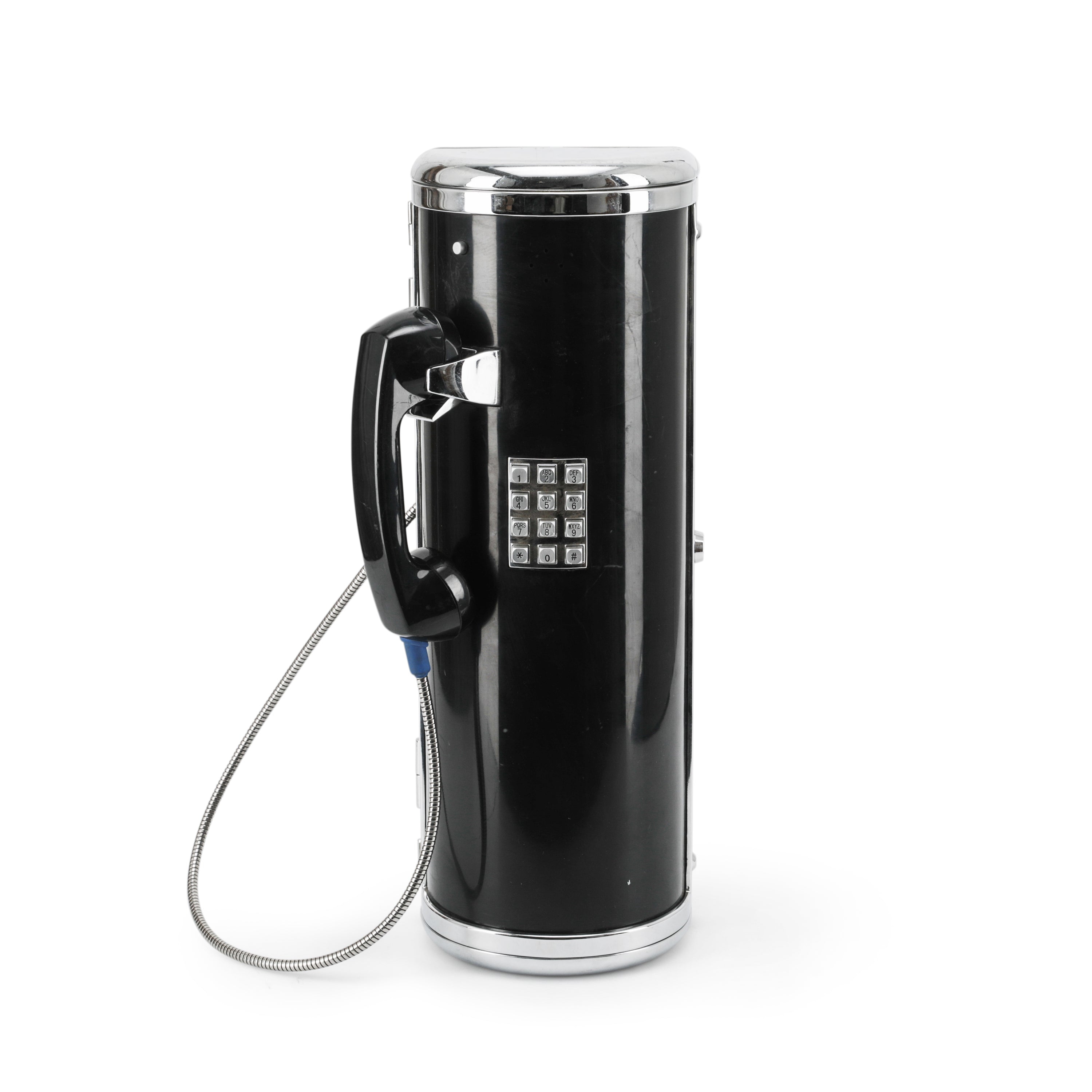 Details: Black cylinder phone with chrome details and wall mount. Dimensions: 20.5" H x 7" W x 6" D