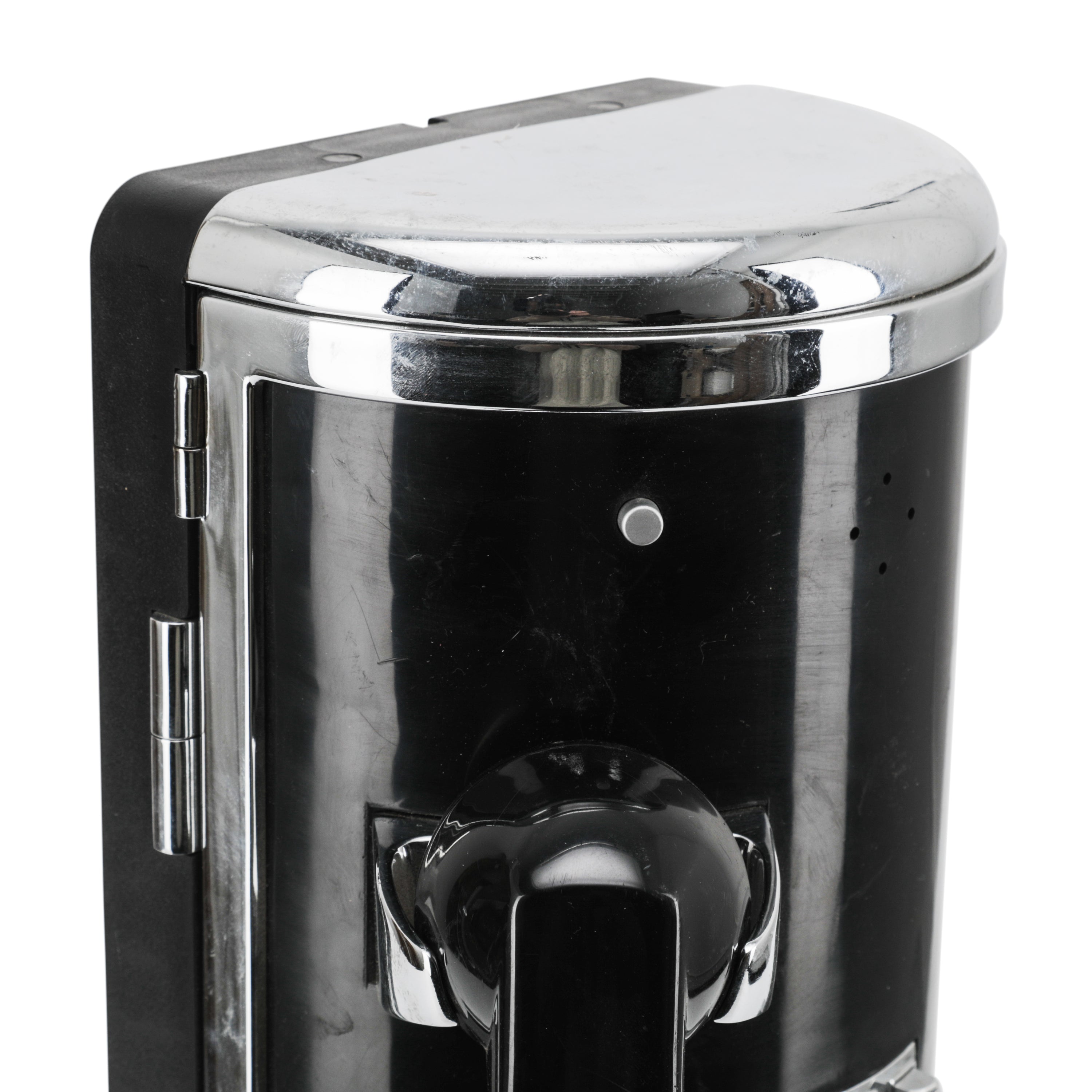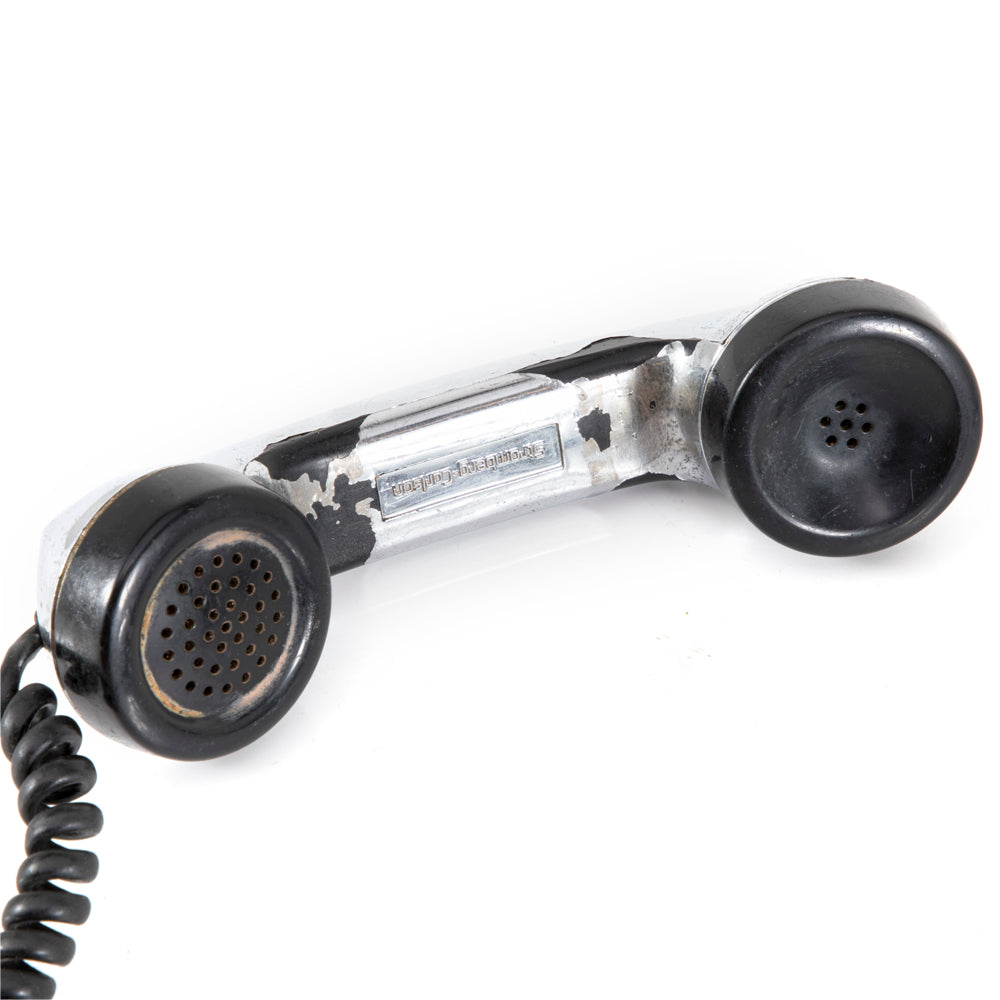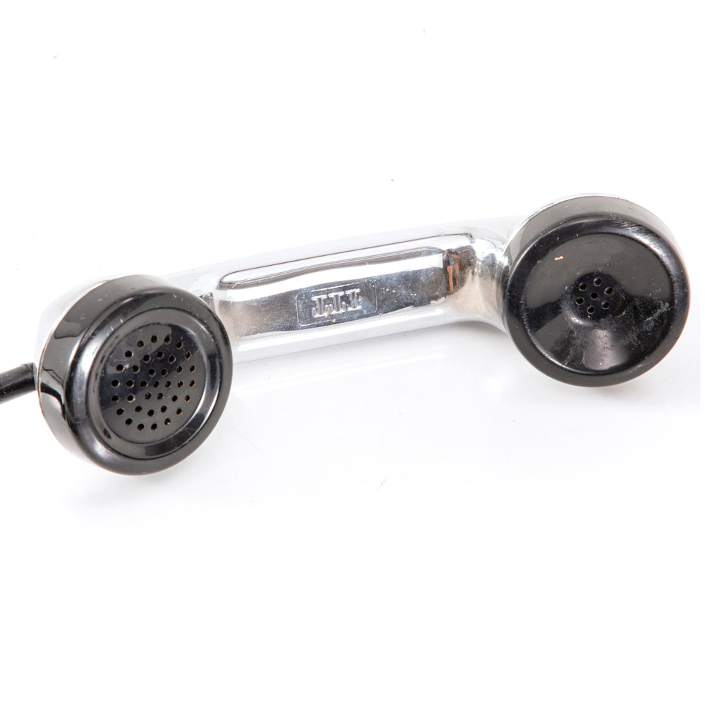 Details: Black cylinder phone with chrome details and wall mount. Dimensions: 20.5" H x 7" W x 6" D