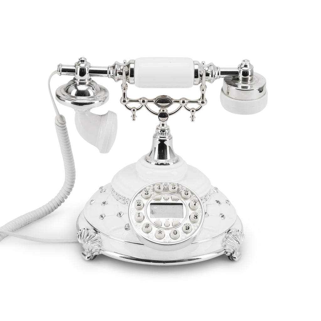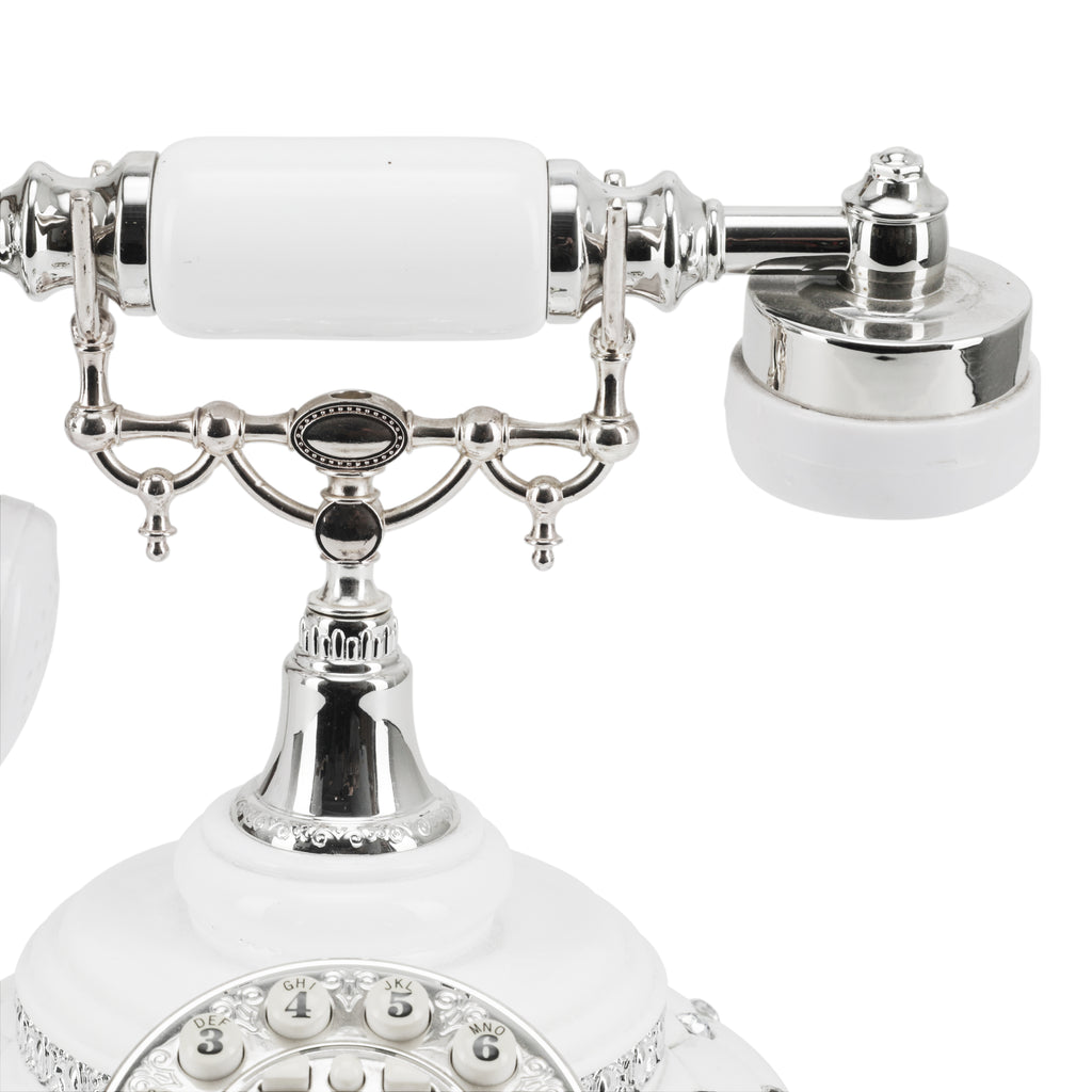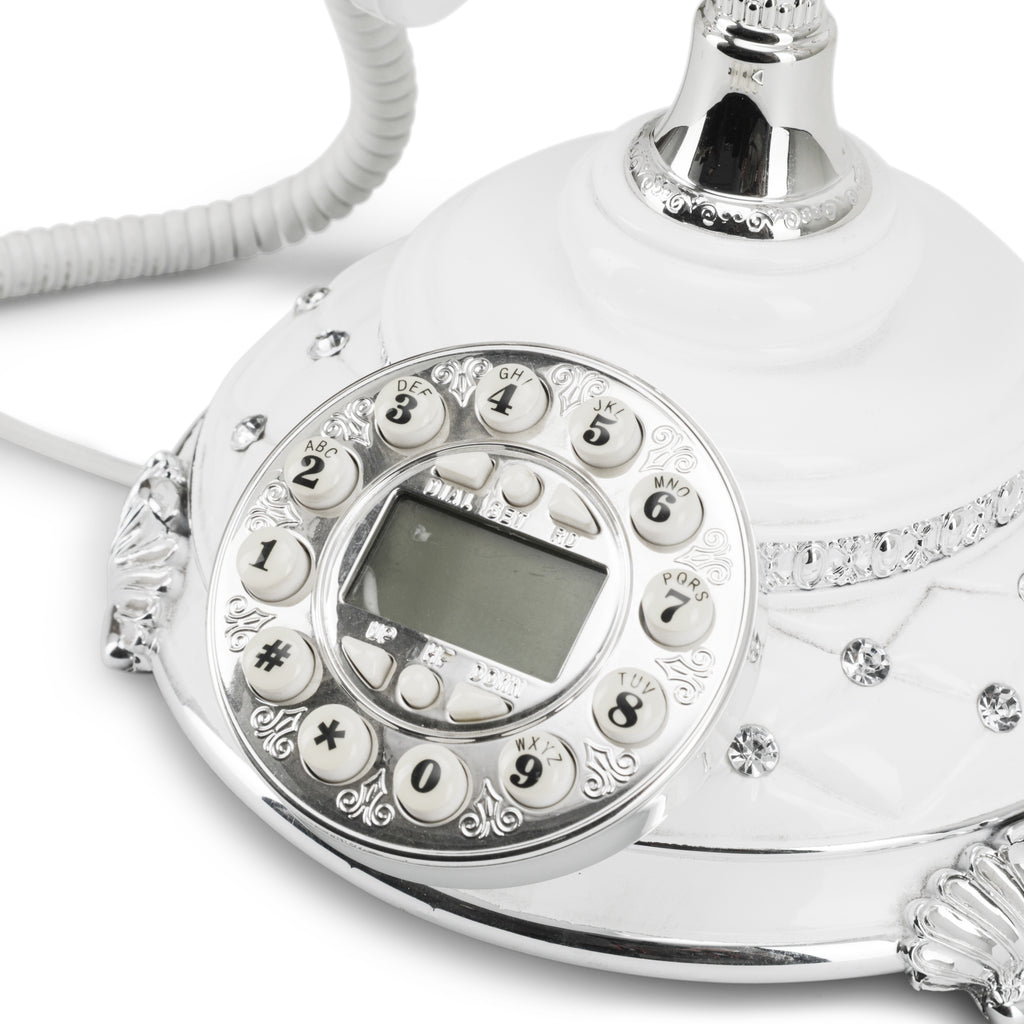 Details: White & chrome corded telephone with bejeweled details and clam shell feet. Rubberized buttons and grayscale screen. Dimensions: 10" H x 10" W x...