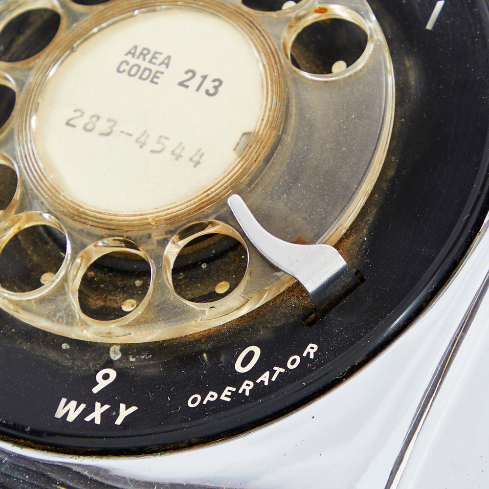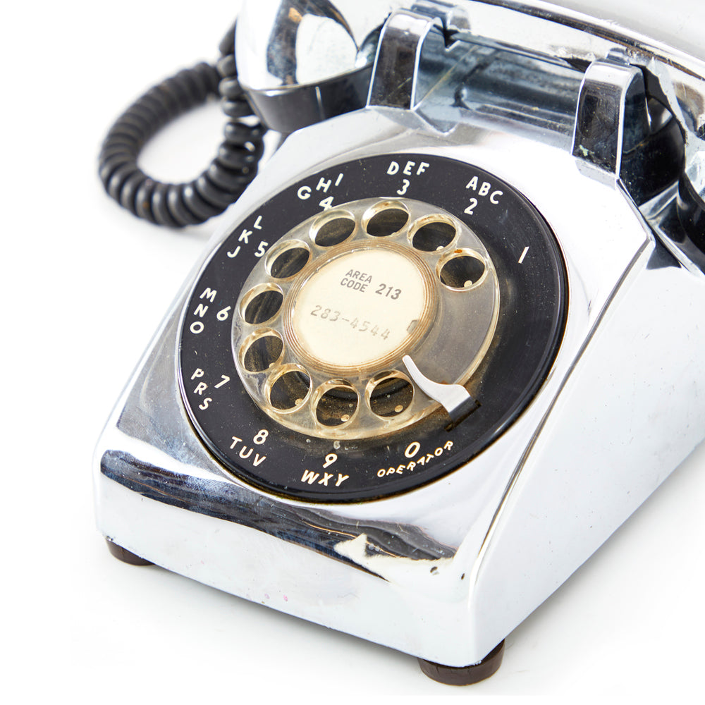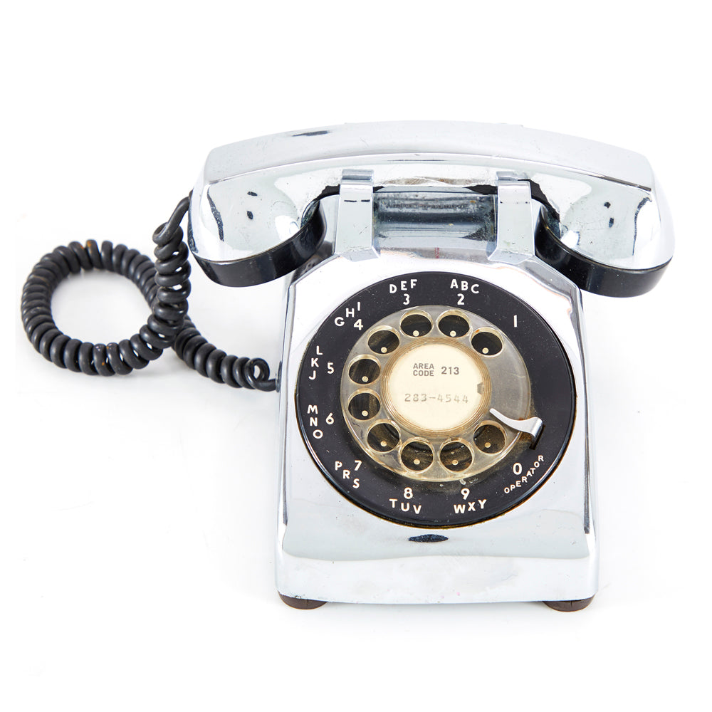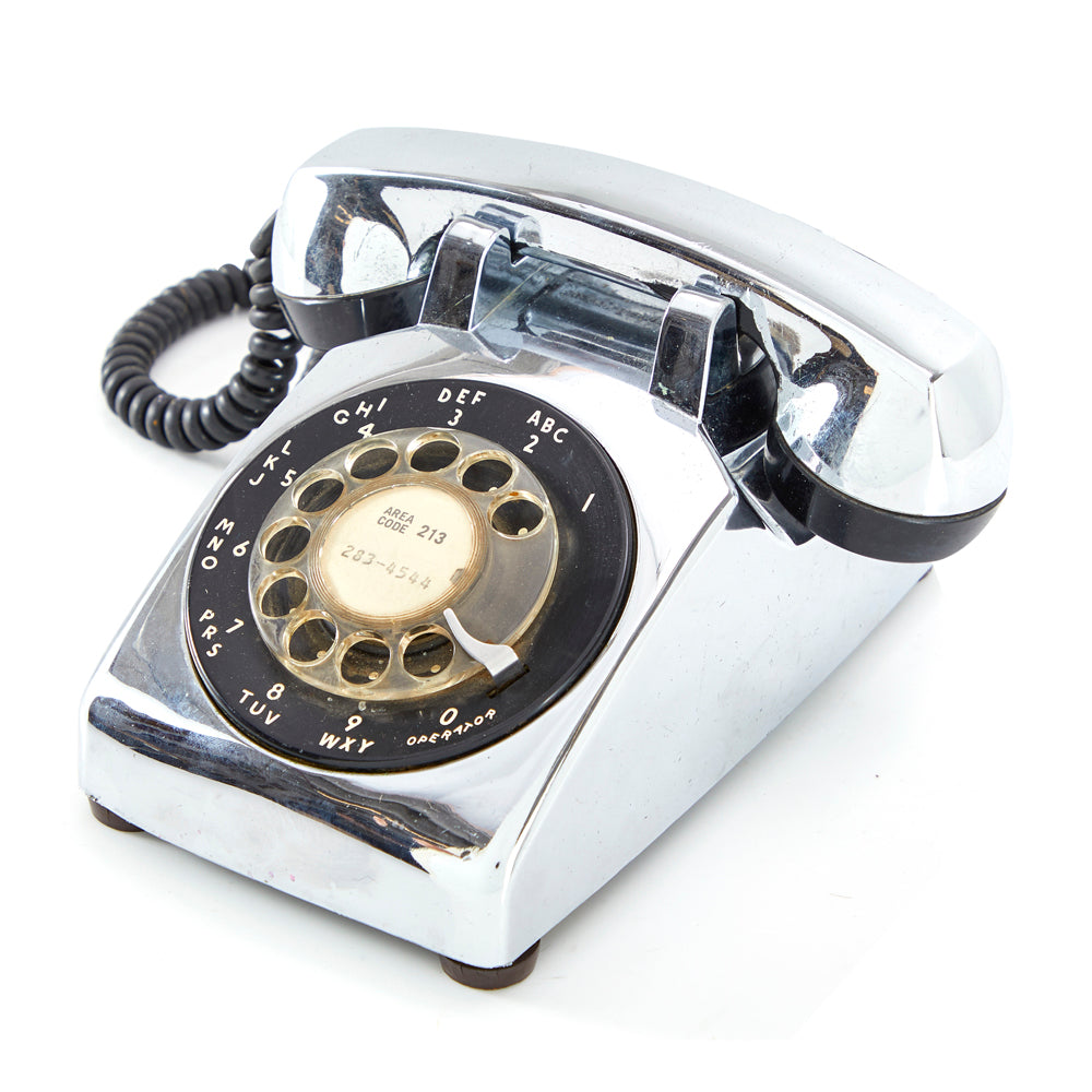 Details: Vintage chrome rotary phone with black accent Dimensions: 6.5" H x 8" W x 9" D Quantity: 1