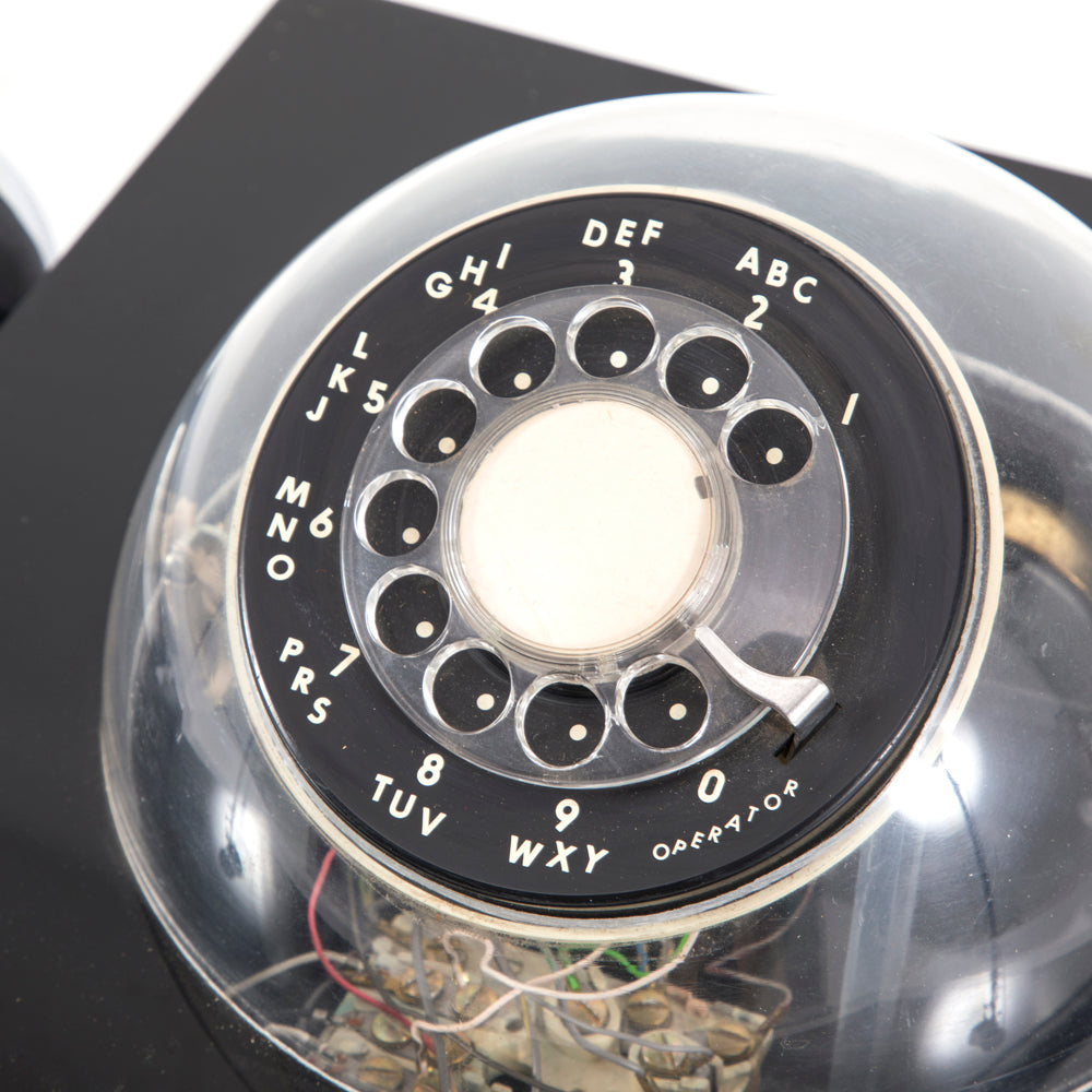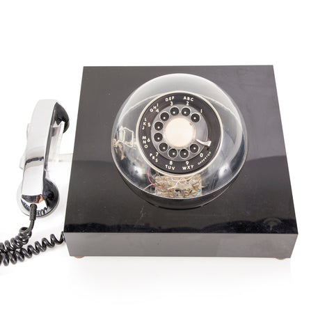 Details: Square black rotary phone with a clear plastic dome and chrome handset Dimensions: 7" H x 15" W x 12" D