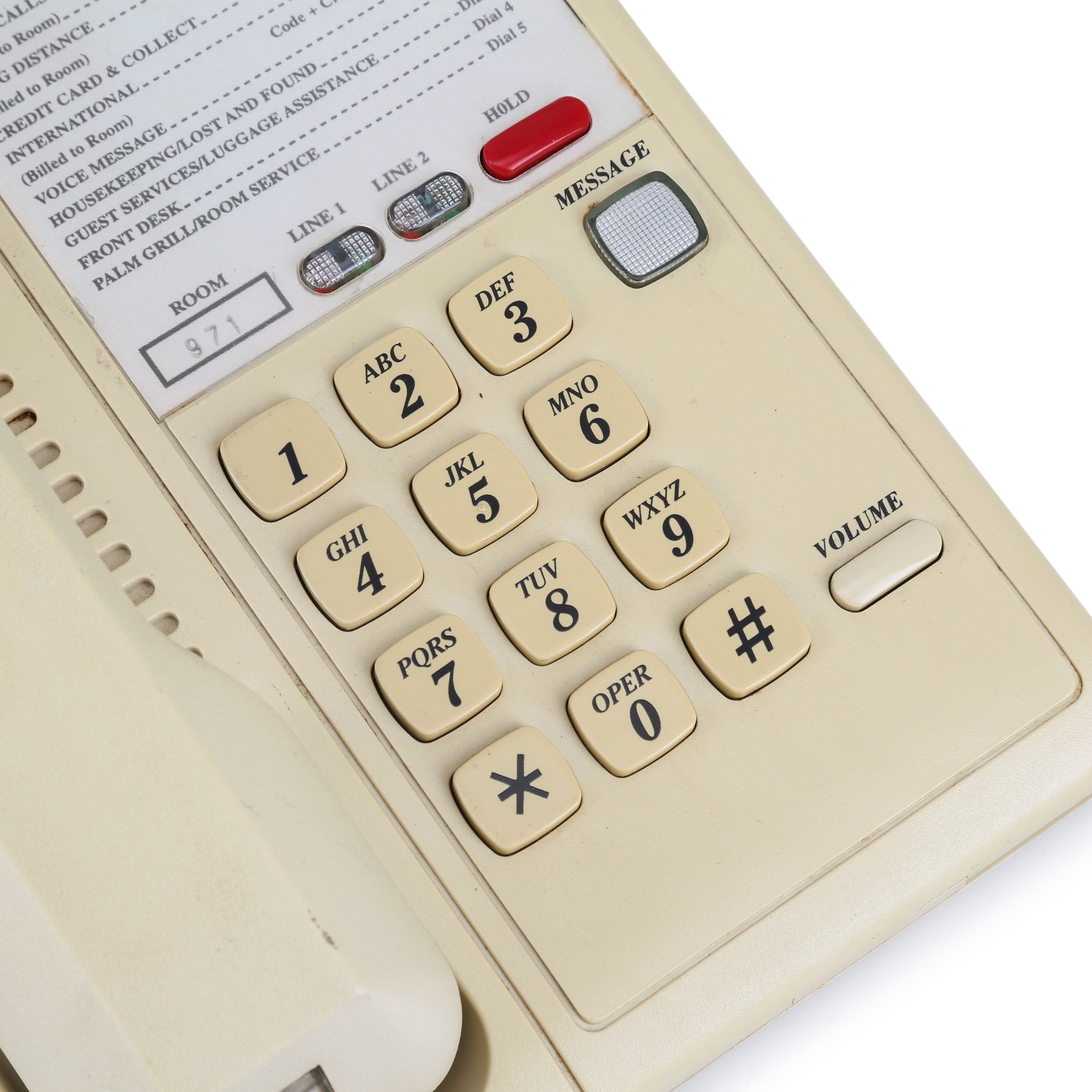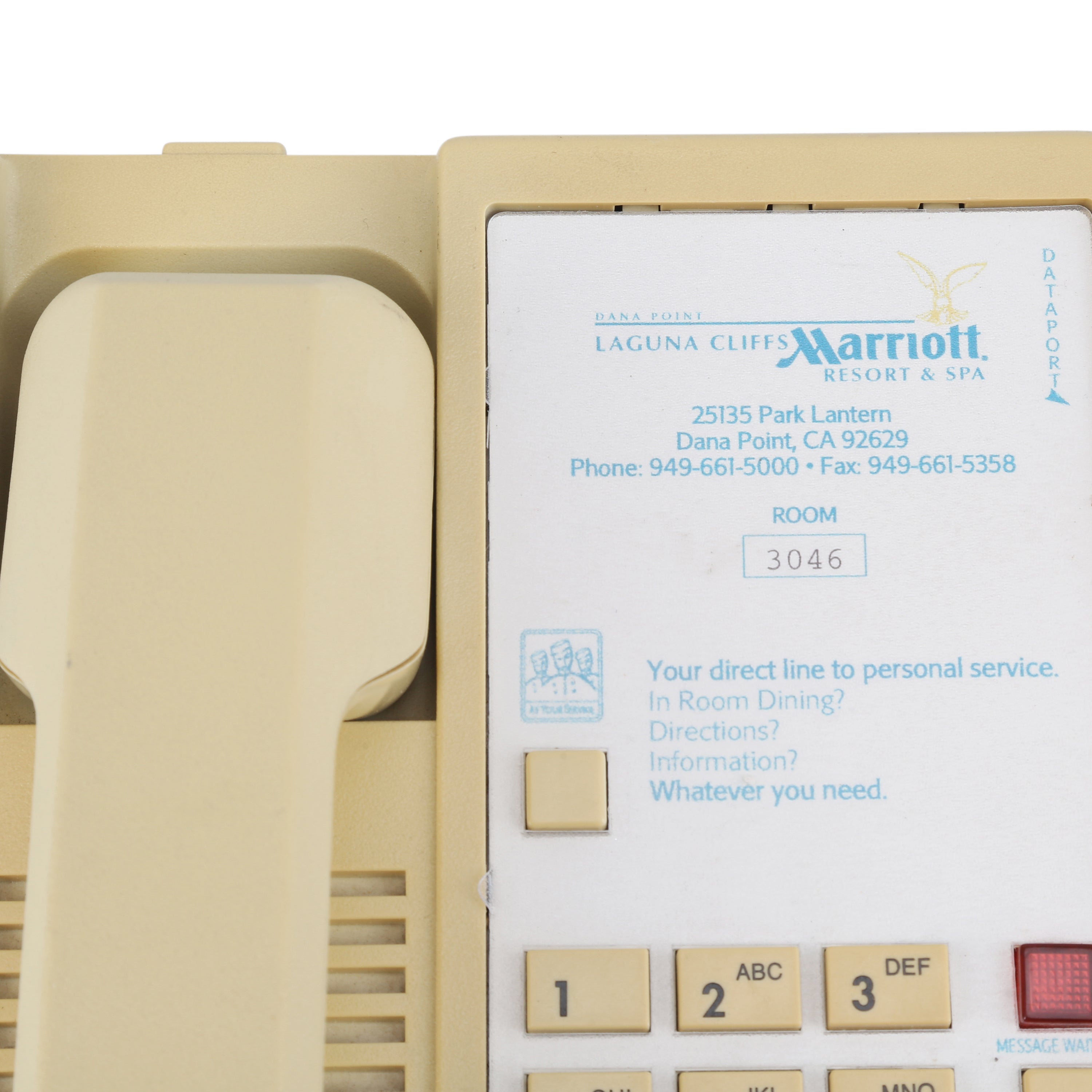 Details: Tan / cream hotel room telephone previously used by Marriott. Dimensions: 3" H x 10" W x 7" D